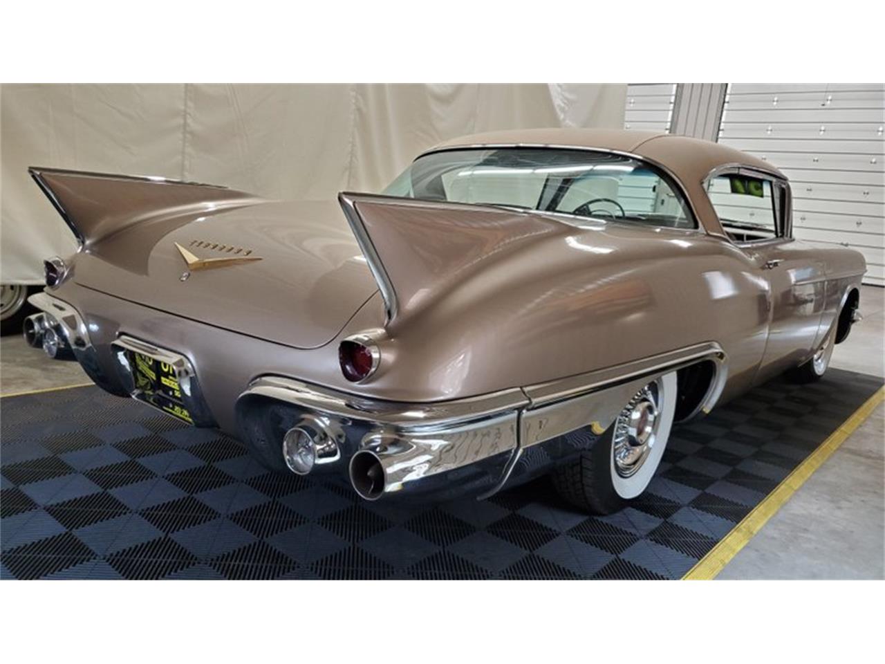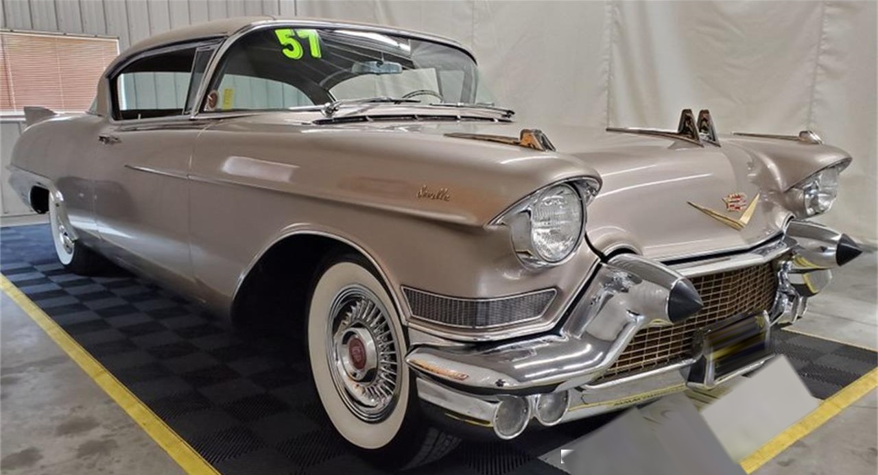 1957 Cadillac Eldorado Seville that is dressed in Desert Tan with matching tan cloth top. Chrome and brighwork in excellent condition and really looks great against the paint. This car was very well equipped with power steering, power brakes, and air conditioning. A C has been converted as well. Riding on wide whites with chrome Cadillac wheels. Powered by a 365 V8 under the hood that is paired with an automatic transmission. Interior is tan to match and is in excellent condition.
