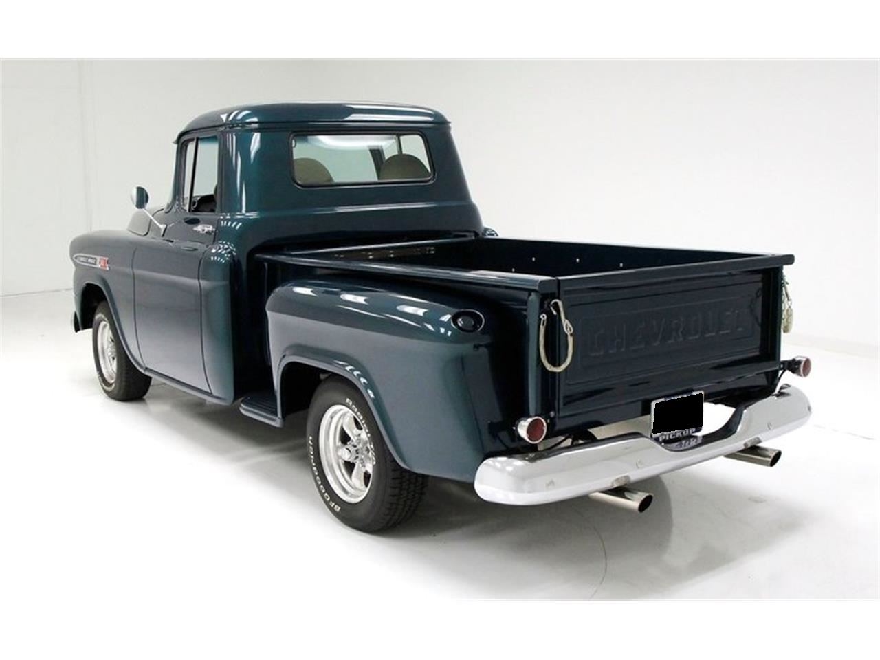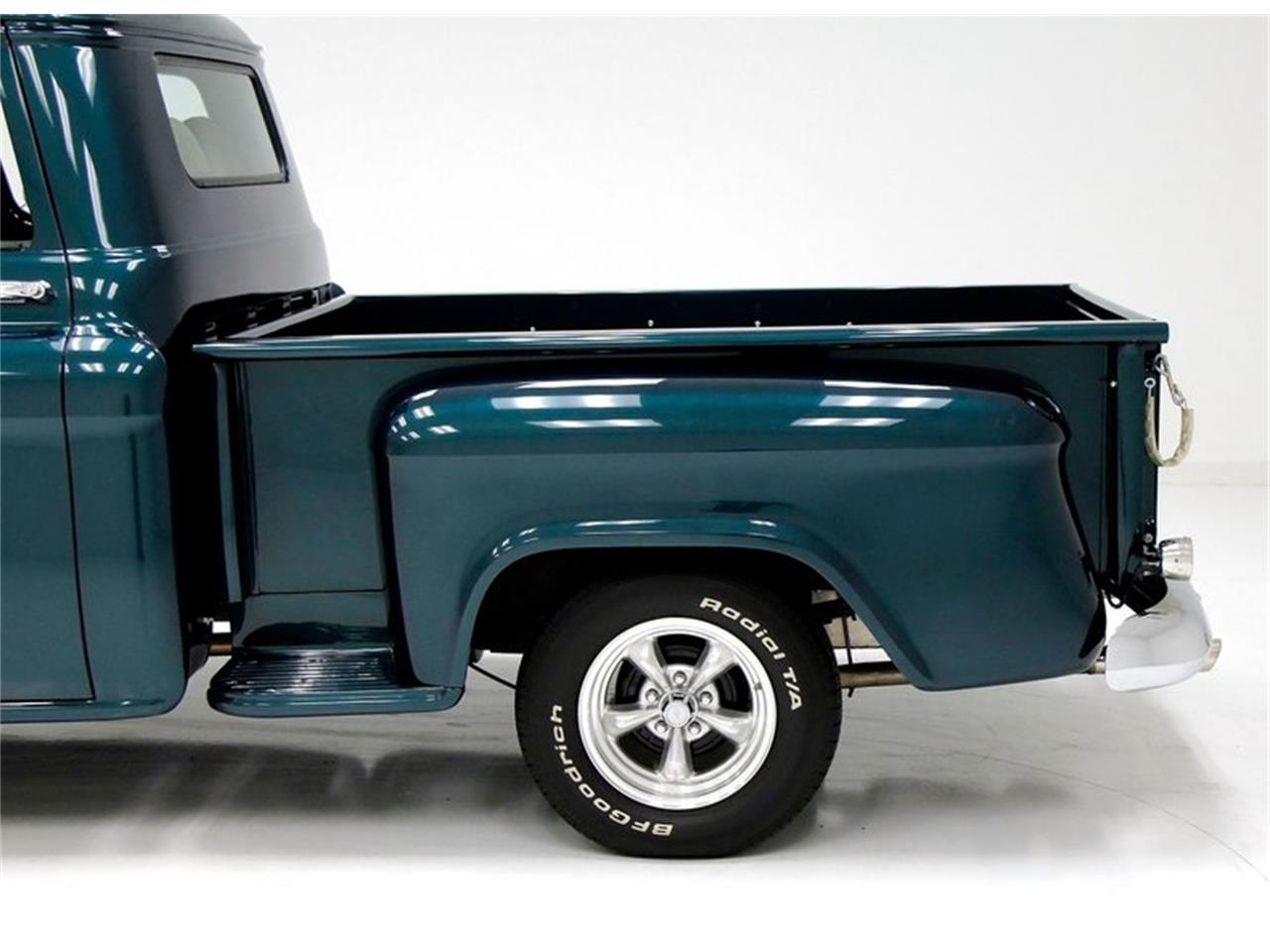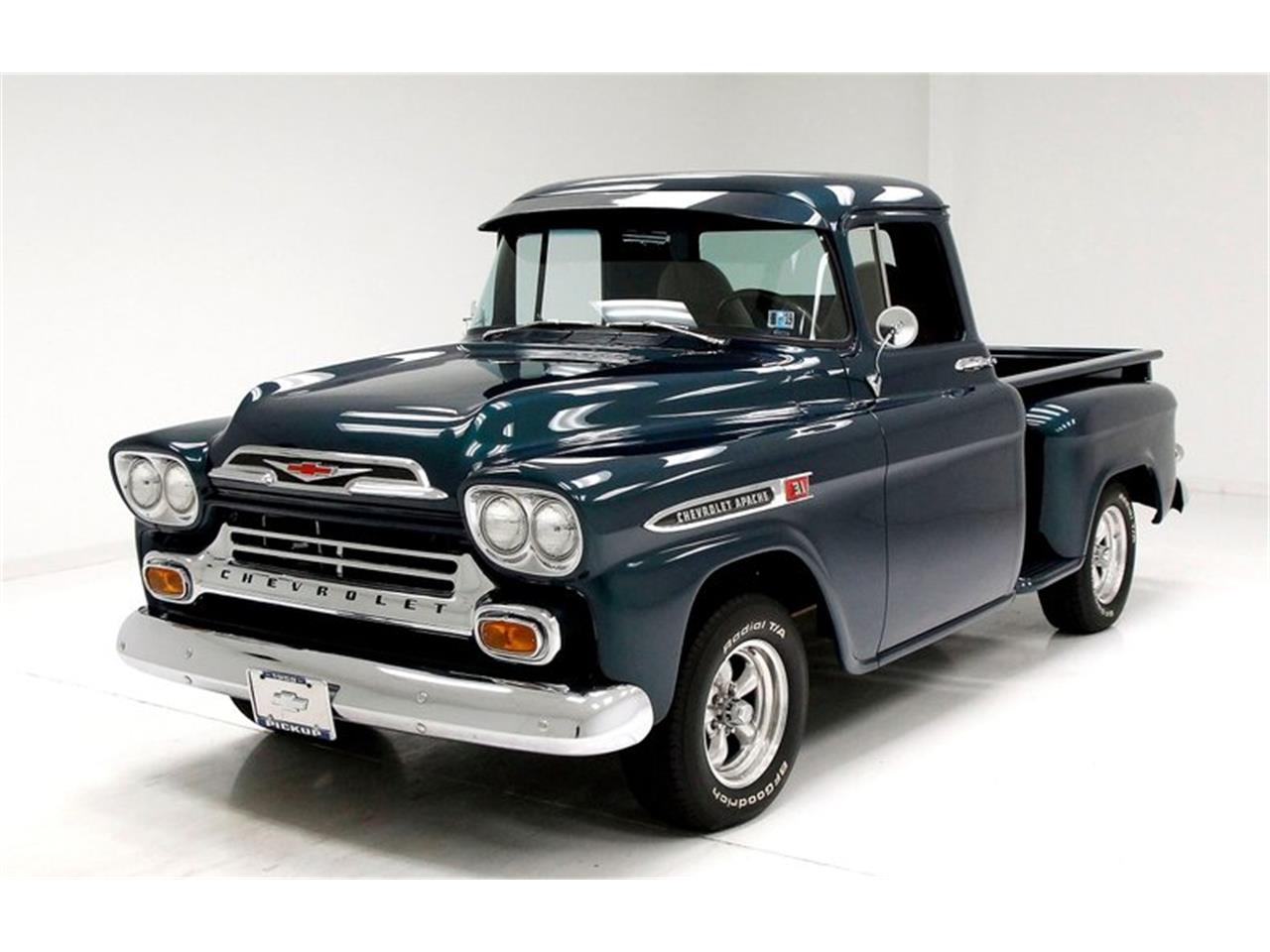 1959 Chevrolet Apache Pickup. 283ci V8. This is topped by a single 2-barrel carburetor and has a TH350 3-speed automatic transmission on back. Way back nestled under the bed, is a 10-bolt rear. Smooth beige vinyl and a panel of tuck and roll tweed make a background for shiny levers and cranks on the door panels. Vintage air and heat hang below the clean painted exterior matching dash, which also houses a digital AM/FM/Radio. A beige headliner is atop the compartment, and Berber carpet in tan and very clean condition floods the cabin floor.