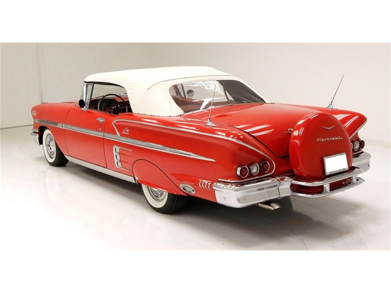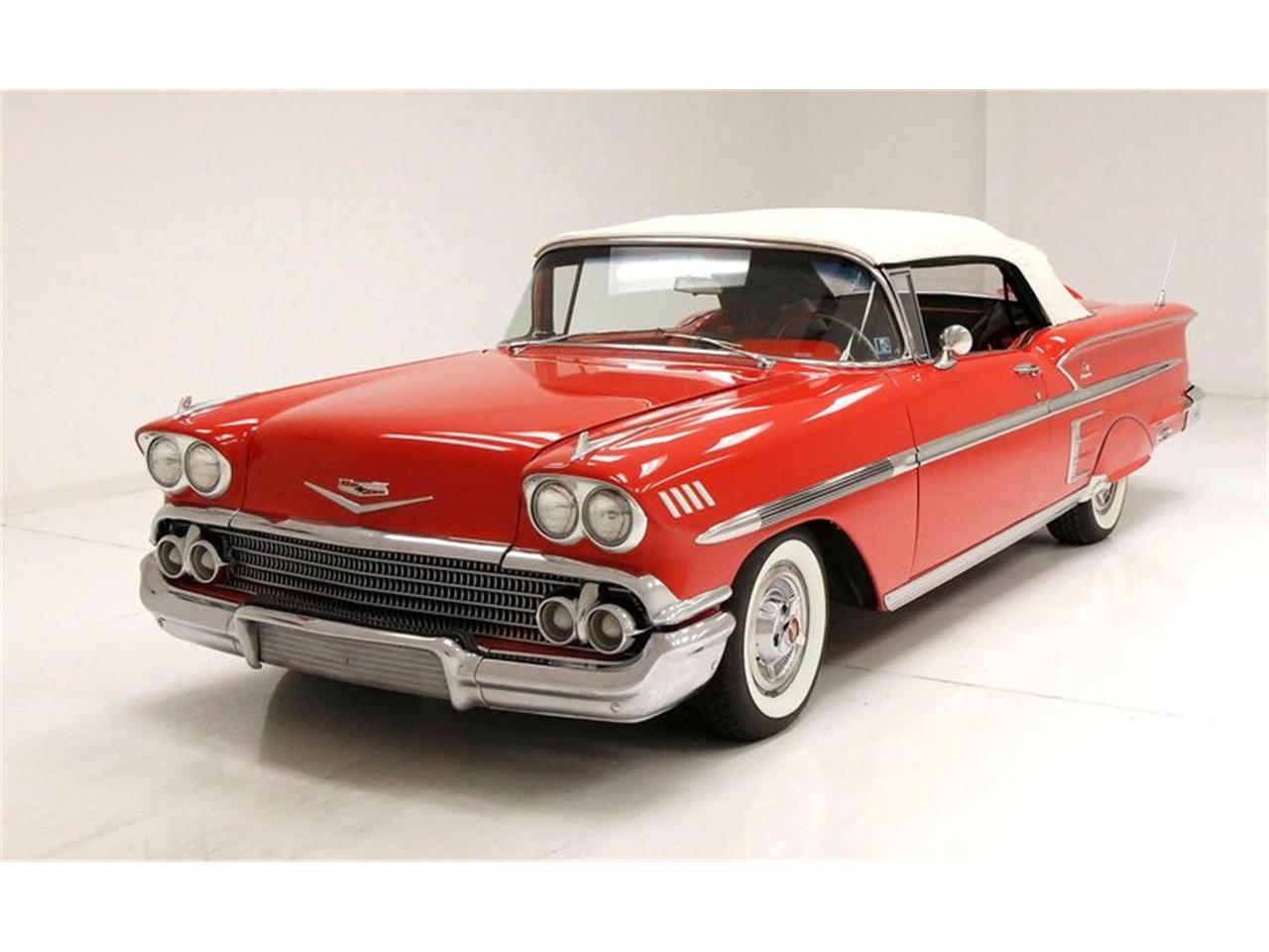 1958 Chevrolet Impala Convertible, 348ci V8 with tri power carbs (3-2 barrel carbs), Turboglide 3-speed automatic transmission. 3.36 gears are on the rear. A large rocker trim melts into a perfectly arched fender skirted rear with a front chromed trim piece. 8 vertical trim lines and 2 horizontal are seen embedded within the blazing and beautifully applied Rio Red Paint. The egg crate grille is surrounded by large chrome bumpers and trim, and 8 count em...8 bezeled light fixtures. All in beautiful presenting condition. The pristine white convertible top moves with power assist up and down effortlessly. 14-inch Chevrolet faux knockoff wheel covers gleam like new, and are wrapped with wide whites. The most obvious is the three-tone striped pattern on the cloth seat inserts. These present with black gray and red alternating cloth striped inserts, and bright red vinyl bolsters, and are just perfect in condition and design. Another unique detail are the formed, anodized aluminum panels on the doors and interior quarters-that was a real nightmare for Fisher Body because all the body panels had to be an exact color match. The dash has been made even sleeker with white faced Dakota Digital dash gauges, a 10 CD changer including a working rear seat speaker. Power windows are all working perfectly, and an inverted boomerang drilled and emblazoned in the center with Impala and Chevrolet flags, and a circular horn ring, fronts the sleek dash. Perfect deep pile red carpet floods the floors and floats the just perfect seats.