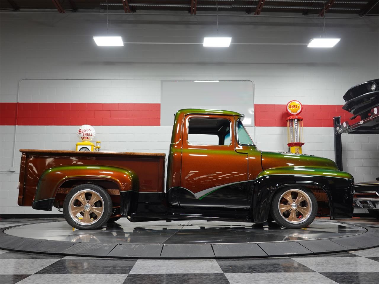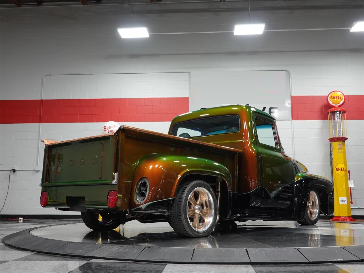 This radical 1956 Ford F100 Custom is something of a celebrity. The big 460 Ford big block has aluminum heads, a tunnel ram intake, and dual carbs. The engine generates about 550 horsepower on 100 liquid propane. A quick disconnect exhaust system, which exits in custom molded exhaust tips in the rear fenders. The engine and accompanying C6 automatic are painted to match the chassis components, which are the same color as the body, but cleared with PPG s Soft Touch flat finish clearcoat.