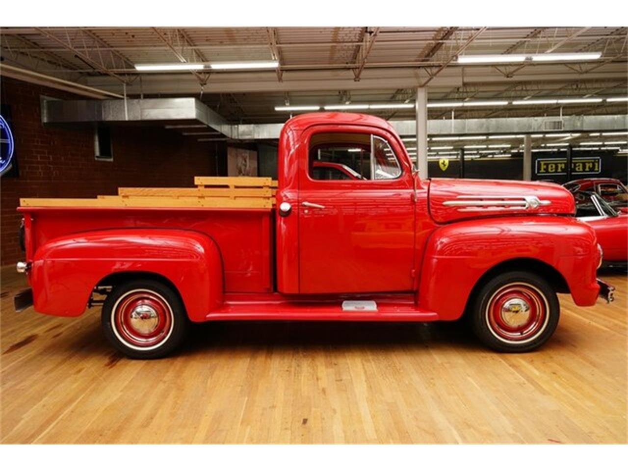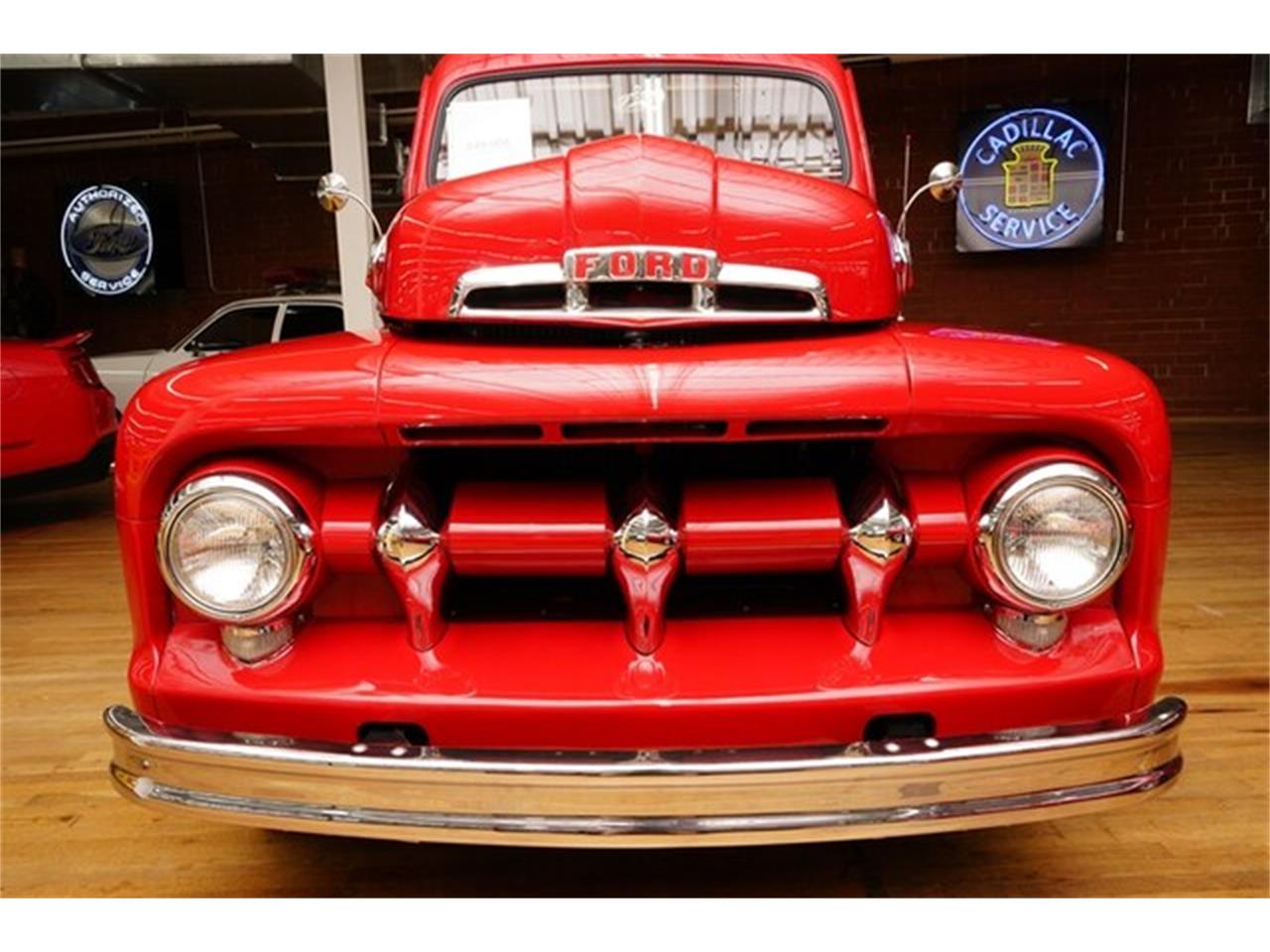 This beautiful First Generation F Model 1952 Ford F1 Pick up is presented in Coral Flame Red with Tan interior. It has a beautiful oak bed and a 239 cu in 100hp Flathead V8 backed up by a 3 speed On the Tree manual Transmission. It has been completely restored that shows a quality FORD TRUCK. The flathead V 8, still at 239 cid, got a bump in compression ratio, increasing output to 106 horsepower. Hood trim was revamped, and front grille color was changed from silver to white, This one has the color matched with Chrome.