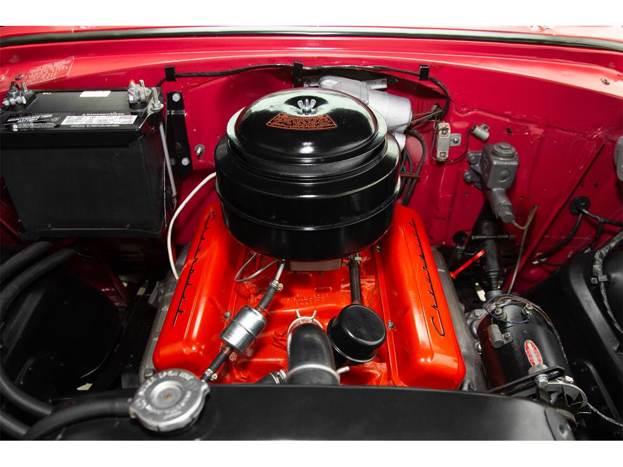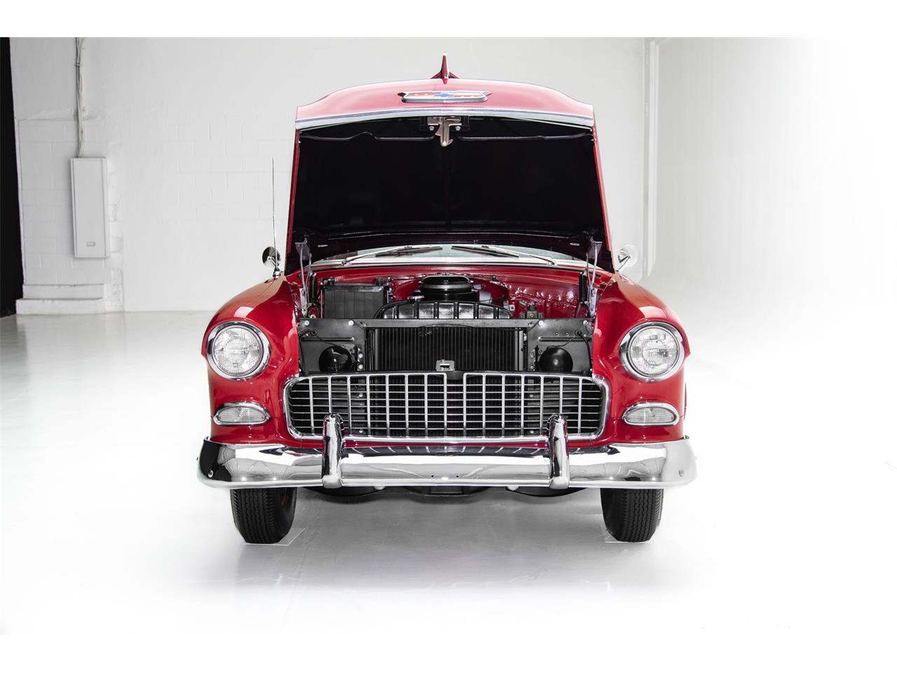 Stunning 1955 Chevrolet Bel Air 2 door hardtop finished in Cranberry Red and Snow Crest White paint resulting in iconic good looks. Beautiful chrome bumpers, grill, headlight bezels, hood ornament and emblems. The Bel Air stainless trim is original and has been polished to a brilliant shine. The engine compartment has been highly detailed and showcases the original Turbo Fire.