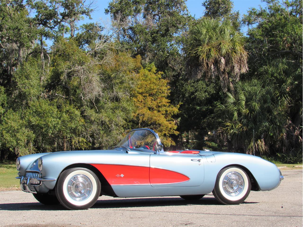 Arctic Blue Exterior with Venetian Red Coves, Factory Correct Combination, Power Soft Top. Factory Hard Top,Correct 283 245 2x4bbl V8 2 Speed Power Glide Automatic Transmission ,Correct Date Coded Intake, Carbs, Engine Factory Power Windows.