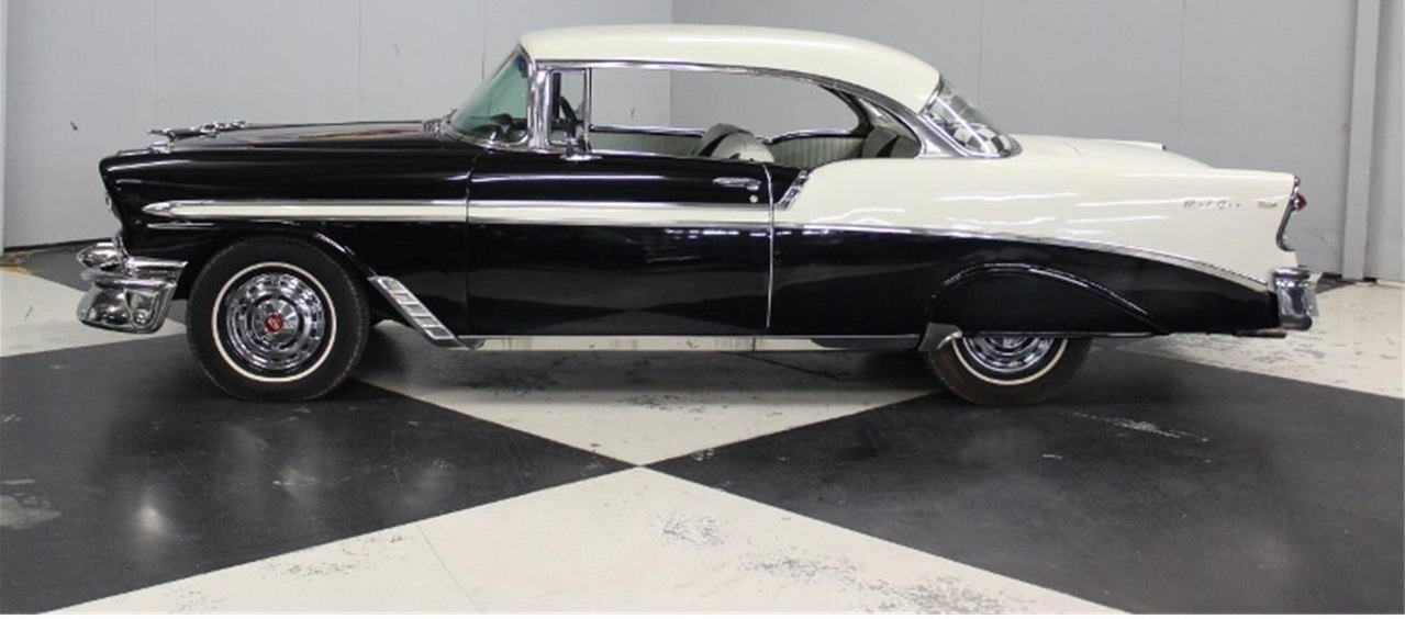 This BelAir is painted Black and White and it looks good, front and rear bumpers are good with the bumper guards rough. Grill is good, head light trim is good. Turn signal trim rough, hood trim is good. Fender trim is good. Rocker panel moldings are good, door handles are good. Tail lights are good, emblems good. Window trim is good. Felt good, glass is good, fender skirts, dual outside mirrors good, antenna good, newer original hub caps with newer white wall tires, hood emblem good.