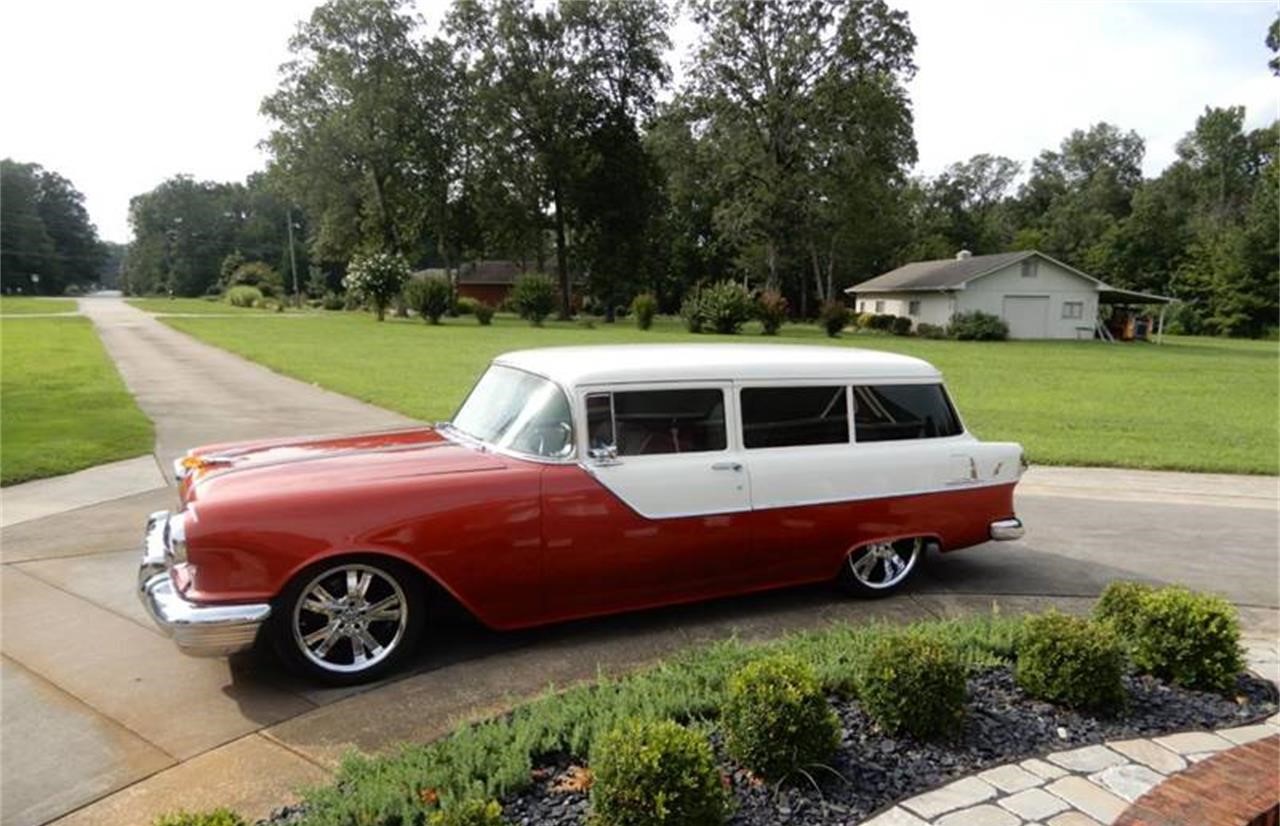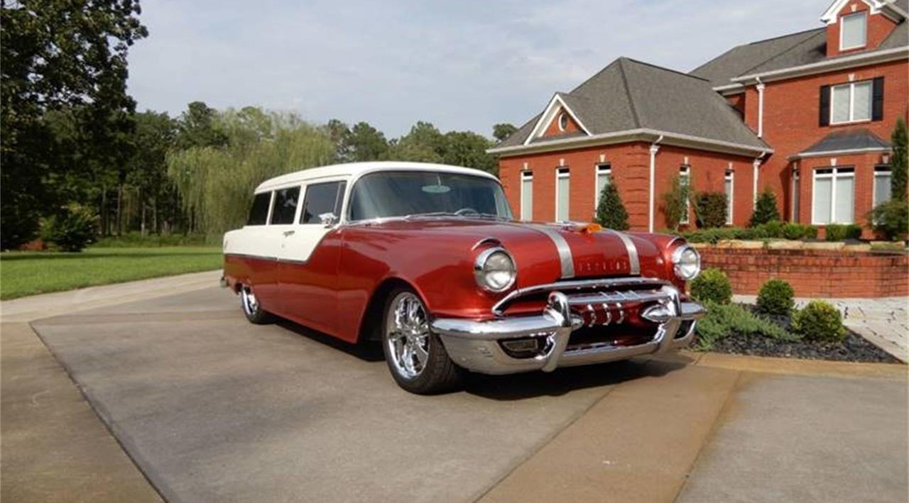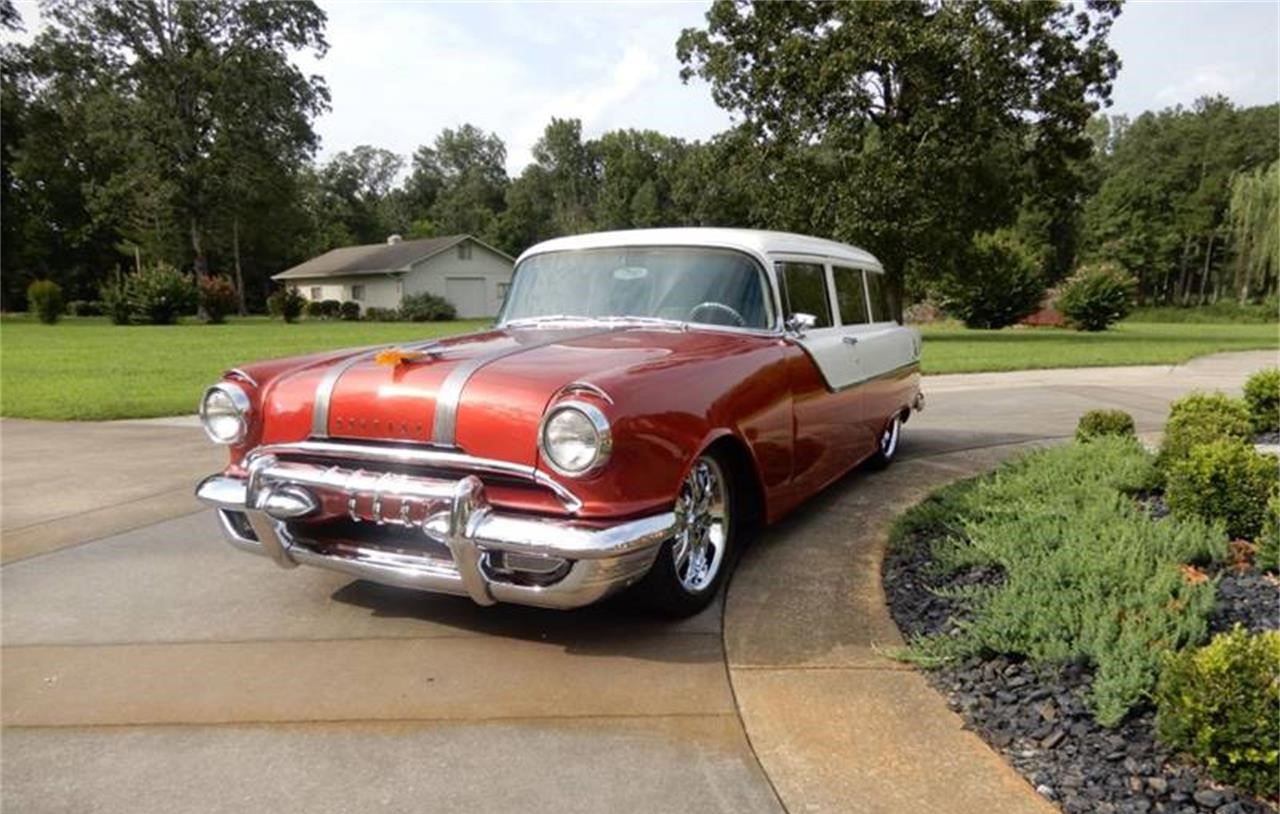 1955 Pontiac Chieftain 2 Door Wagon, Believed By Many to be One of the Prettiest and Rarest Wagons Ever Built. 316 V8 Engine, Automatic, Power Steering, Aftermarket Disc Brakes, Under Dash COLD A C, Air Ride Technologies Air Ride System, LeCarra Billet Leather Steering Wheel, Special Ordered 18 inch Chrome Wheels, Re Done Interior, Every Piece of Chrome, from the Front Bumper, to the Rear Hatch Latches, is either NEW.