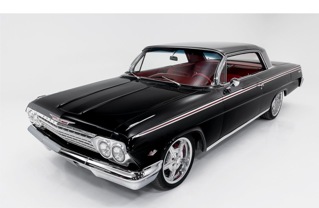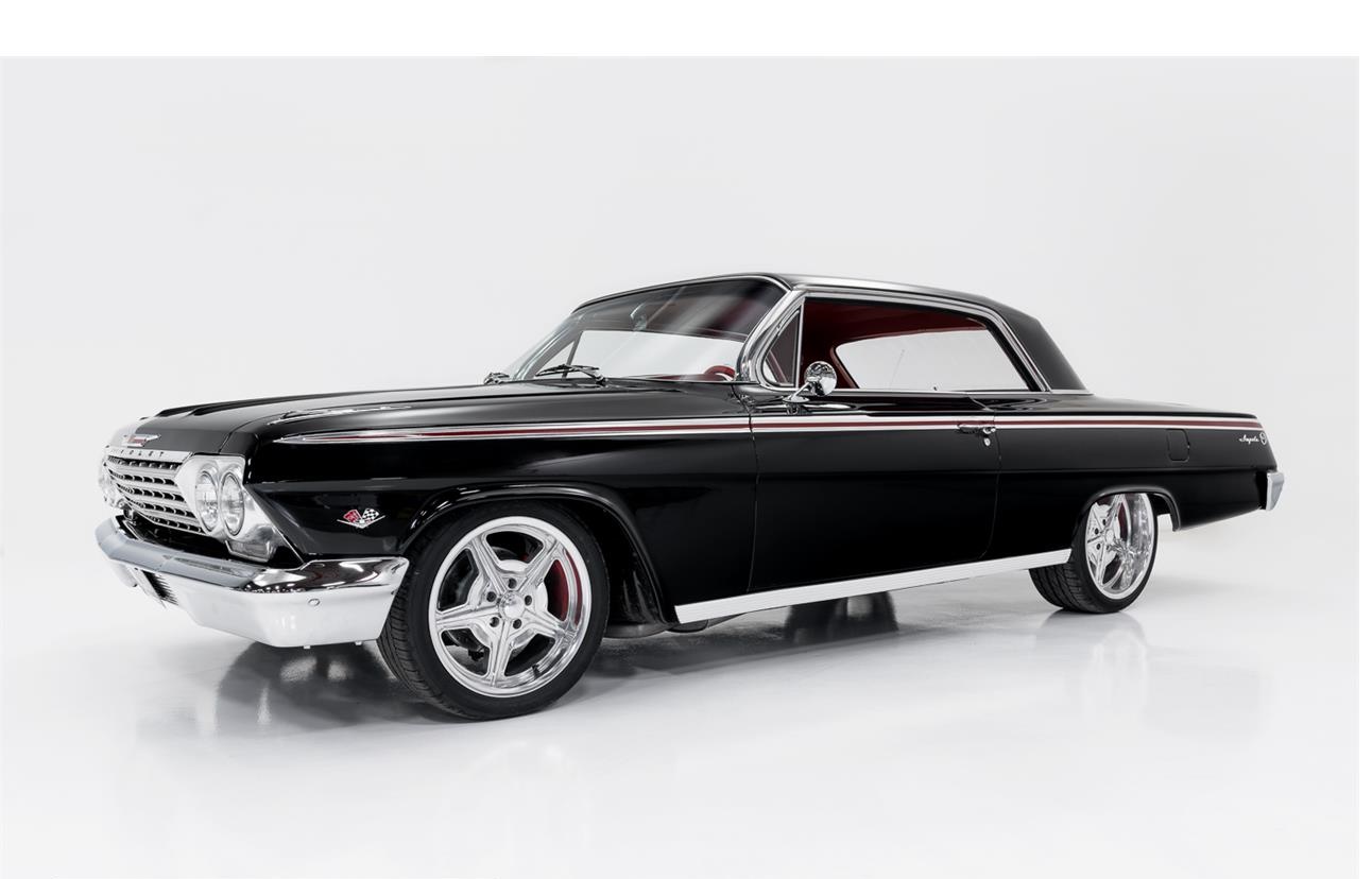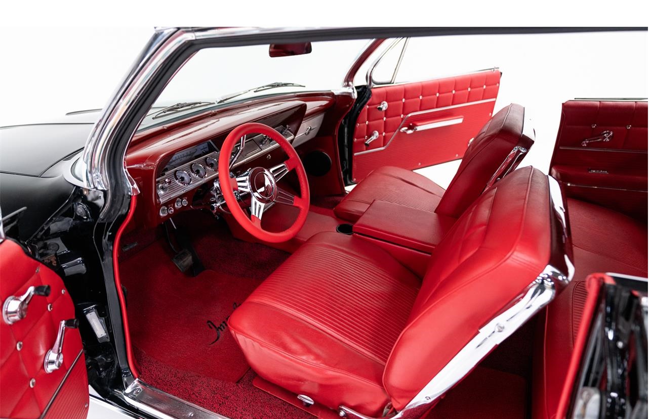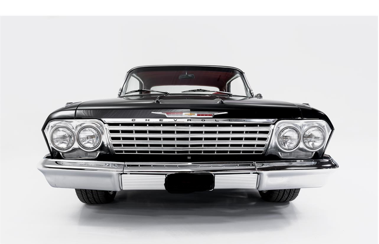 Finished in sharp black over a red interior, this 1962 Impala is a beautifully built car .