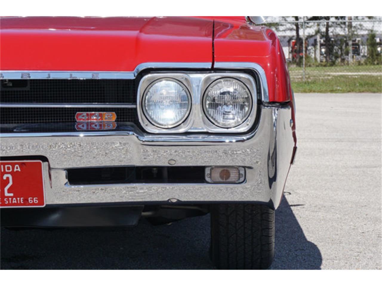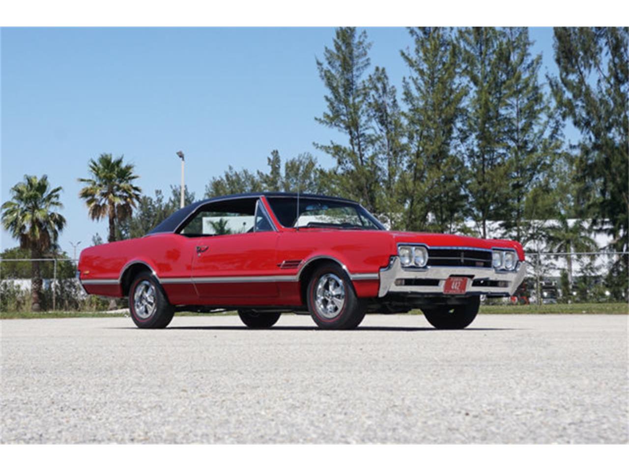 1966 OLDSMOBILE 442 FULL ROTISSERIE RESTORATION IMMACULATE CONDITION LASER STRAIGHT TARGET RED WITH BLACK VINYL TOP OVER MATCHING BLACK INTERIOR 400 CUBIC INCH V8 WITH TRI-POWER MUNCIE M21 4-SPEED WITH HURST SHIFTER BUCKET SEATS AND CONSOLE FACTORY A/C AM RADIO POWER BRAKES POWER STEERING CONSOLE TACH HURST WHEELS WITH REDLINE TIRES - Contact Rolando Santos at 305-594-2223 or rolando@themiamigarage.
