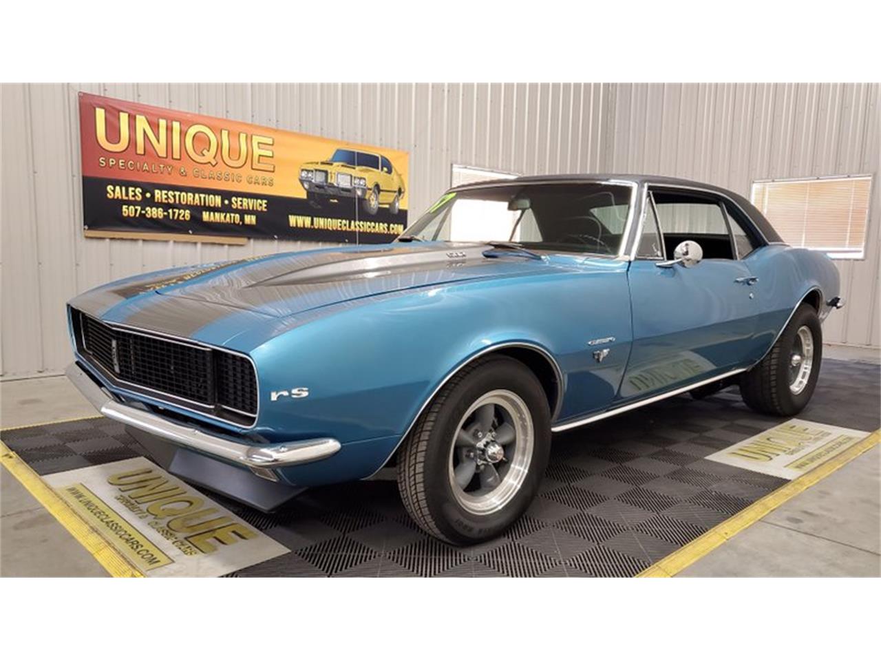 1967 Chevrolet Camaro RS finished in light blue paint with silver stripes.