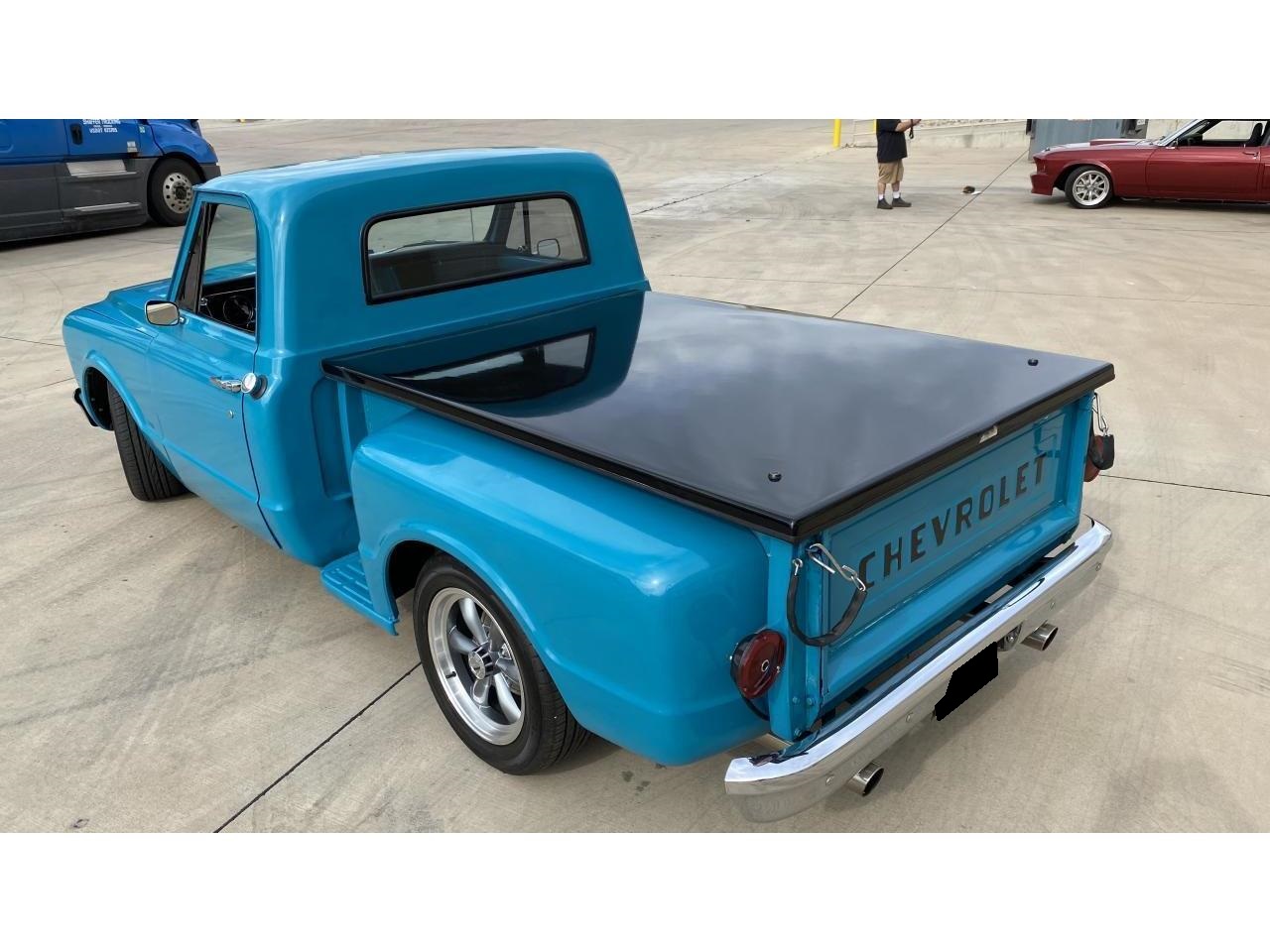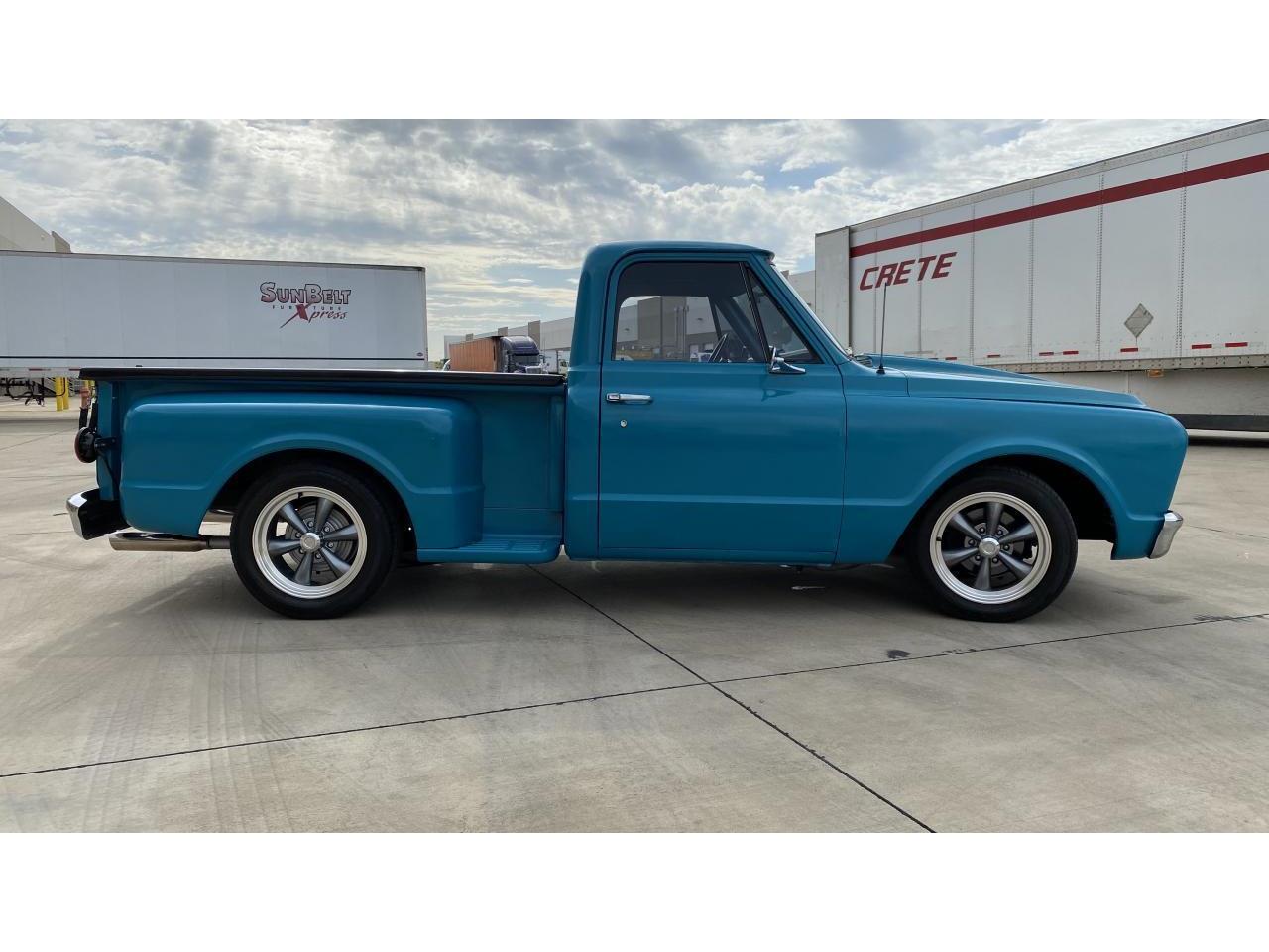 1967 Chevrolet C10 Stepside Restomod. This truck has a cammed 350 V8, 700R4 4-speed auto. Holley 4 barrel carb. Lowered 3 inches all around with CPP front drop spindles and disc brake assemblies. Dakota Digital Instrument Cluster. Front and rear stabilizers. Cold vintage AC and heat. Flowmaster type exhaust with good throaty sound. Vision Legend Series 6 lug wheels and Falken 235/55/R17 tires. Very nice satin turquoise paint with a Nice black bed topper with a good wooden bed.