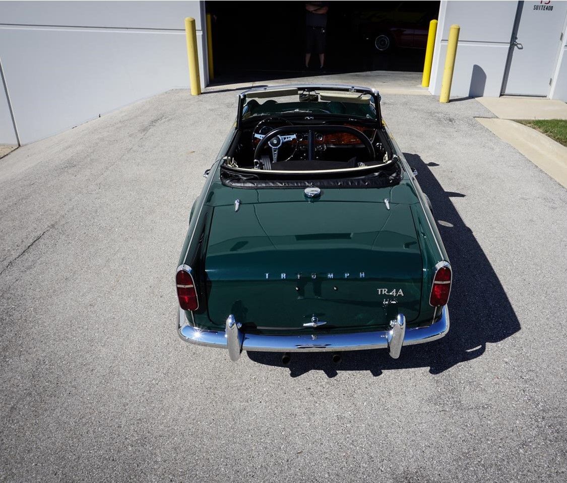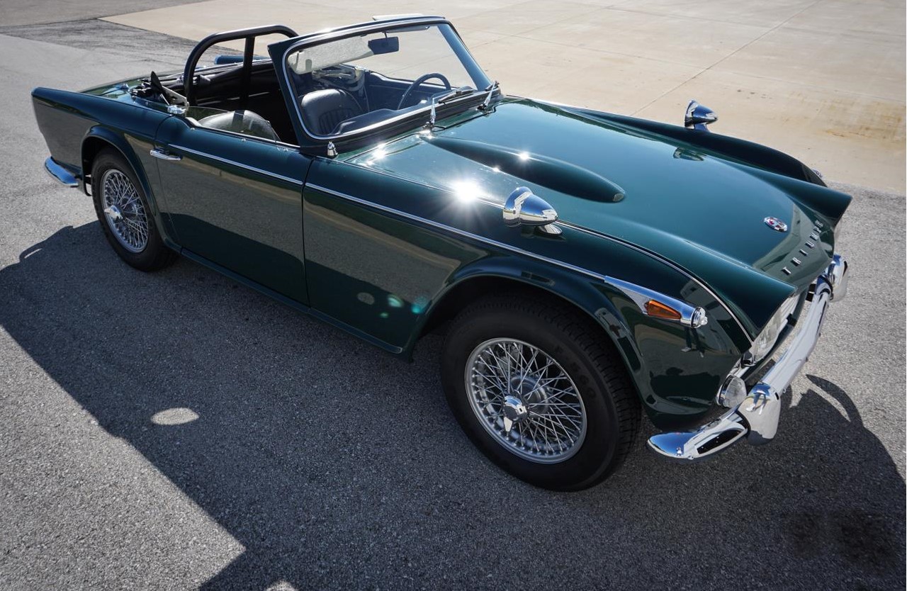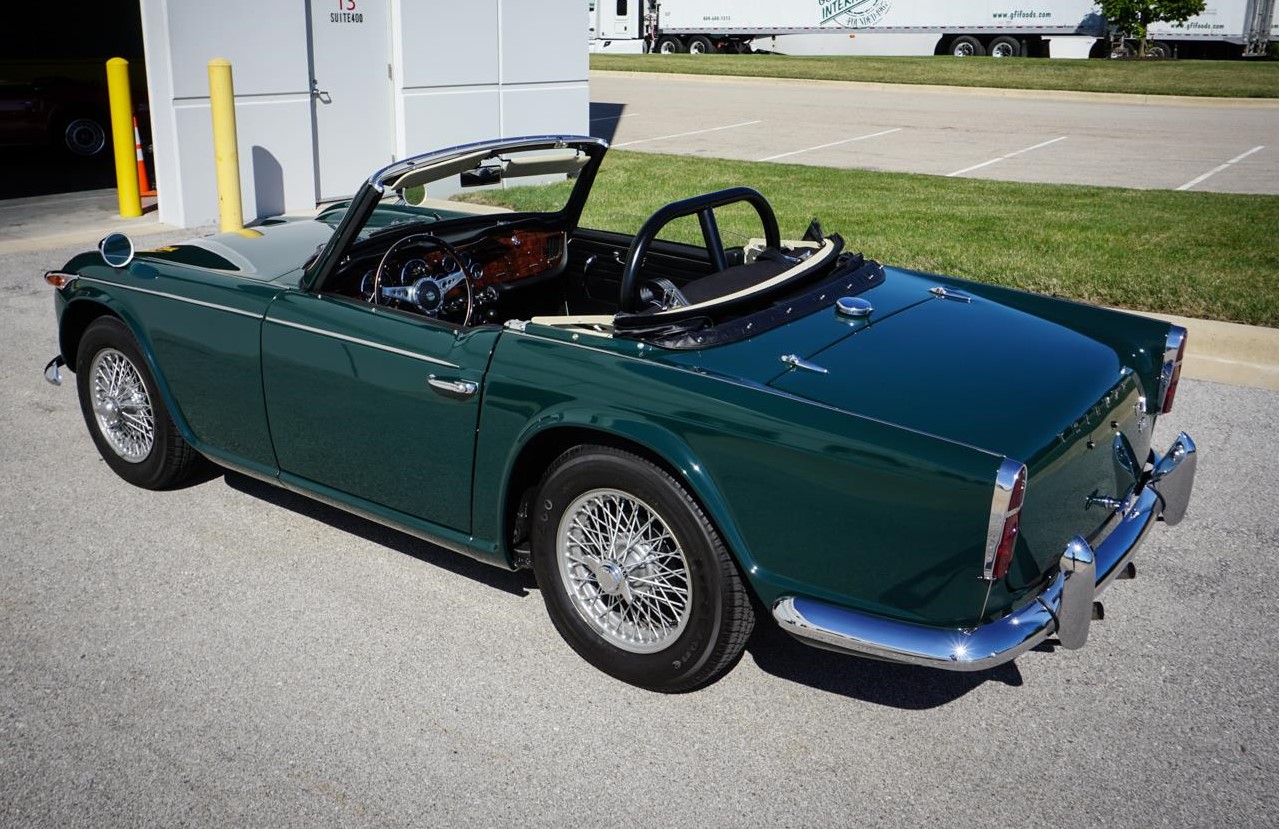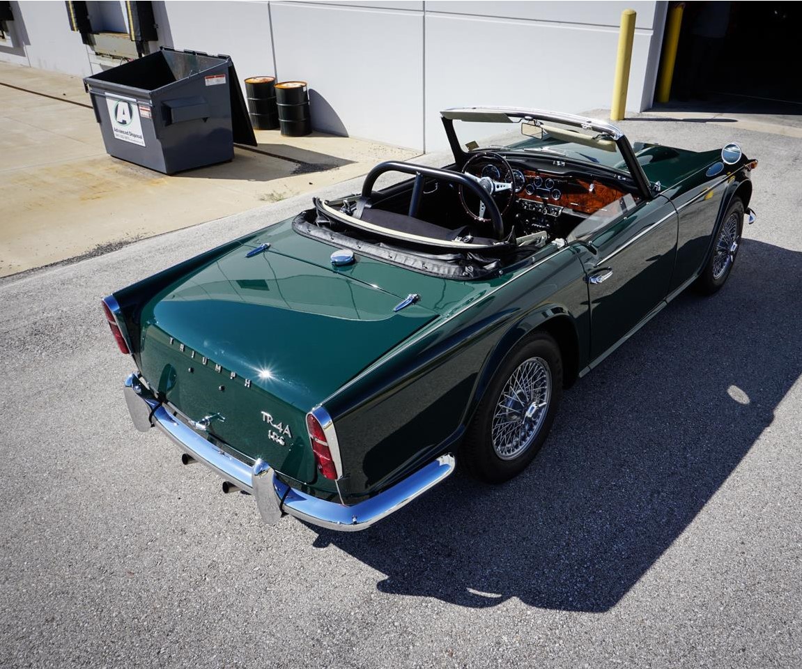The TR4A came as a revision to the previous TR4 bring only made between the years 1965 to 1967 which came with suspension upgrades including a rear trailing arm, changes at the side members and cross bracing to accommodate a smoother more road friendly ride over its predecessor. This TR4A comes as a shining example of how one looked in the year 1967 as it looks practically brand new as evident by a frame off restoration. Under the hood of this dark green beauty lies a 2138cc inline 4-cylinder engine which propels the small body of this car with ease, providing plenty of pep through turns and straight aways. The motor transfers energy through a smooth gated 4-speed manual transmission giving for a full experience when driving this roadster legend. It is rare to see any car built to spec like this one has been with the only thing being added was the roll bar off of a 1968 TR series giving this car the sporty track ready look that it deserves.