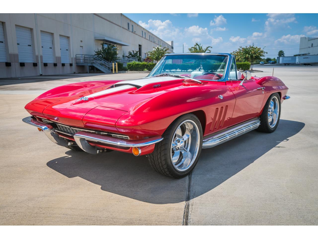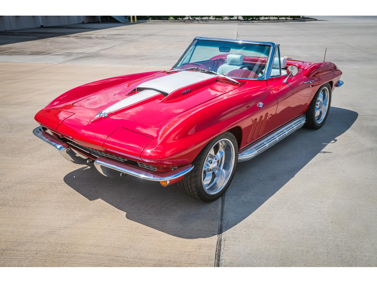 All the seams were welded and the cleaned-up piece was powder coated Red for maximum durability and to match the car's mouth-watering Red and White base/clear coat color scheme, including the Stinger stripe on the big-block hood. A 427 CI Generation 5 big block Merlin engine uses advanced Bigstuff3 electronic fuel injection to generate copious power through a close ratio M21 4-speed to a 4.11 rear end. Boyd Coddington 18-inch spoked alloy wheels are used in conjunction with power rack and pinion steering and custom Precision 4-wheel disc brakes, and shorter half shafts are employed to accommodate the car's wider rear tires.