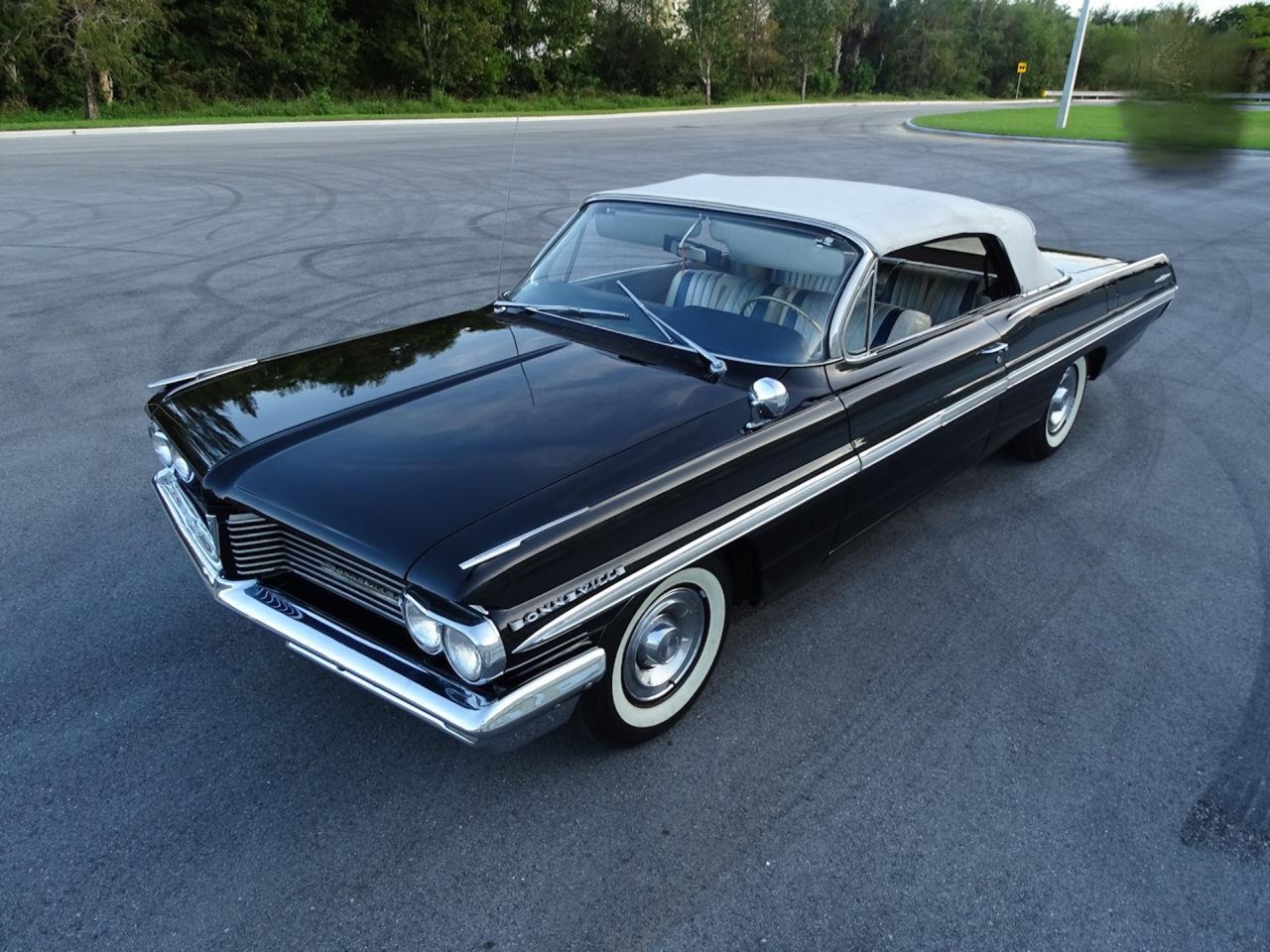 1962 Pontiac Bonneville Convertible! Excellent Condition with only 51,480 Miles! This Vehicle is Mostly Original except for a Repaint of the Beautiful Factory Starlight Black Color. The Original 389 V8 and Automatic 2-Spd Trans Runs, Shifts and Drives Excellent, The Original Silver on Blue and White Vinyl Interior is in Good Original Condition and Shows well for a 58 year old Car. The Paint Job was done 3 Years ago and shows in Excellent Shape with Lots of Shine and Luster, the body is Straight and Solid, All Chrome, Brightwork, Glass, and Moldings, are all in Very Good Condition, the Undercarriage is Solid. Options and Features include Power Steering, Power Brakes, Power Top (White), Am Transistor Radio, Remote Mirror, and Spare Tire. this Vehicle has been Maintained its Whole Life and Runs and Drives Excellent!
