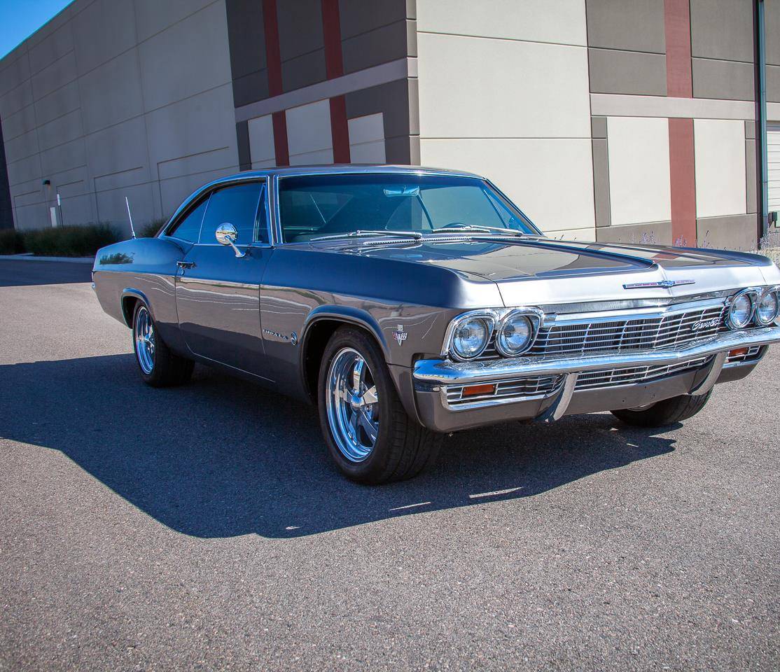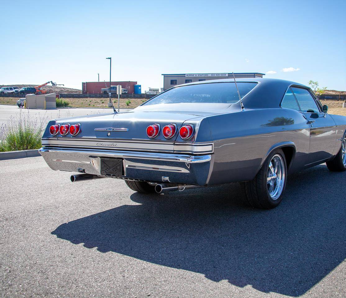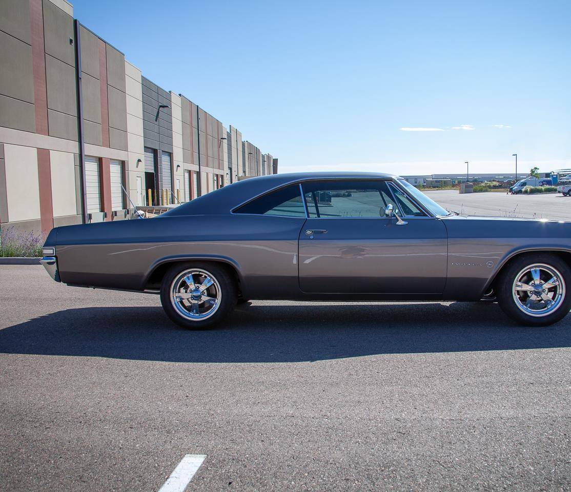 1965 Chevrolet Impala. Fuel injected 454 Big Block V8 engine mated to an automatic transmission. The 454 is capable of providing plenty of power to this Impalas wheels and sounds menacing when fired up. B&M Shifter, Dakota Digital Gauges, Power Brakes, Posi Traction, Tilt wheel and Seatbelts.