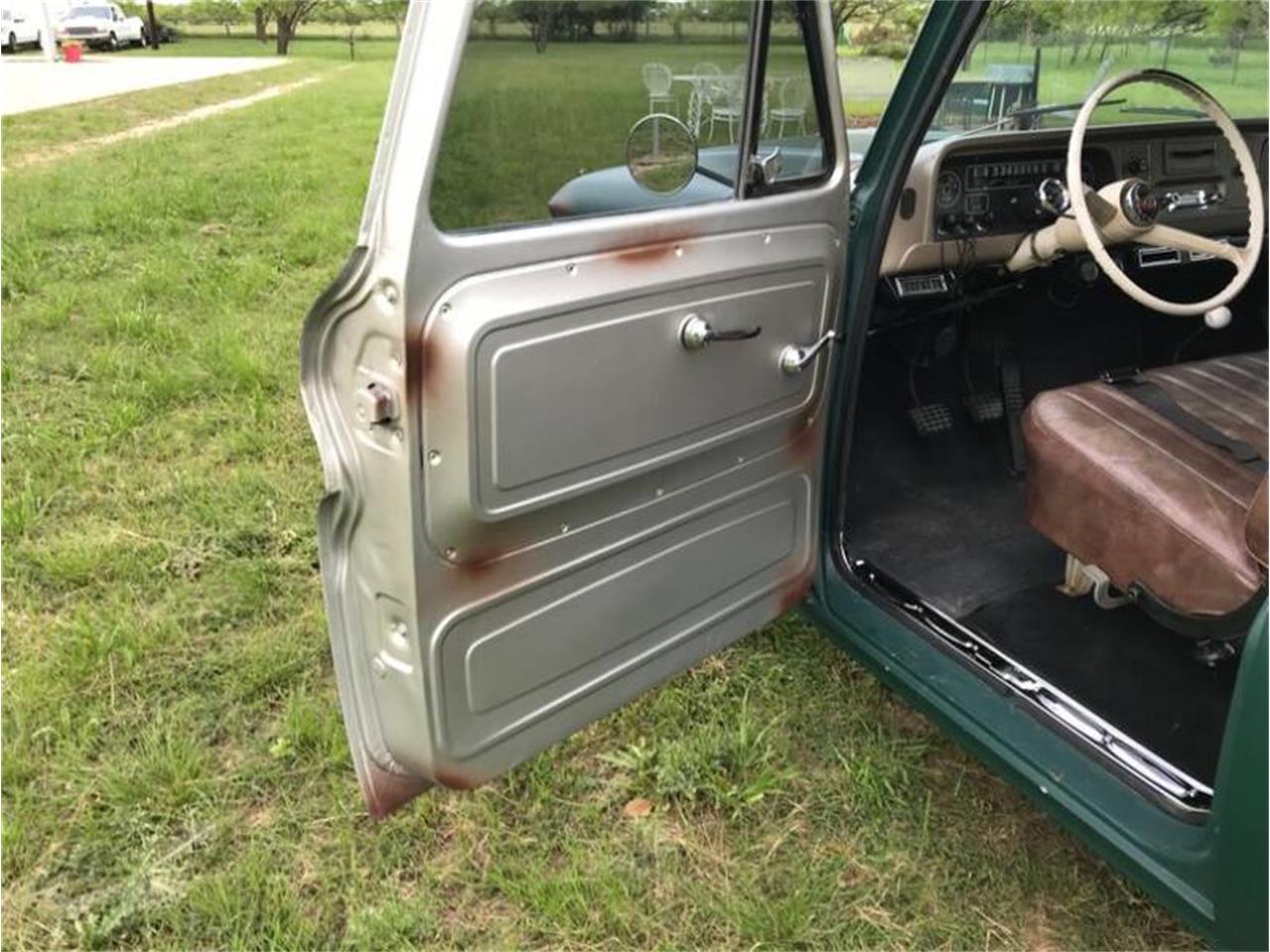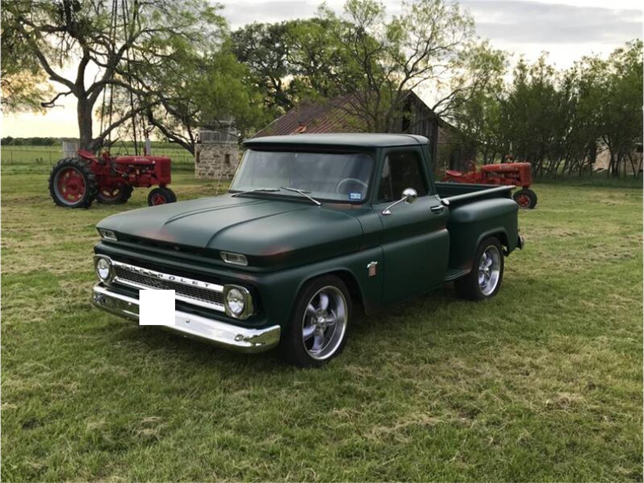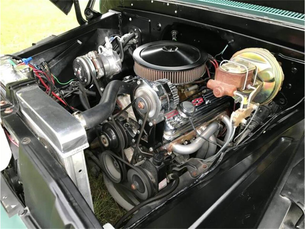 GM crate 330 hp H/O 350 and left the 3 speed but installed a new Hurst shifter, we added brand new power steering, power front disc brakes, heavy duty sway bars, modern stereo with blue tooth, a cool set of 20 Coys wheels, performance tires, brand new headers and exhaust system and had a distressed ball glove leather seat cover and new padding inside. The paint is a suede green with fake patina spots as that is the look he wanted. He had us put a brand new chrome grill, bumpers, mirrors and light bezels.