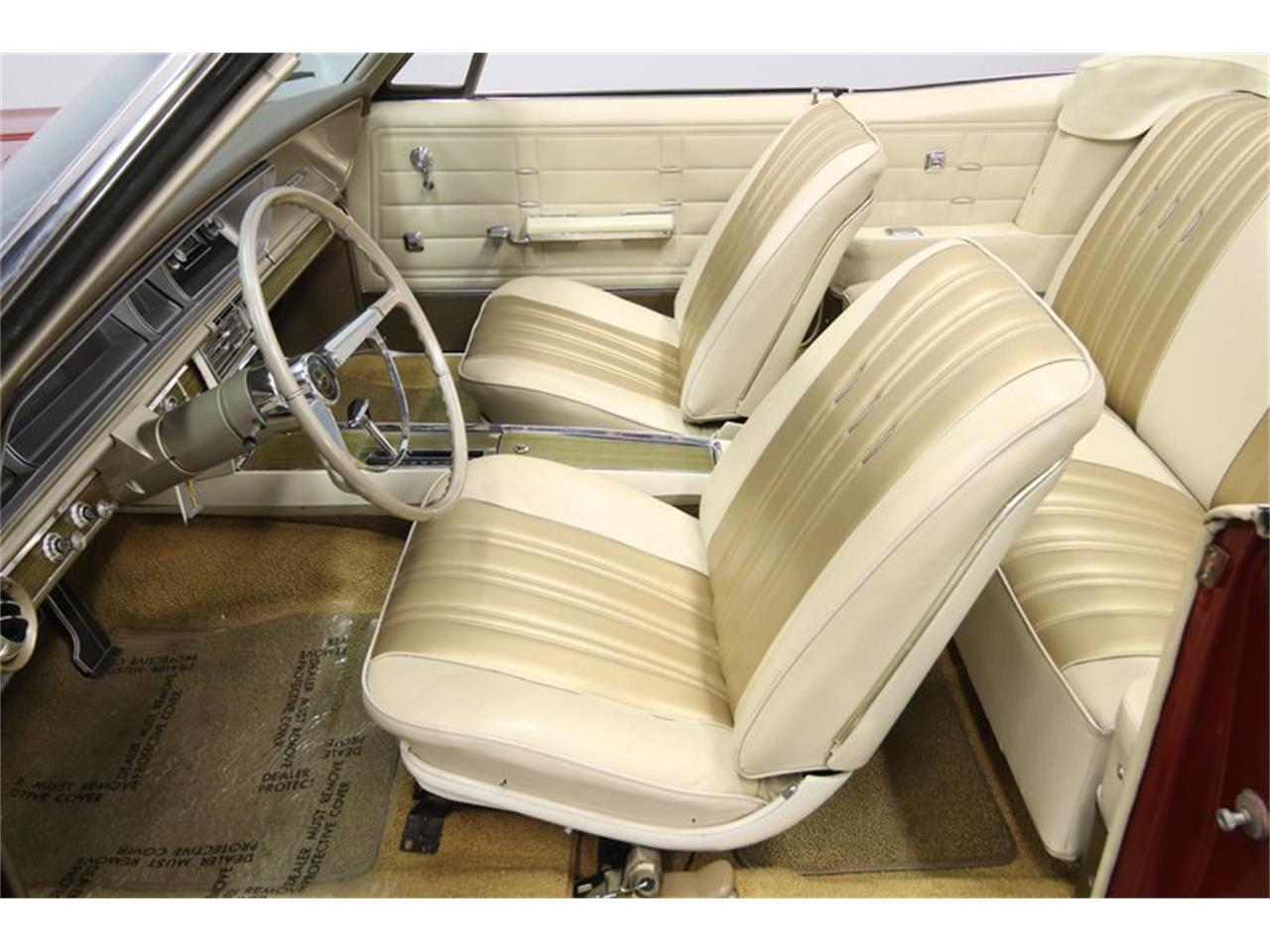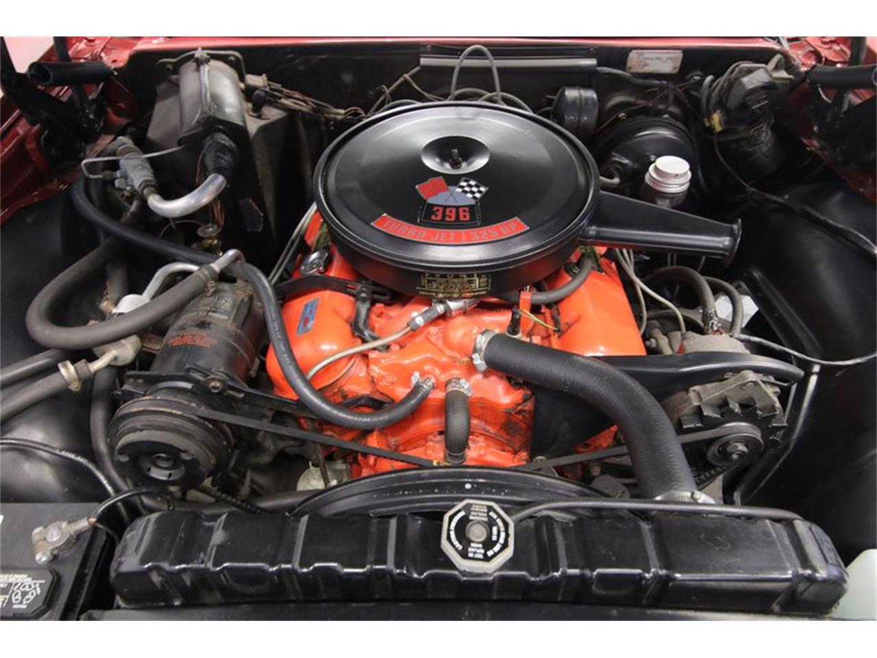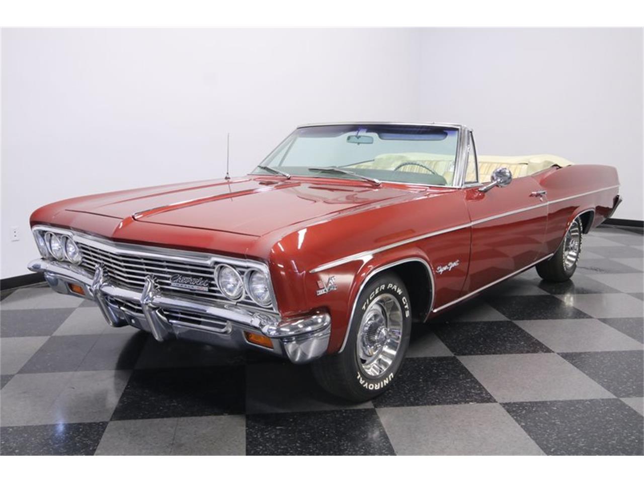 1966 Chevrolet Impala SS 396 convertible. Numbers-matching big block. It has a terrifically stock look with the bright block radiating within the dark engine bay. And even the decals look correct everywhere. Holley four-barrel carburetor. It makes for a strong setup as the V8 fires up easily, inhales deeply, and makes a sweet exhaust tune. The TH400 three-speed transmission is a nice pairing for a stout setup and automatic shifting. This easy cruising package is completed with power steering and power brakes. This is really a terrific vintage total package that even keeps the AM radio on display and gives you provisions for factory air conditioning.