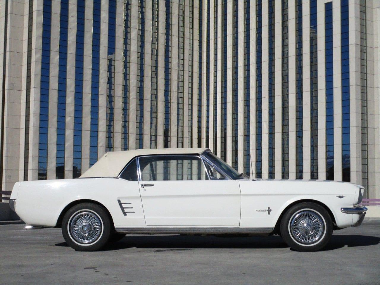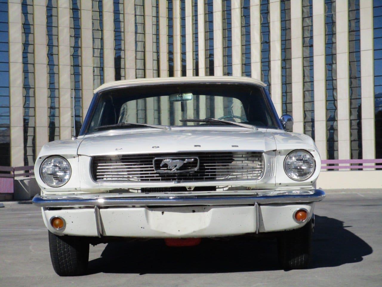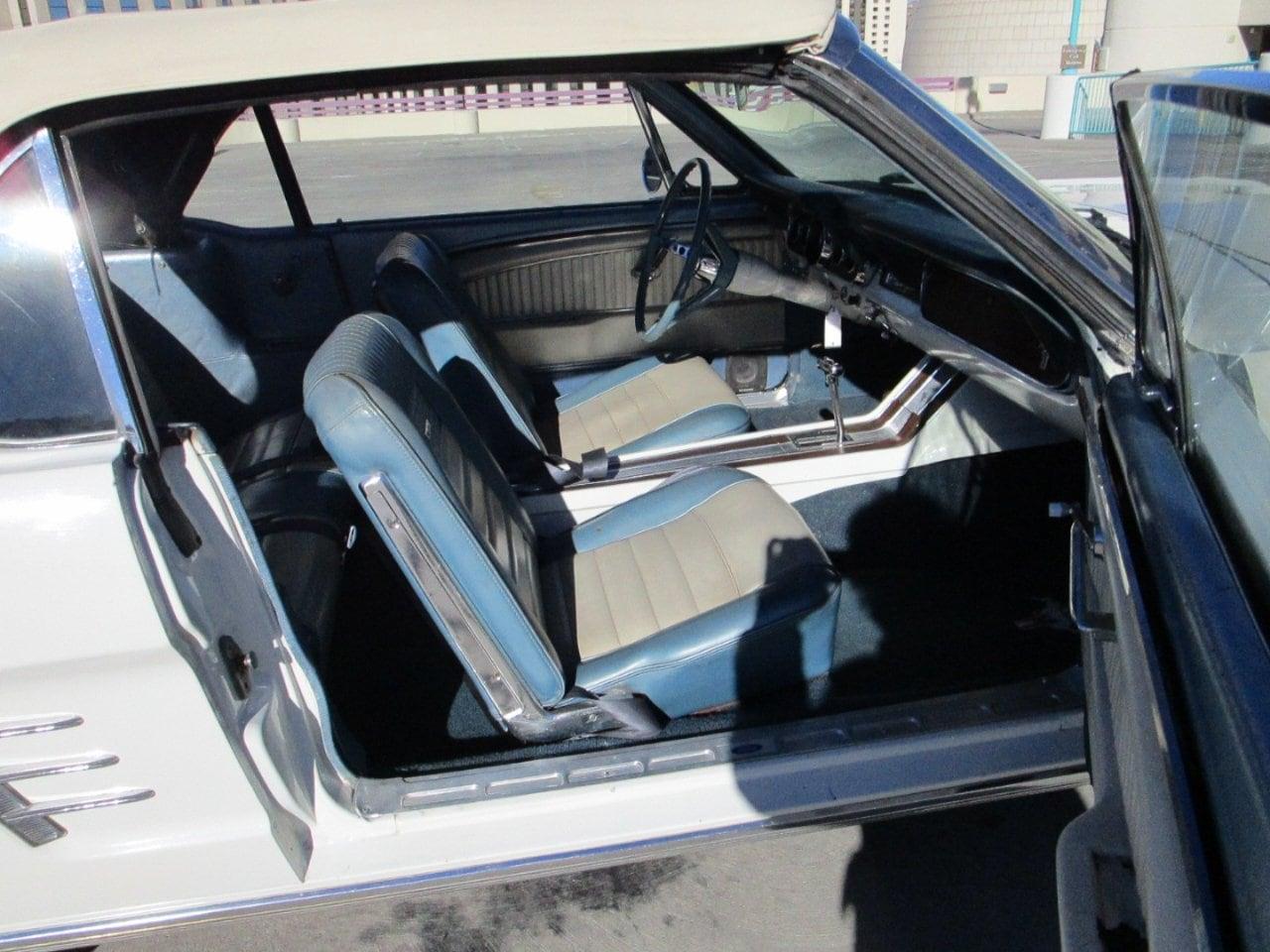 1966 Ford Mustang Convertible. The exterior is the original white paint and is in good condition. The interior is blue and white leatherette bucket seats and is also in good condition.