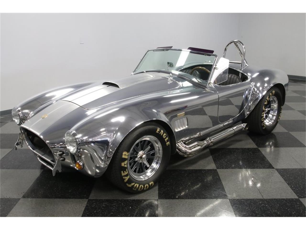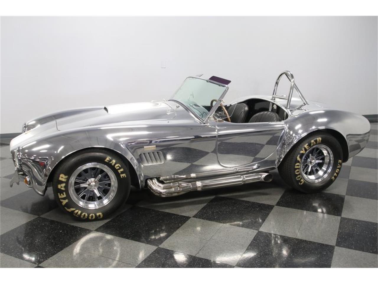 1965 Shelby Cobra. Under the hood is exactly what this car deserves: serious big block muscle. It started out as an all-aluminum FE block with the magical 427 displacement. Then Carroll Shelby Race Engines got ahold of it, and they bored and stroked it to a massive 526ci total. More than just displacement, this was enhanced and fortified with Mahle pistons, Billet crank, Billet H-beam rods, coated bearings, solid roller, fully ported Shelby aluminum heads, Holley four-barrel carb, and more. It was fully balanced, blue printed, and dyno tested for performance. So you have a powerful big block that came directly from the engine company Carroll Shelby established. And the Tremec TKO600 five speed knows how to handle all that big power while also giving you full control of the thunder coming from the side pipes. Low-back racing bucket seats are finished in a supple leather; the gearstick is angled forward; and this has a race-ready fire extinguisher system. The dash is dominated by a special Carroll Shelby full gauge package, and this includes the proper reversed speedometer. You even have a heater added, just so that this can be more comfortable on those fall drives. Plus, there are special 50th anniversary markings on the carpeting and wood-rimmed sports steering wheel.