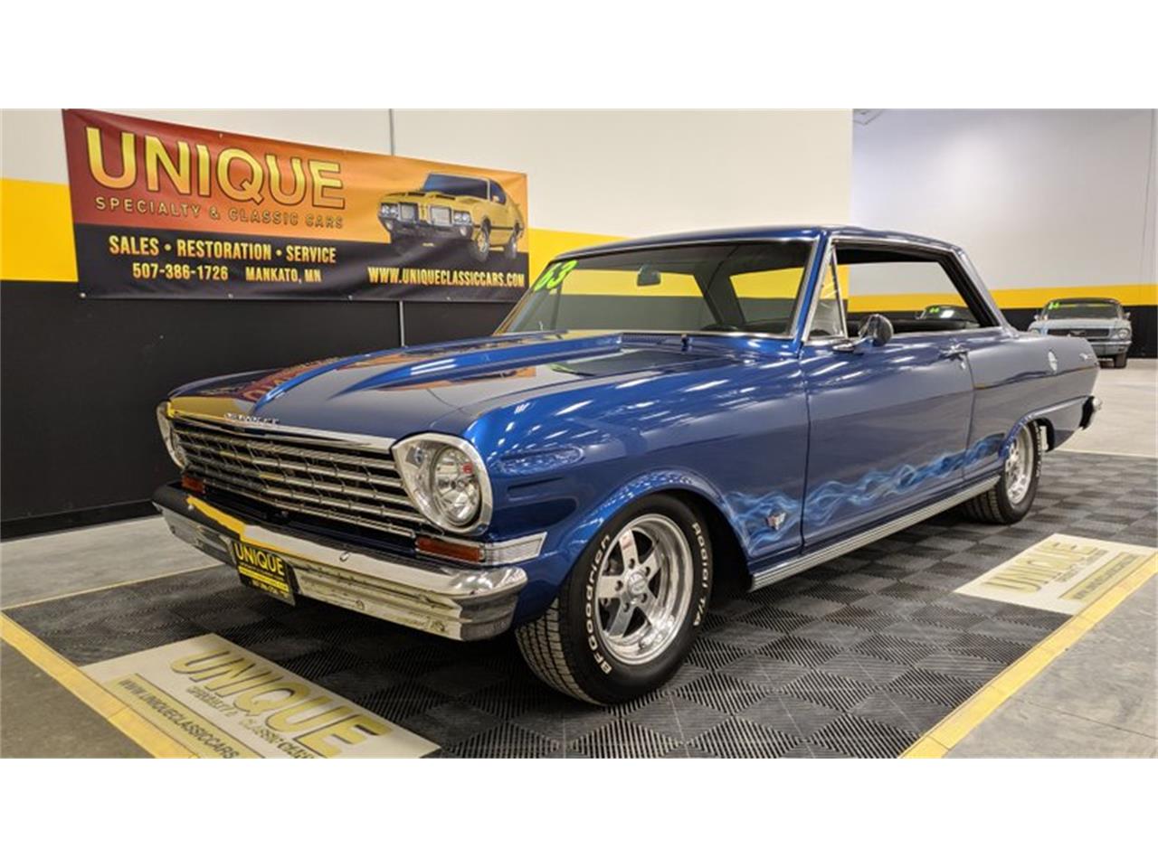 1963 Chevrolet Nova SS finished in blue paint with flames on both sides.