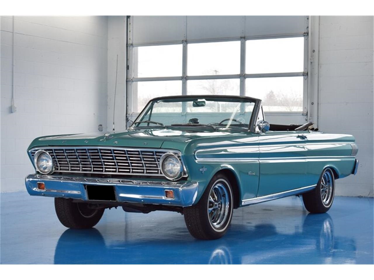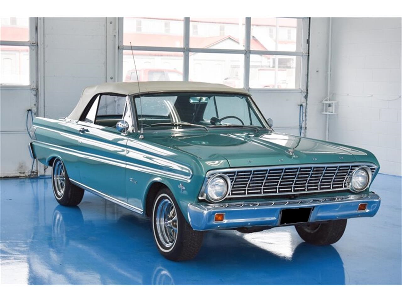 1964 Ford Falcon Sprint Convertible Original D Code Dynasty Green with Code 87 Turquoise Interior and White Soft Top. F Code 260 V-8 with Rare Original 4 Speed Transmission and 3.25 Rear. Options include Factory Dash-Mount Tach, Power Soft Top, AM/FM Radio, Bucket Seats, Console, Factory Tinted Windshield, and Proper Chrome Styled Steel Wheels with Whitewall Radials. Great color combination on a fun to drive original V8 4 Speed Sprint Convertible!