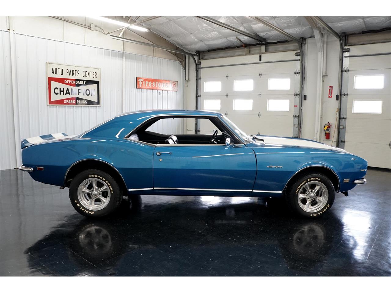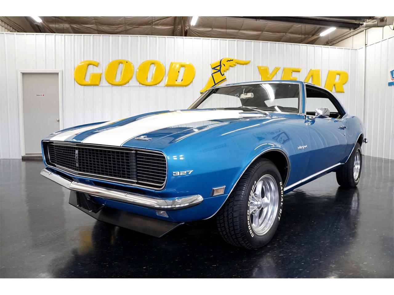 1968 Chevrolet Camaro RS. Factory 4-Speed Center Console. Factory Dash. Factory Heater Controls. Factory Instrumentation. Factory Steering Wheel. Fan Shroud. Front Bucket Seats. Front Seat Belts. Front Sway Bar. Fuel Gauge. GM 12-Bolt Rear End. Heater Lines are Hooked Up. Hide-A-Way Headlights. Lemans Blue exterior. Mechanical Fuel Pump. Multi Leaf Rear Suspension. Numbers Matching 327cid Small Block Chevrolet Engine. Pertronix Flame Thrower Coil. Polished Aluminum Wheels. Quadrajet 4BBL Carburetor. Rally Sport Fender Emblems. Rear Trunk Spoiler. RS Front Grille. RS Front Grille Emblem. RS Gas Cap. Saginaw 4-Speed Manual Transmission.