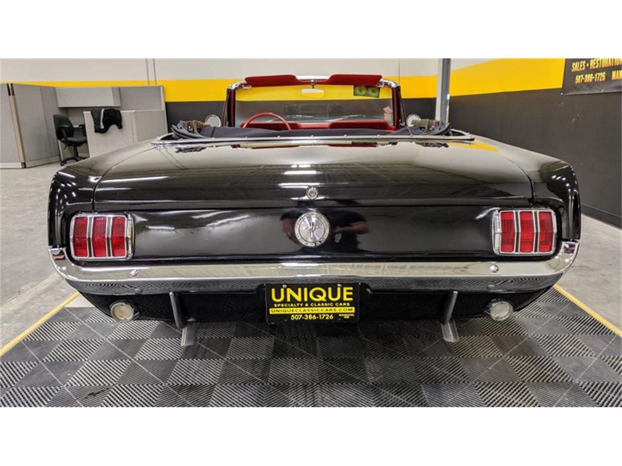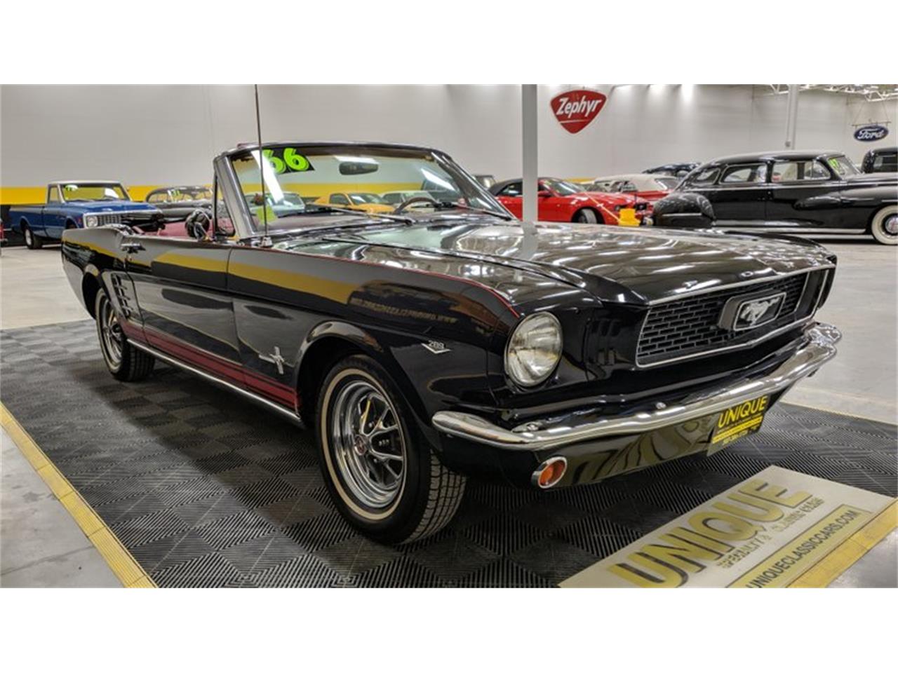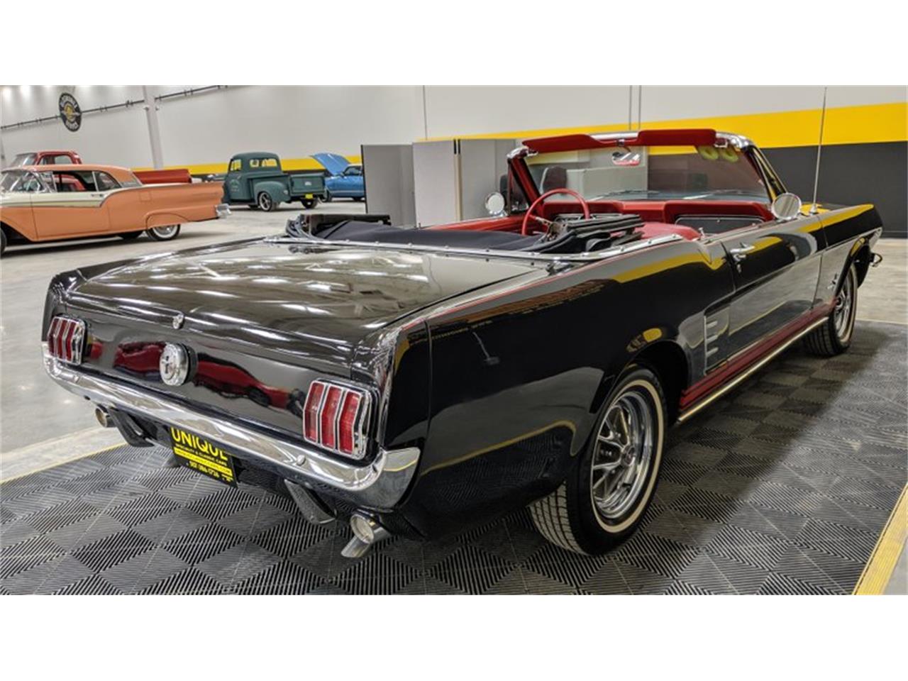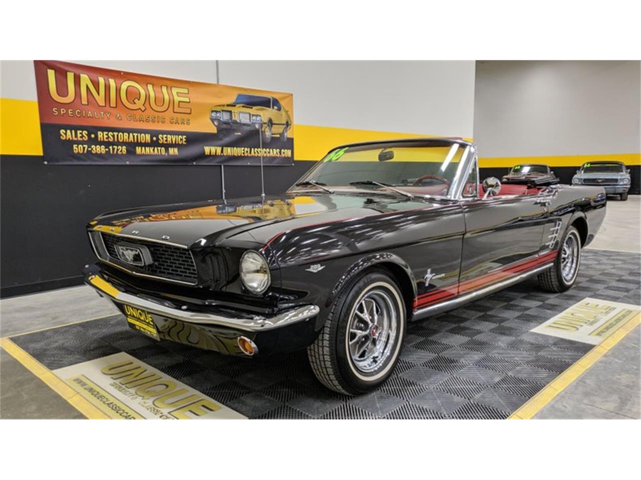 1966 Ford Mustang Convertible finished in black paint with red stripes down the sides.