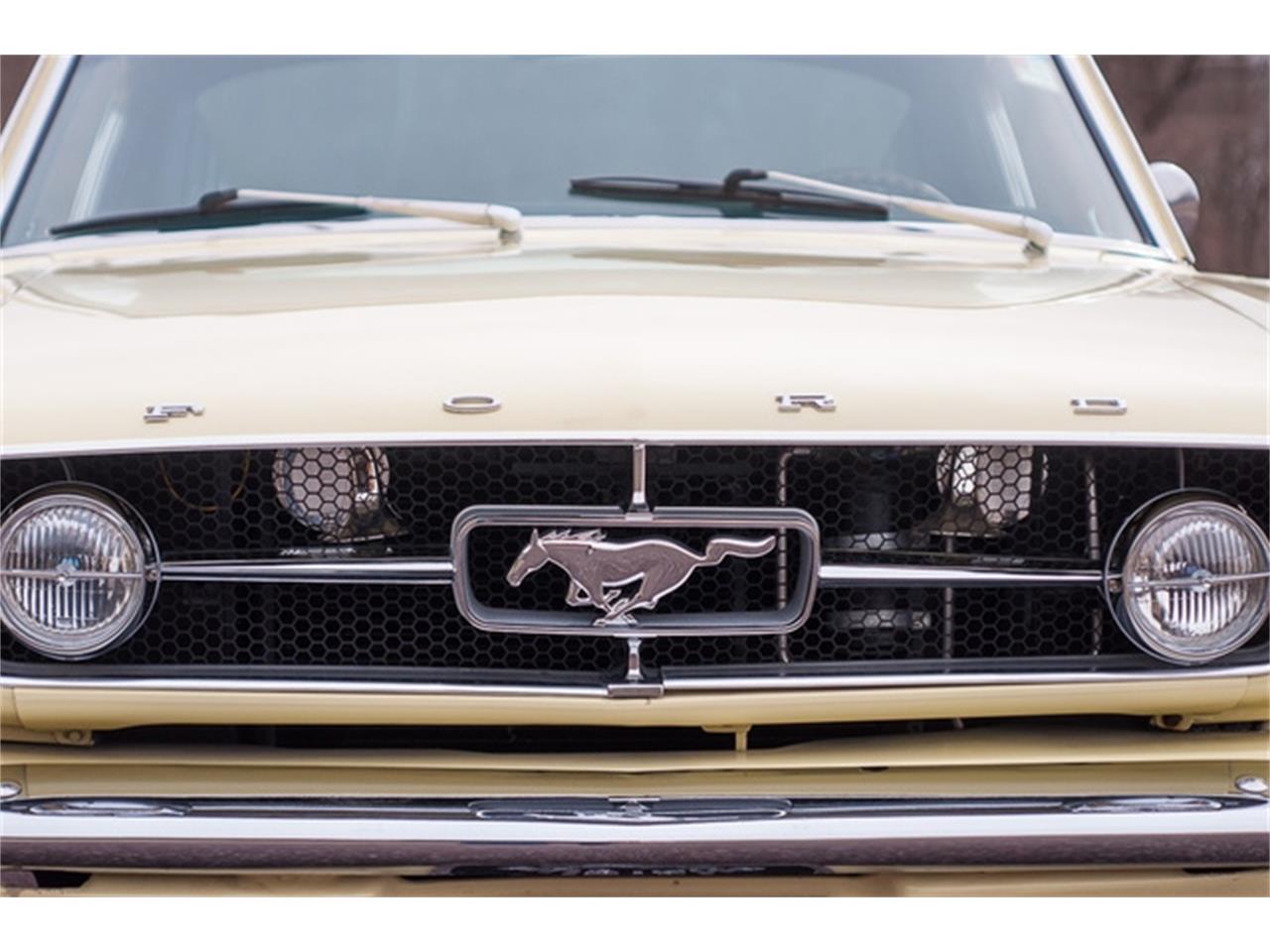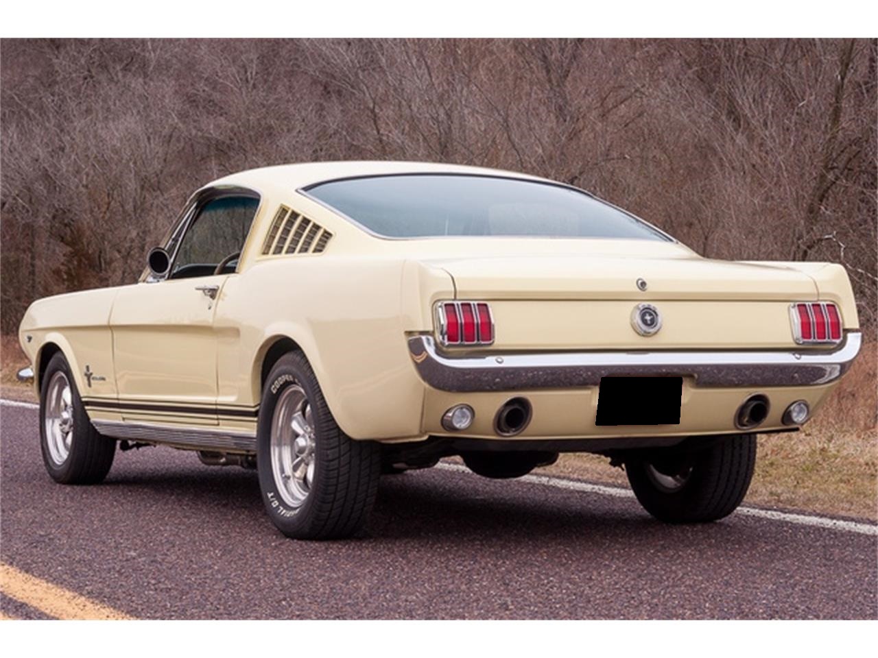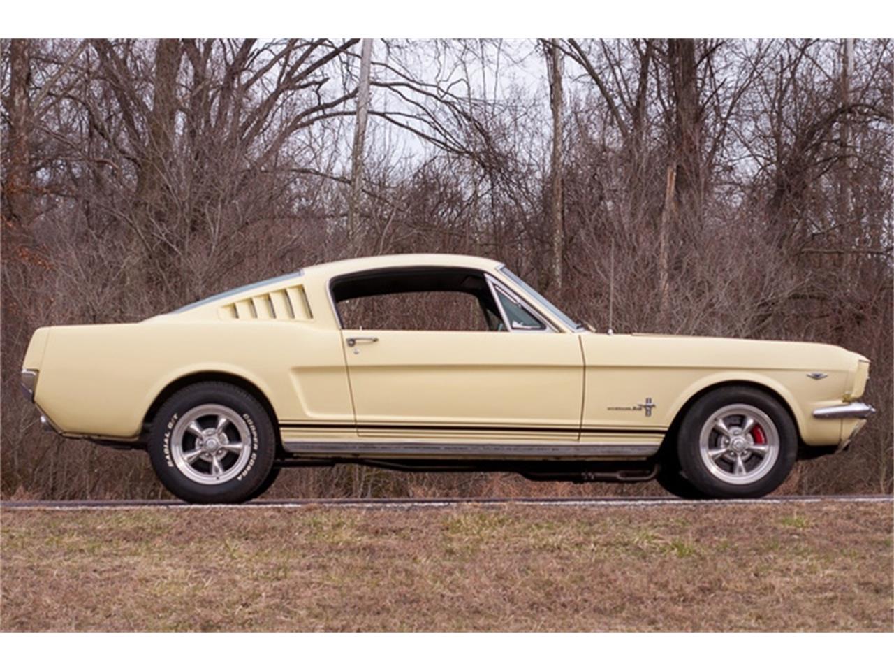 1965 A-code Ford Mustang 2+2 Fastback 289 CID Windsor V-8 engine with a four-barrel carburetor (VIN code A). A- Code Mustang Fastback with some GT equipment (dual exhaust, fog-lights and front disc brakes). Five-speed manual transmission and 3.25 gearing. Correct Springtime Yellow exterior with original black vinyl interior (code 26). Vintage air-conditioning and power brakes with Wilwood front discs. American Racing wheels. Paint and trim are in overall great condition. The body panels are straight. The engine bay is extremely tidy. Full-size spare tire mounted in a steel wheel and a spare tire cover. The chrome bumpers are in very good shape, too. This horse rolls on Cooper Cobra Radial G/T tires, size 235/60R15 in the back, and Cooper ES3 Touring radials, size 205/60R15 in the front. Inside, the car retains its original black vinyl interior (code 26). The black buckets in front and rear bench are in great shape, as are the matching carpet and headliner. The black instrument panel and inner door panels look great.