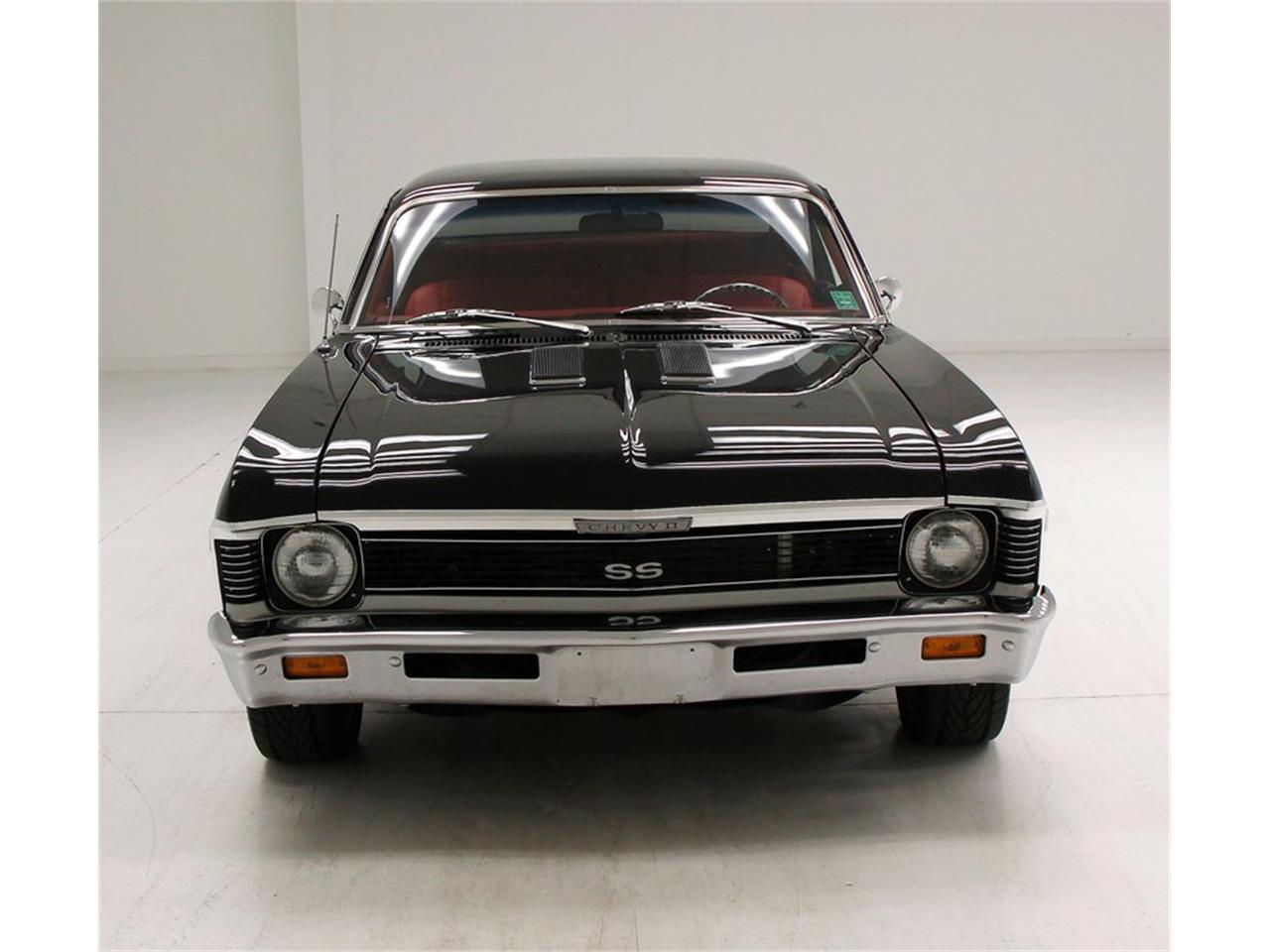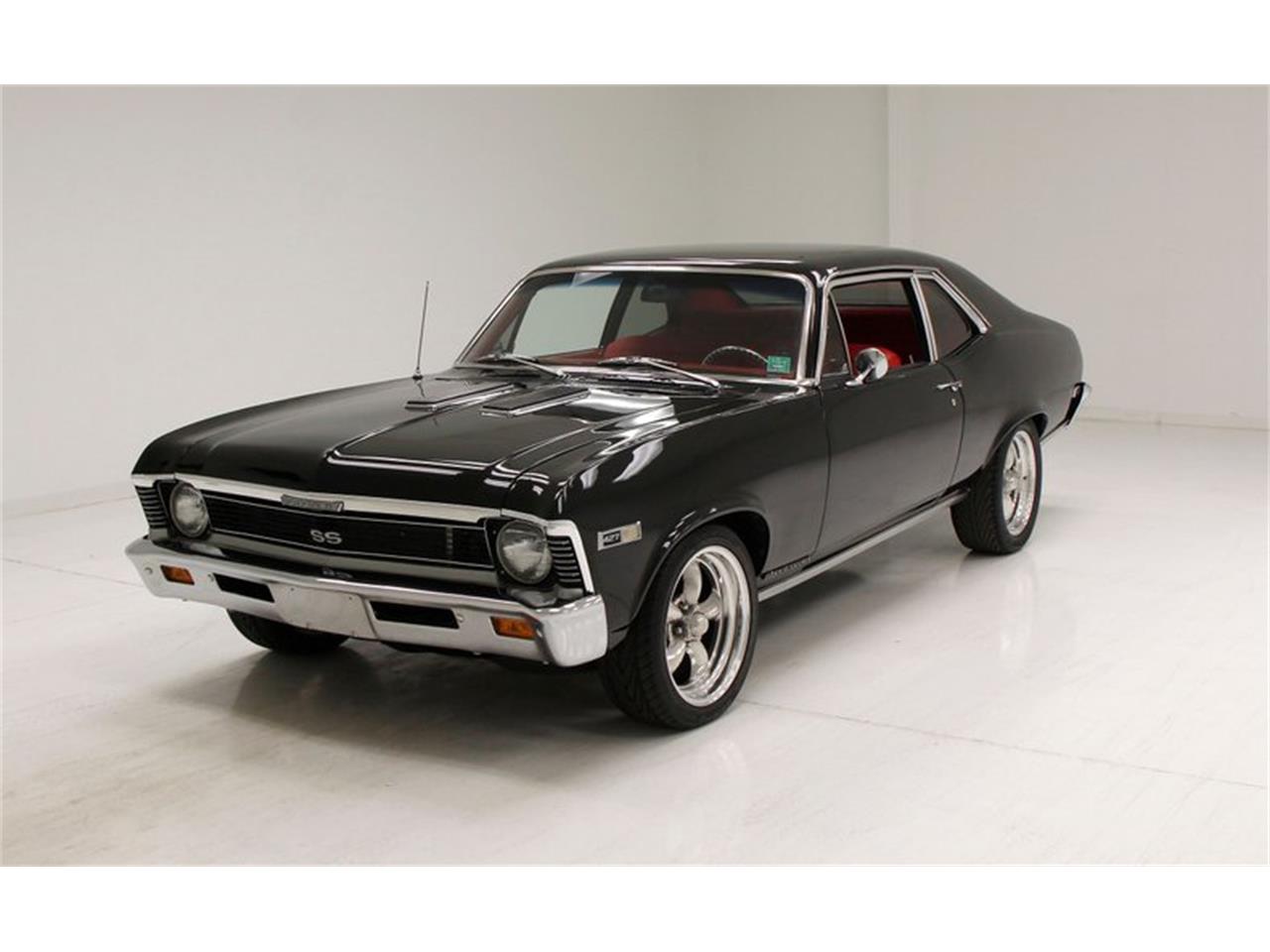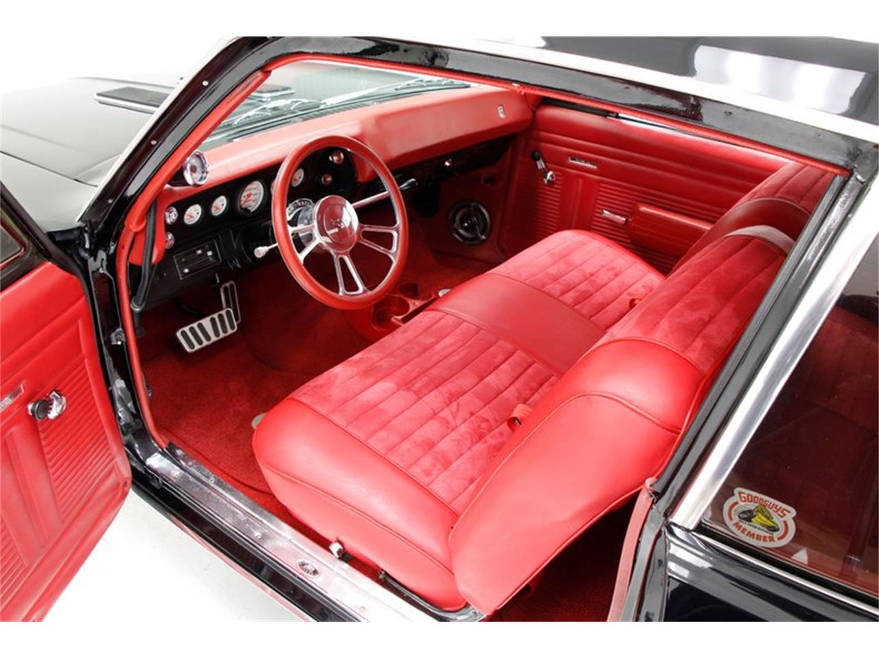 1968 Chevrolet Nova. Powered by a 454 V8 circa 1973-1990 which pushes power rearward to a 10-bolt rear through a TH350 3-speed automatic transmission. Edelbrock Performer 2.0 intake, and a chromed 427 badged air filter covering a 4-barrel Holley carb. Red carpet floods the floors, and is very clean as is a tight, you guessed it, red felted headliner. The front bench stretches from door panel to door panel which are also red, and done up real snazzy like with clean badging and chrome cranks with black knobs. Textural eye candy continues on the rear matching bench. Peering to the hood we note a custom dash with a simplified black smooth panel for the instrument cluster made up of white faced AutoMeter gauges airflow sliders and a digital Kenwood which is attached to a Custom Audio amplifier system, and then the rear woofers and tweeters.