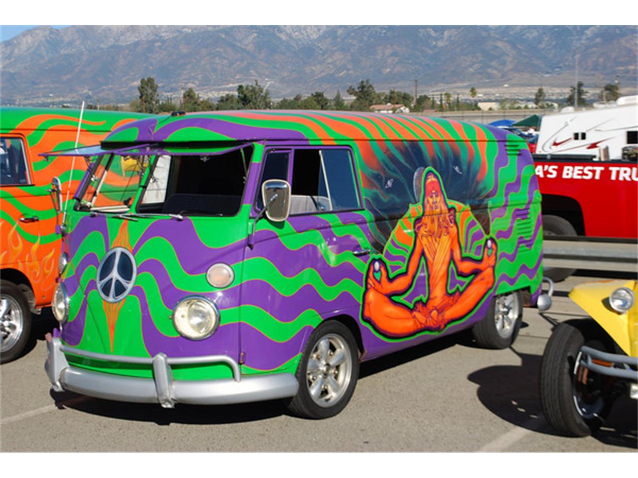 Jo, 1967 bus has been lowered with drop spindles in front and an upside down bug trans axle in the rear, with Empi style wheels.