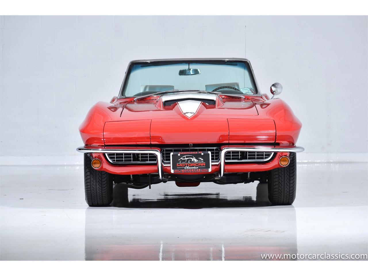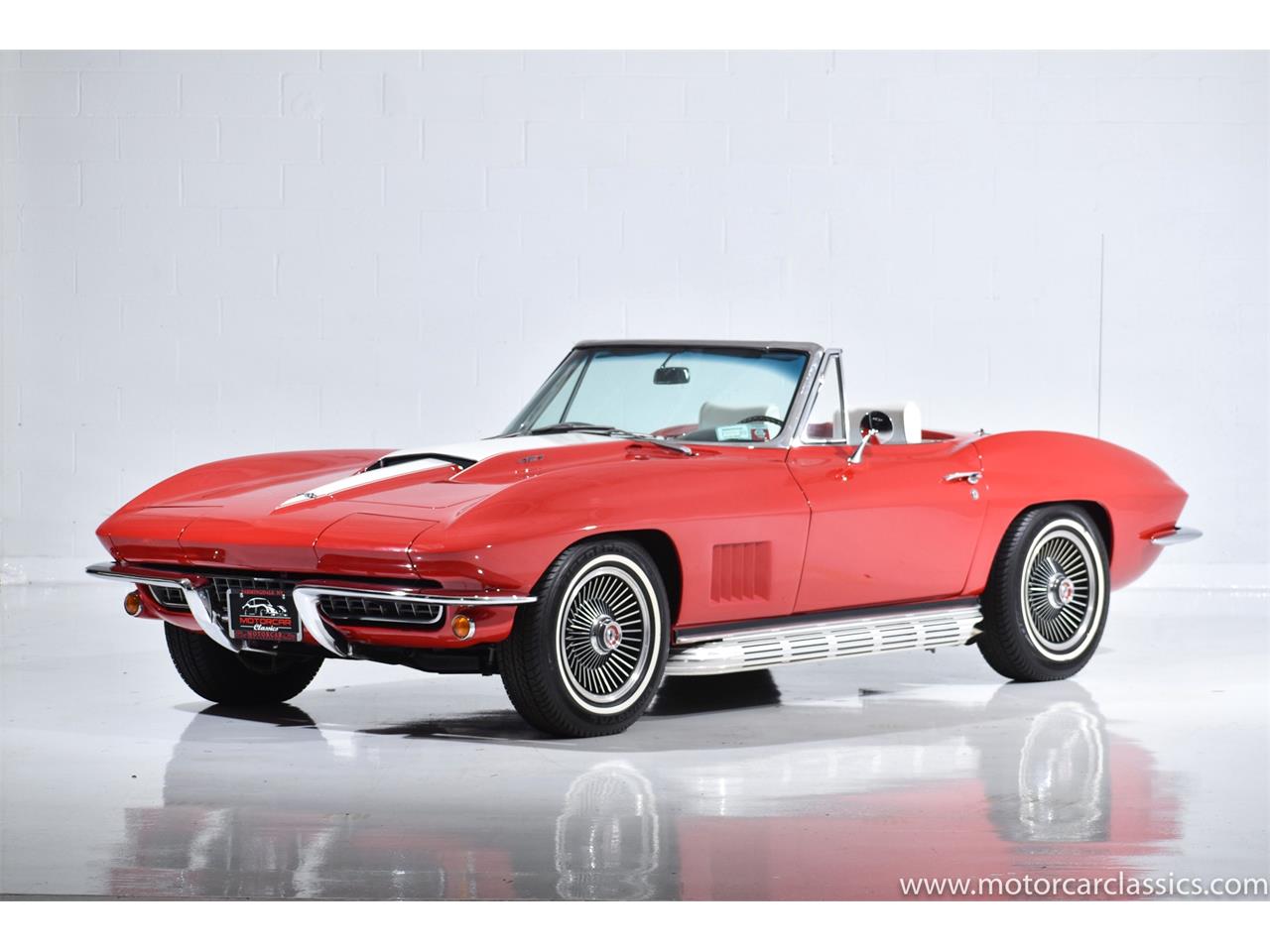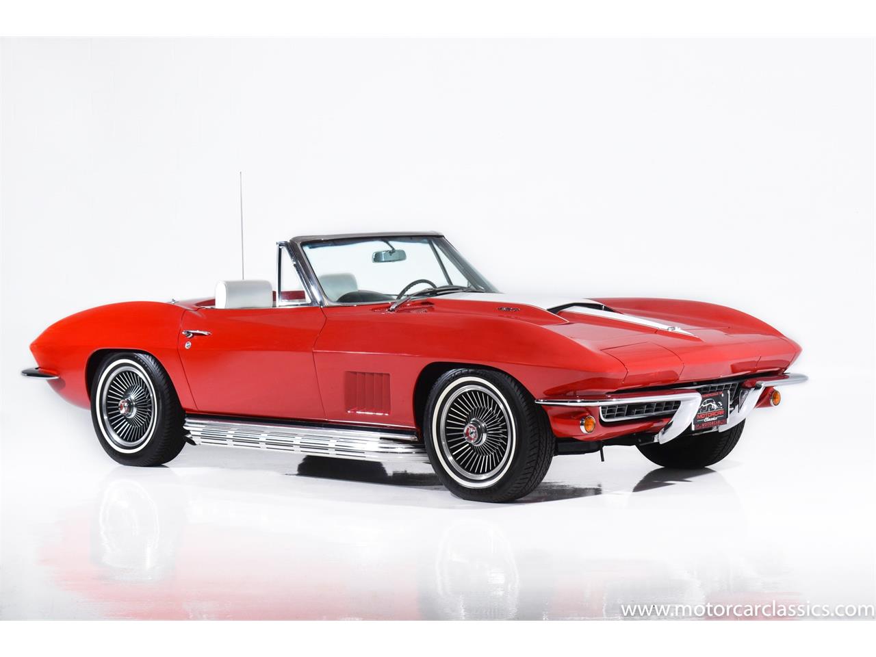 1967 Chevrolet Corvette 427 for sale! Motorcar Classics is proud to present this stunning 1967 Chevrolet Corvette Roadster featured in Rally Red with white vinyl interior, including rare headrest seats, black carpets, and white convertible top.