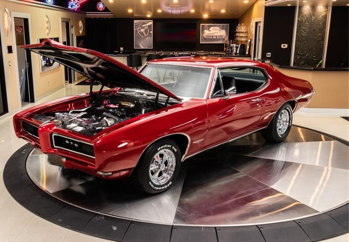 1968 Pontiac GTO. This GTO has a beautifully straight body, Tri Coat Red Paint finish, Black Interior, Hood Scoops, Hideaway Headlights, New Chrome Cragar Wheels, along with Polished Components inside and out that s sure to turn heads wherever you go.
