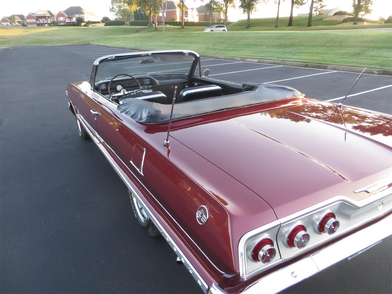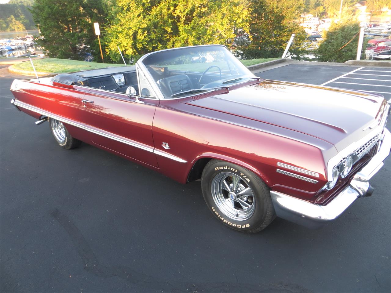 1963 Chevy Impala Super Sport Convertible. palomar red, white top and black interior, 409 CI, 400HP, Turbo 400 automatic transmission. Very rare original factory installed air conditioning. Very original body, no rust. Shows very well. Holley Sniper EFI, EFI hyper spark ignition and distributor, aluminum radiator with two electric fans, front disc brakes. SS wheels with new BF Goodrich tires. If you don't like the EFI and want to go back to the classic fuel system the original four barrel carburetor, fuel pump and distributor are available.