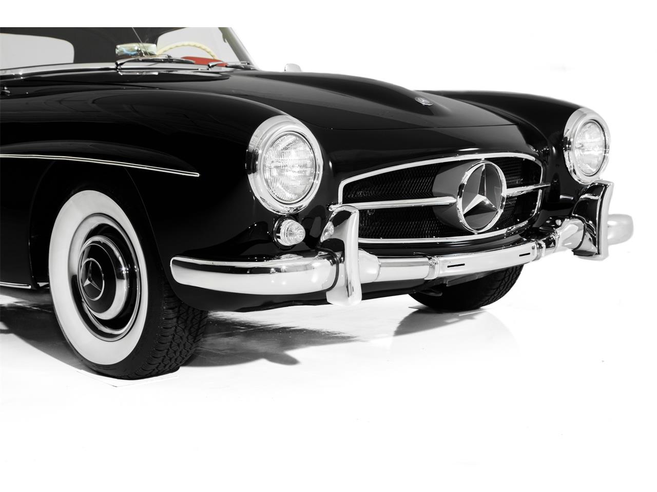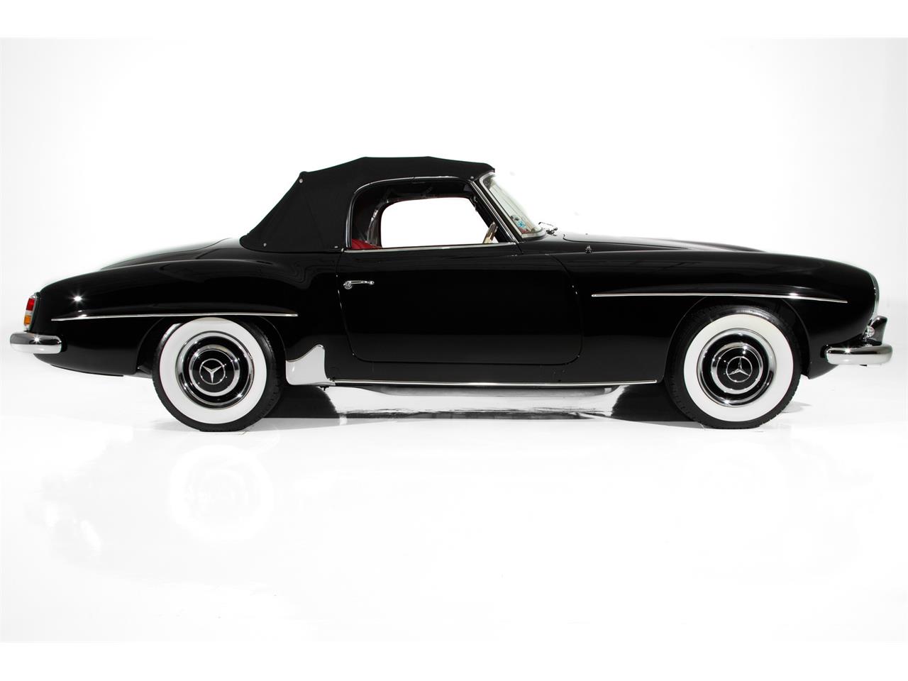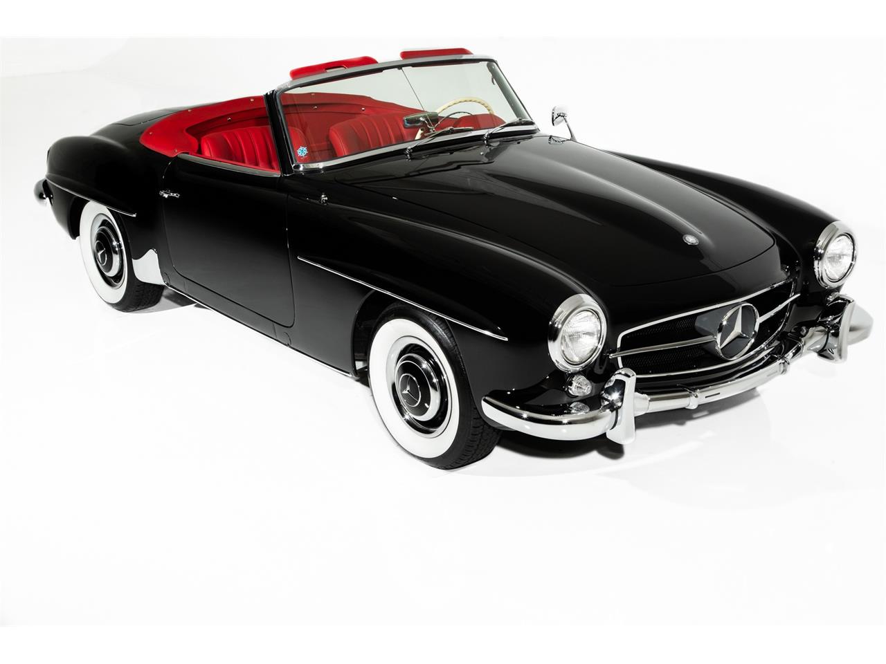 Stunning factory black Mercedes-Benz 190SL convertible with lush red leather interior. Low mileage 30,000. Laser straight body with perfect lines and show chrome are what you would expect for a high quality, investment grade Mercedes-Benz. The amazing original floors are still covered in the factory color as well as factory torque markings on the suspension all lends to substantiate a low mile car. This car has its original engine tag and matching stamped motor number, front chassis plate with matching chassis stamp and firewall tag. Original drive train, 1.9 Liter 1897cc engine Show quality detail on the engine compartment 4 -Speed manual transmission Original tool kit Original tire pressure gauge in original wooden box Original electrical fuses in original box.