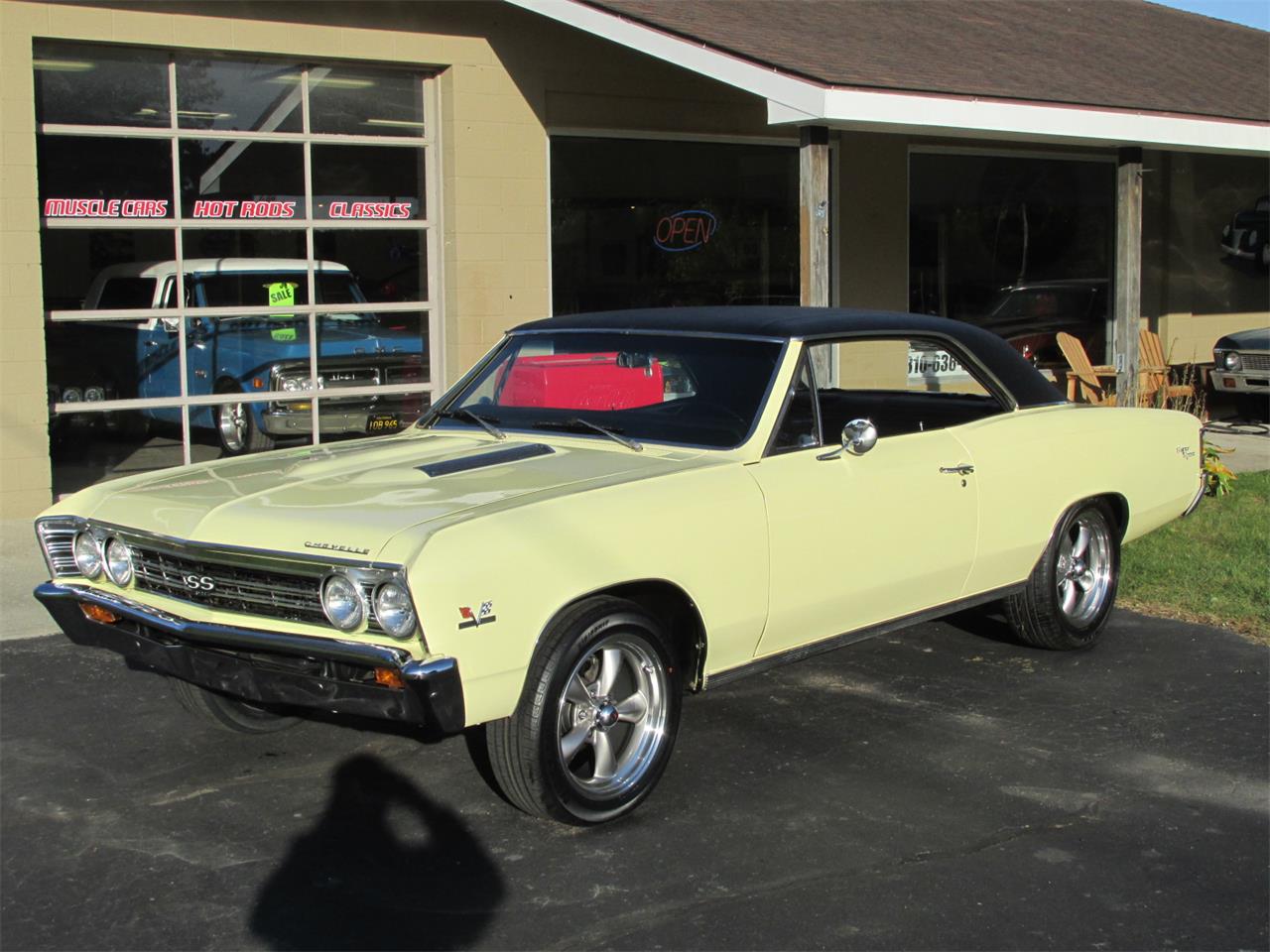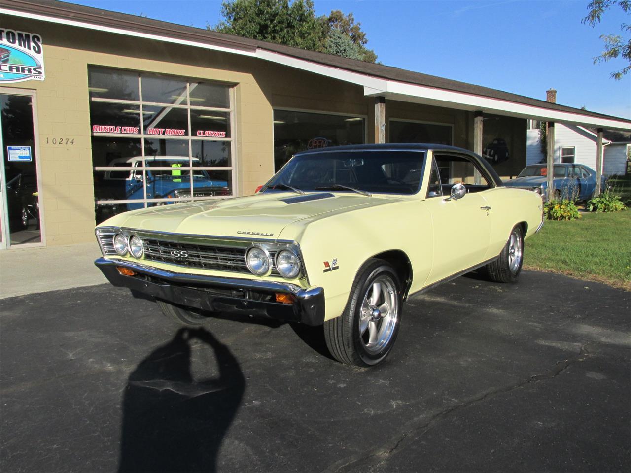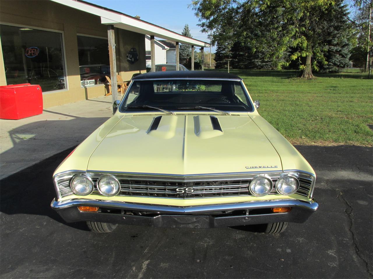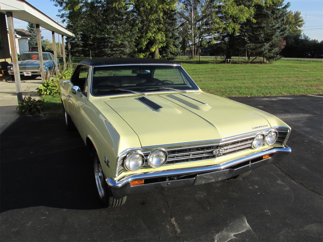 Very nice 67 Chevelle SS 396, 138 VIN. Butternut Yellow slick base coat clear coat, factory black vinyl top. All glass is original in very good condition. All chrome and stainless are original in very good condition. Factory black bucket seat console interior. Factory gauge package with blinker tach, AM/FM/Cassette direct fit stereo with front and rear speakers, tilt wheel, factory 3 spoke SS steering wheel. Front and rear seat belts, original center console with correct shifter and working clock. Under the hood 396, 375 horse, ARP fasteners and head bolts, hydraulic cam, factory 375 cylinder heads with roller rockers, 3/8 push rods, factory GM aluminum snowflake 4 barrel intake, Edelbrock carb with electric choke, electronic ignition, hi-flow aluminum water pump, updated 1 wire alternator, chrome power steering pump, billet brackets and pulleys, heavy duty direct fit aluminum radiator with correct shroud and fan, also has auxiliary electric fans, set of long tube Hooker headers with 2 1/2 inch dual exhaust out the back, power steering, power front disc brakes. This strong running 396 is backed up with a 400 turbo trans, 12 bolt posi rear end with 331 gear. REV Classics 17x7 215/55/17 front and 17x8 235/55/17 rear. Factory jack and spare, custom car cover. Everything works on the car as it should.