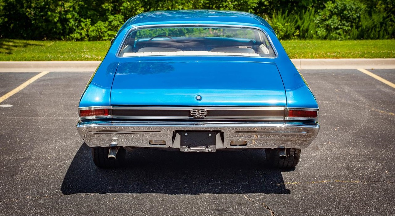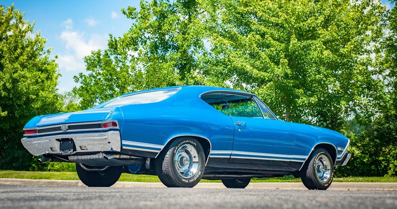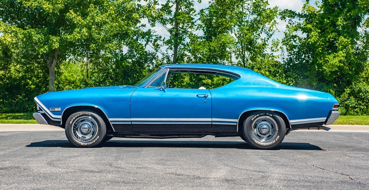 Chevelle body styles, the 1968 Chevelle SS. This fine example is painted in a Metallic blue, and has the classic white vinyl interior that just sets her off. This SS is powered by a rebuilt 396 cu in big block with a new 4 barrell carb, rated at 325 hp, mated to a Muncie 4 speed manual transmission, 12 bolt positraction rear end with 3 55 gears. The sound that this big block puts out is amazing.