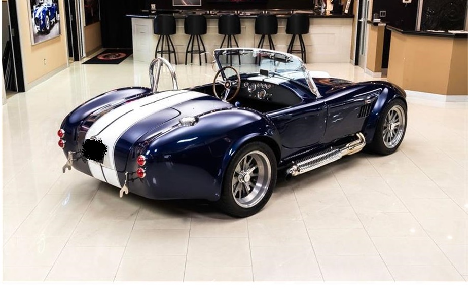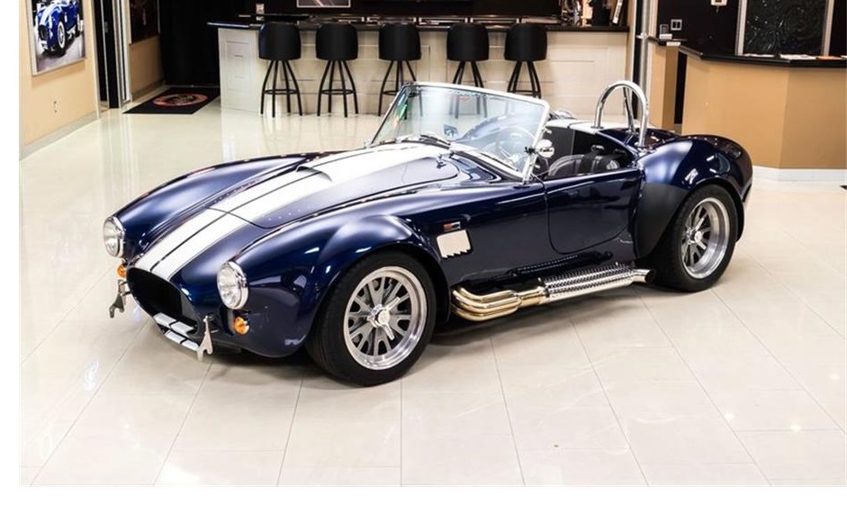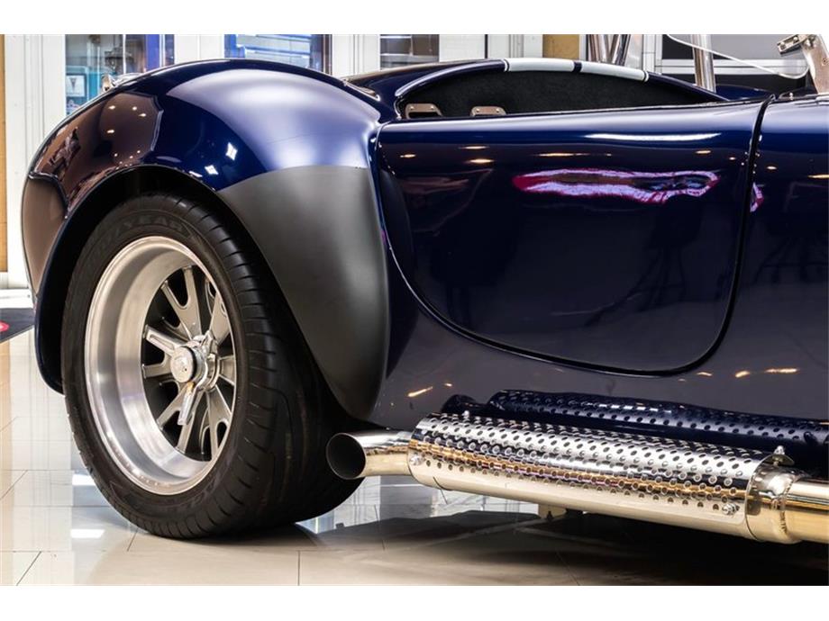Check out this gorgeous 1965 Shelby Cobra.This Backdraft Cobra is sporting a shimmering Blue Paint finish with Painted White Stripes, a Black Interior, Polished Side Pipes