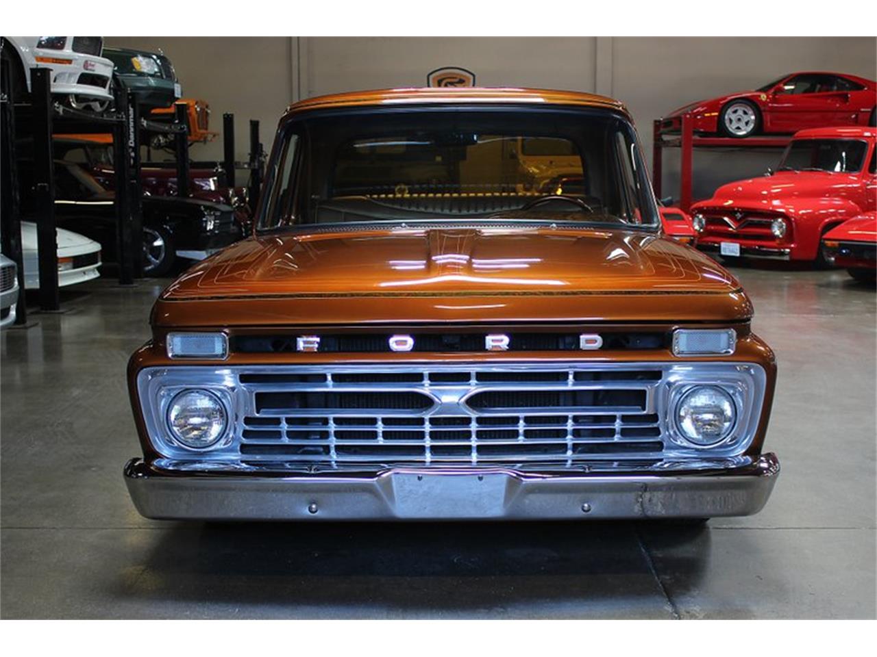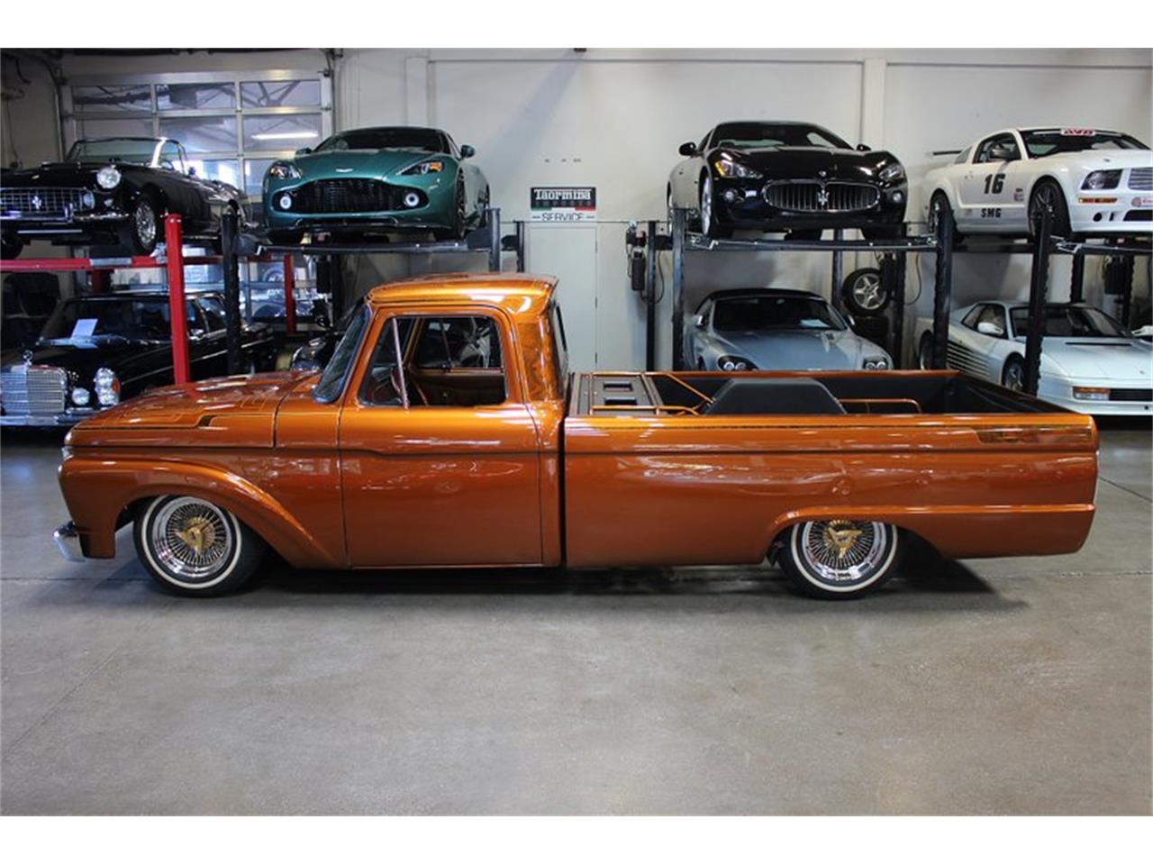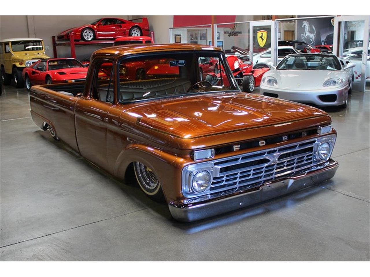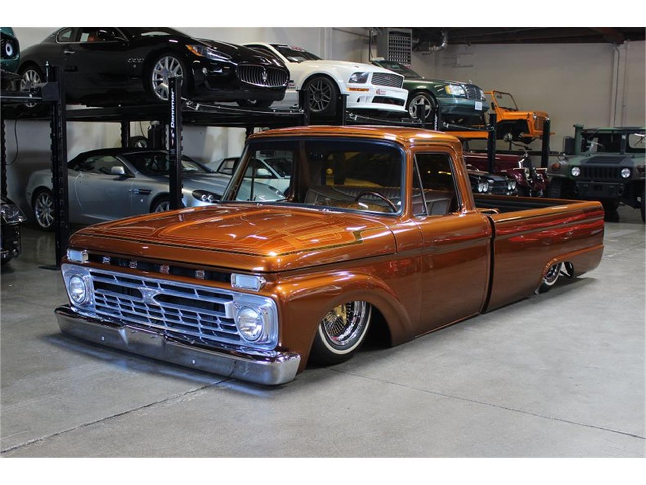 1965 Ford F-250 Custom Build Pickup Truck, Golden -Brown exterior w/Tan interior. 7,040 miles on odometer. PAINT & BODY WORK: House of Kolor Kandy Copper pain with custom airbrushing -Filled enclosure behind the cab. Shaved door handles, mirrors and antenna -Shaved frip rail with new molded peak. Wheel enhancement polished and chromed, OEM grill, tail lamp and turn signal doors. DRIVETRAIN: Chevy 350 cid V8 Edelbrock cam, head, intake and carburetor Patriot headers. Turbo 350 transmission modified with B&M shift kit -Ty Snyder Welding 2 piece drive shaft. Fishtail exhaust pipes -Speedway stainless steering column with quick disconnect. RCI 20 gallon aluminum fuel cell mounted in the bed. CHASSIS & FABRICATION: Firestone airbags Fully painted frame Custom-trussed links for max lift and smoother ride. 1976 Camaro sub-frame clip. 2" Superior drop spindles. 15 x 8" chrome Dayton wire wheels.