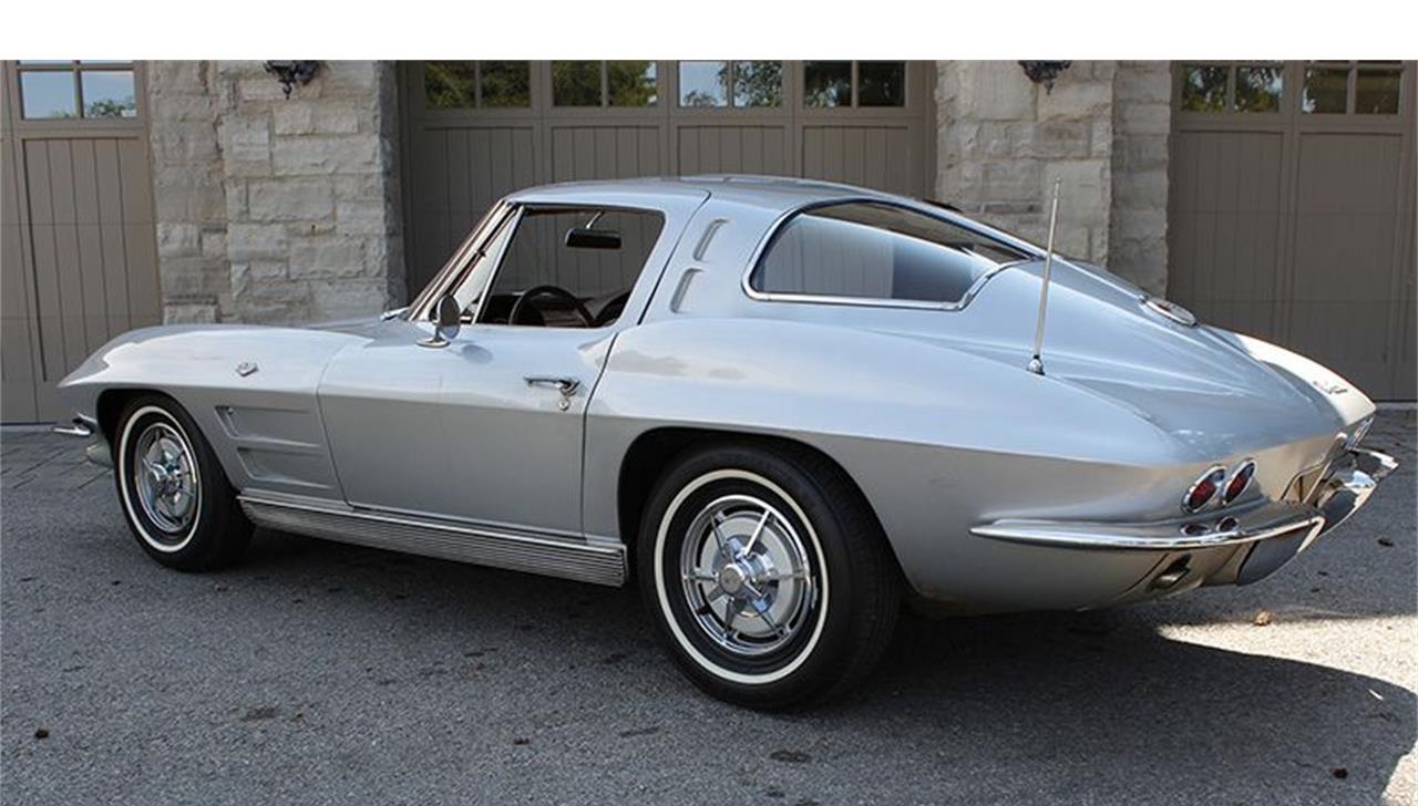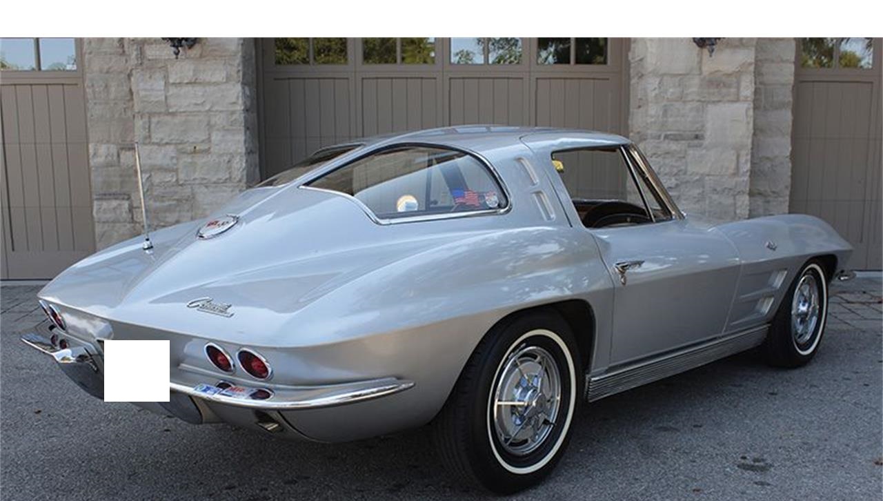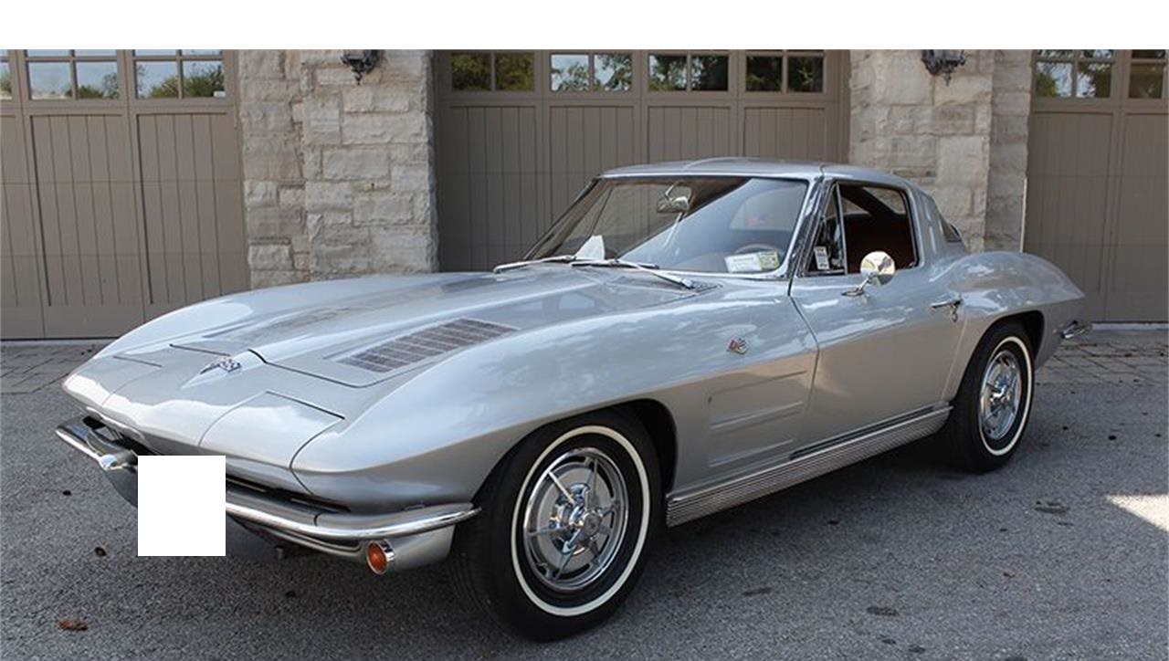1963 Chevrolet Corvette Sting Ray Coupe. Factory options included the numbers matching 340-horsepower L76 327 engine, numbers matching four-speed manual transmission, leather upholstery, Wonderbar AM radio, and whitewall tires. While black leather upholstery was specified and ordered, supply shortages necessitated a switch to Saddle instead.