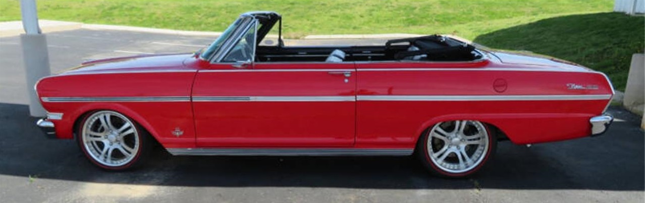 1963 SS Nova Conv. Resto Mod, 383 383hp Engine, Tremec TKO 5 Speed Transmission, 9 Inch Ford Rear End, Power Steering, Power Top, Vintage AC, 160MPH Speedometer, Detroit Speed MiniTub Kit, Wilwood 4 Wheel Disc Brakes with Crossed Drilled Rotors, CPP Tubular Upper and Lower Control Arms, QA1 Adjustable Front and Rear Shocks, Borgeson Power Steering Box, Calvert Racing 2 Lowering Split Mono Leafs, Speedway Instrument Cluster, Custom Jason Rushforth Super Spoke Wheels, Red Line Tires, TRUE SS Resto Mod Chevy II Nova.