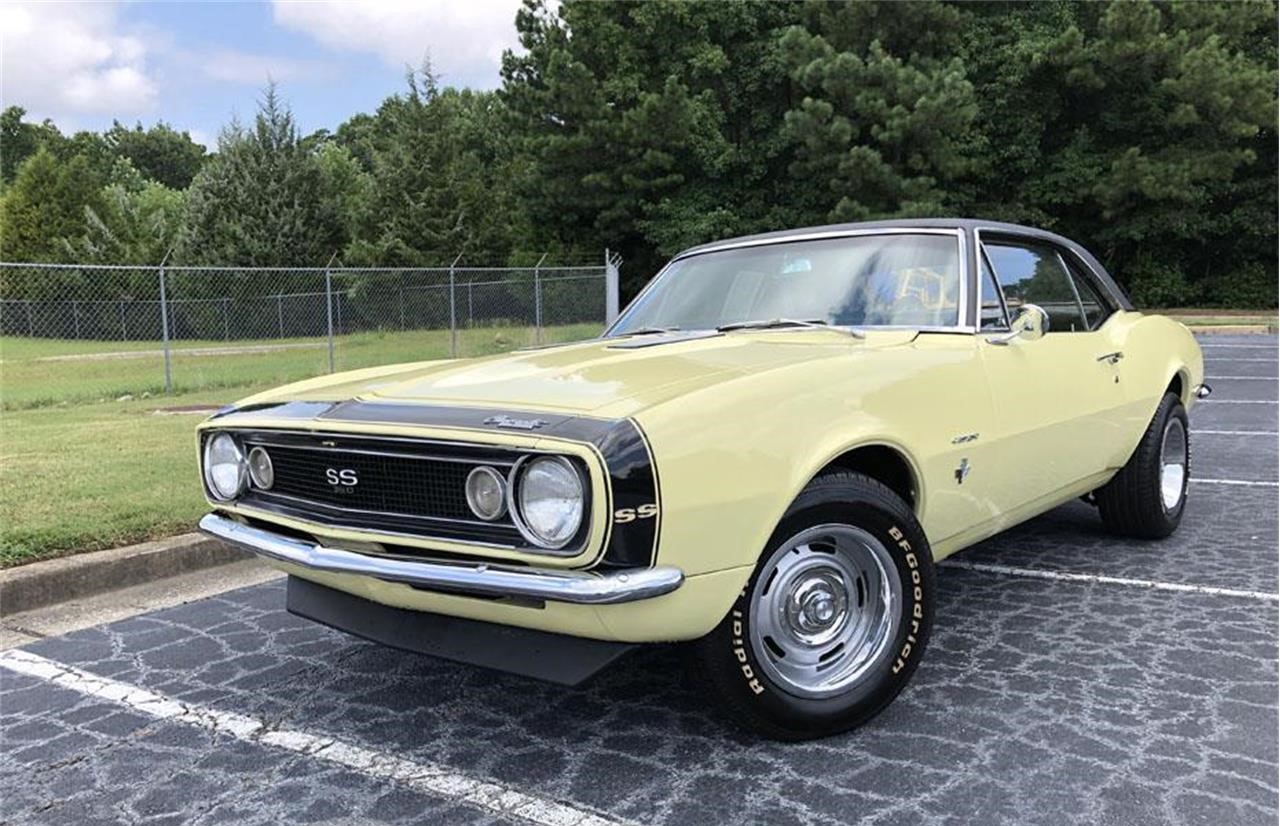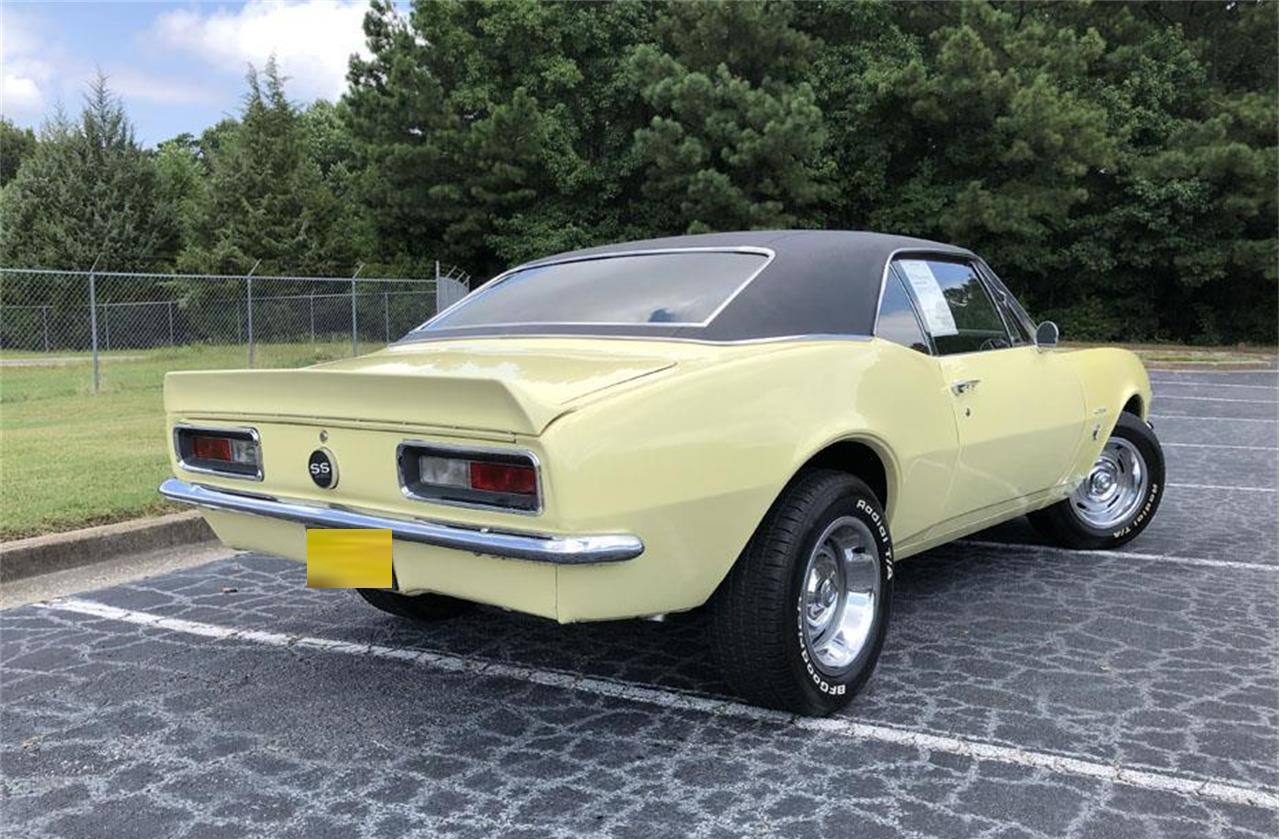 Butternut Yellow exterior, Black interior. 350ci V8 engine, automatic transmission, Great driver. This 67 Camaro is ready to hit the road and do so in style. The exterior yellow paint has a great shine with a nice vinyl top and black nose stripe that is guarantee to turn heads wherever it goes.