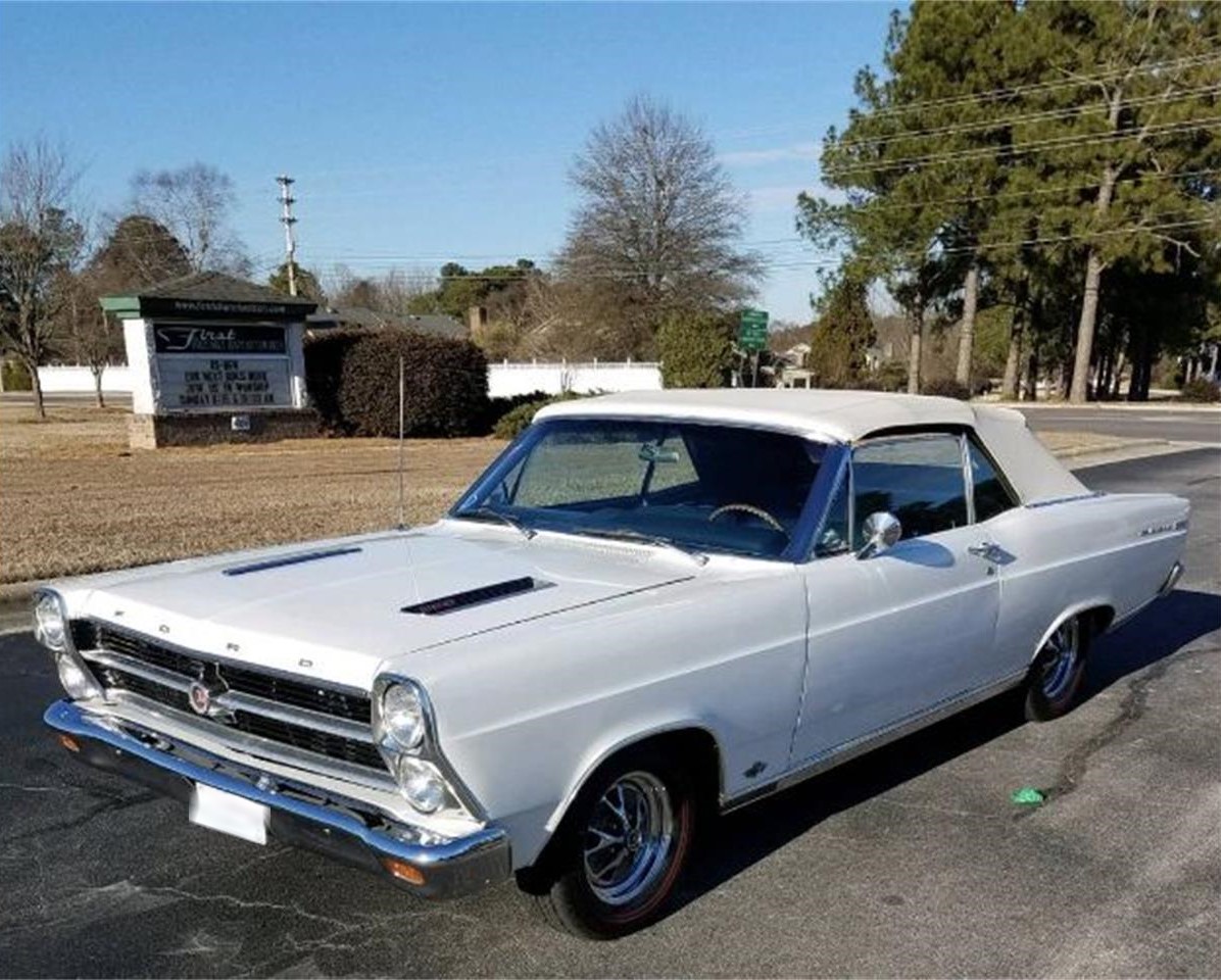 1966 Ford Fairlane XL500 Convertible Emeron white exterior with white top and deluxe medium blue interior.390 with Tripower 428 Cobra Jet cam and pistons, C6 Cruise O Matic, Ford 9 rear end 275 ratio, factory A C, power steering, power brakes added. Remote trunk release, 14 style steel wheels, dual Red Line tires, traction bars, aluminum radiator, power top.