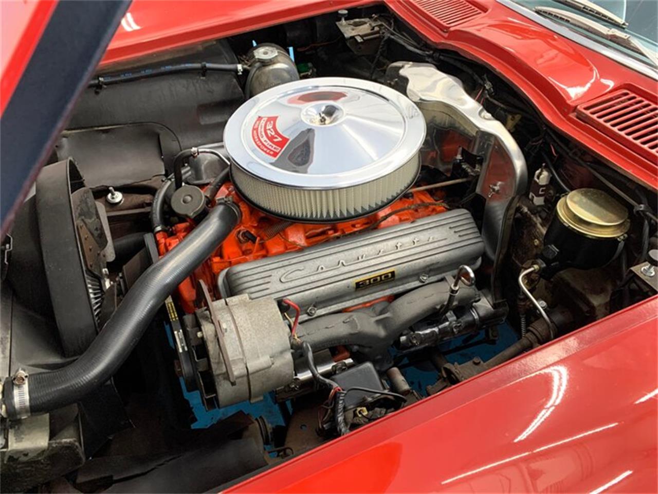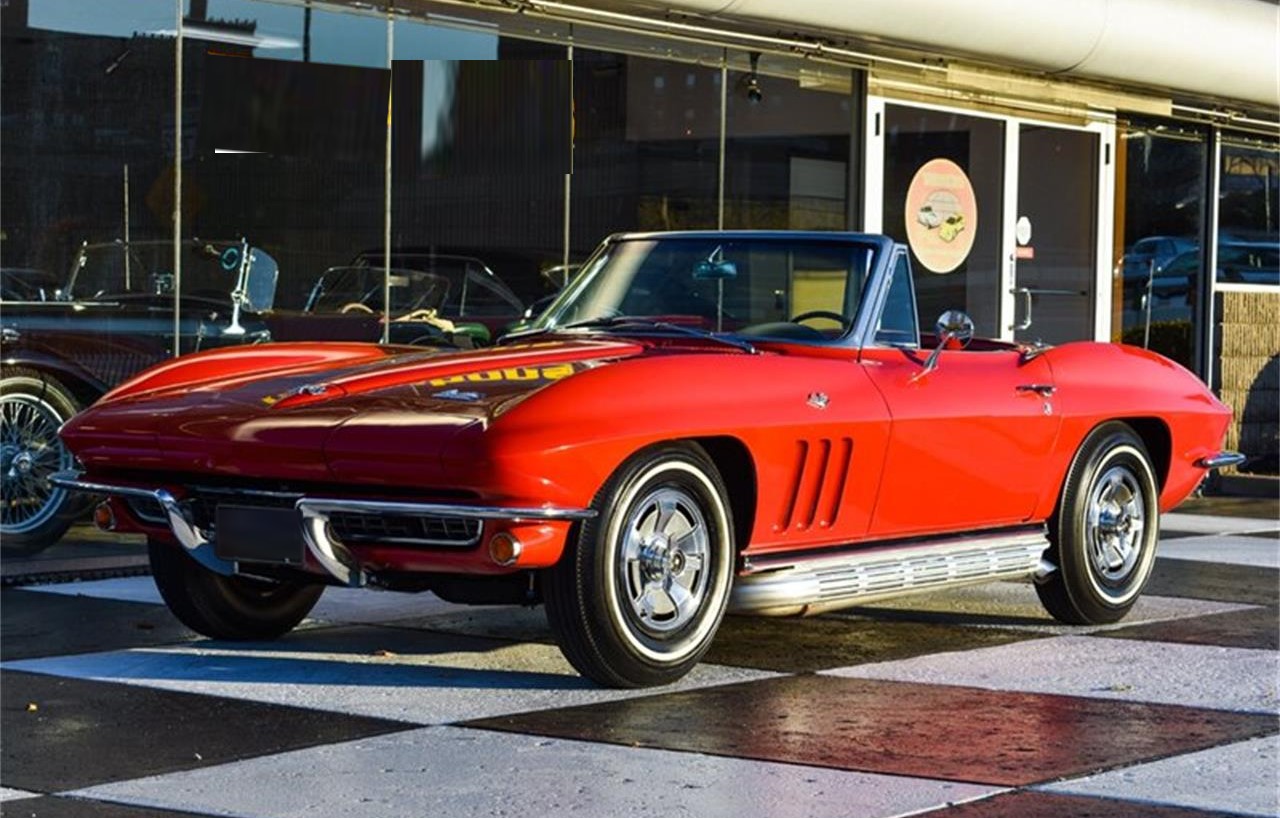 1966 Corvette Convertible Original Color Code 974 Rally Red with Black Interior and White Soft Top. Original 327 300hp with Matching Numbers and 4 Speed Transmission. Features include Factory Side Exhaust, Original AM FM Radio, Factory Tinted Windshield, and Proper Stainless Wheel Covers with Authentic BFGoodrich Silvertown 7.75 15 Whitewalls. The original gauges, steering wheel, console and glovebox door match with their condition suggesting a very gentle life.