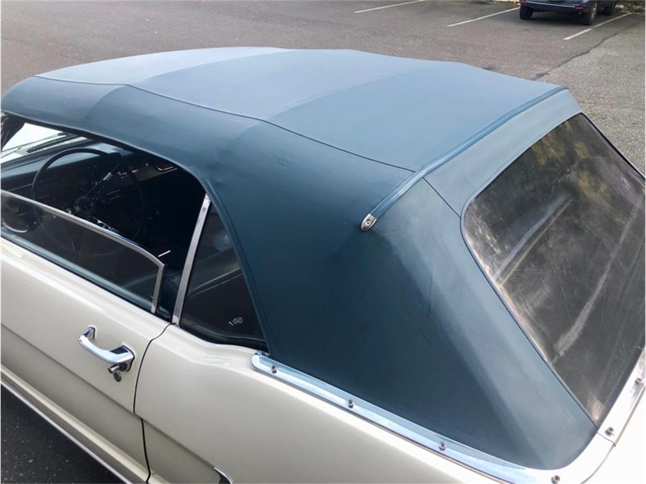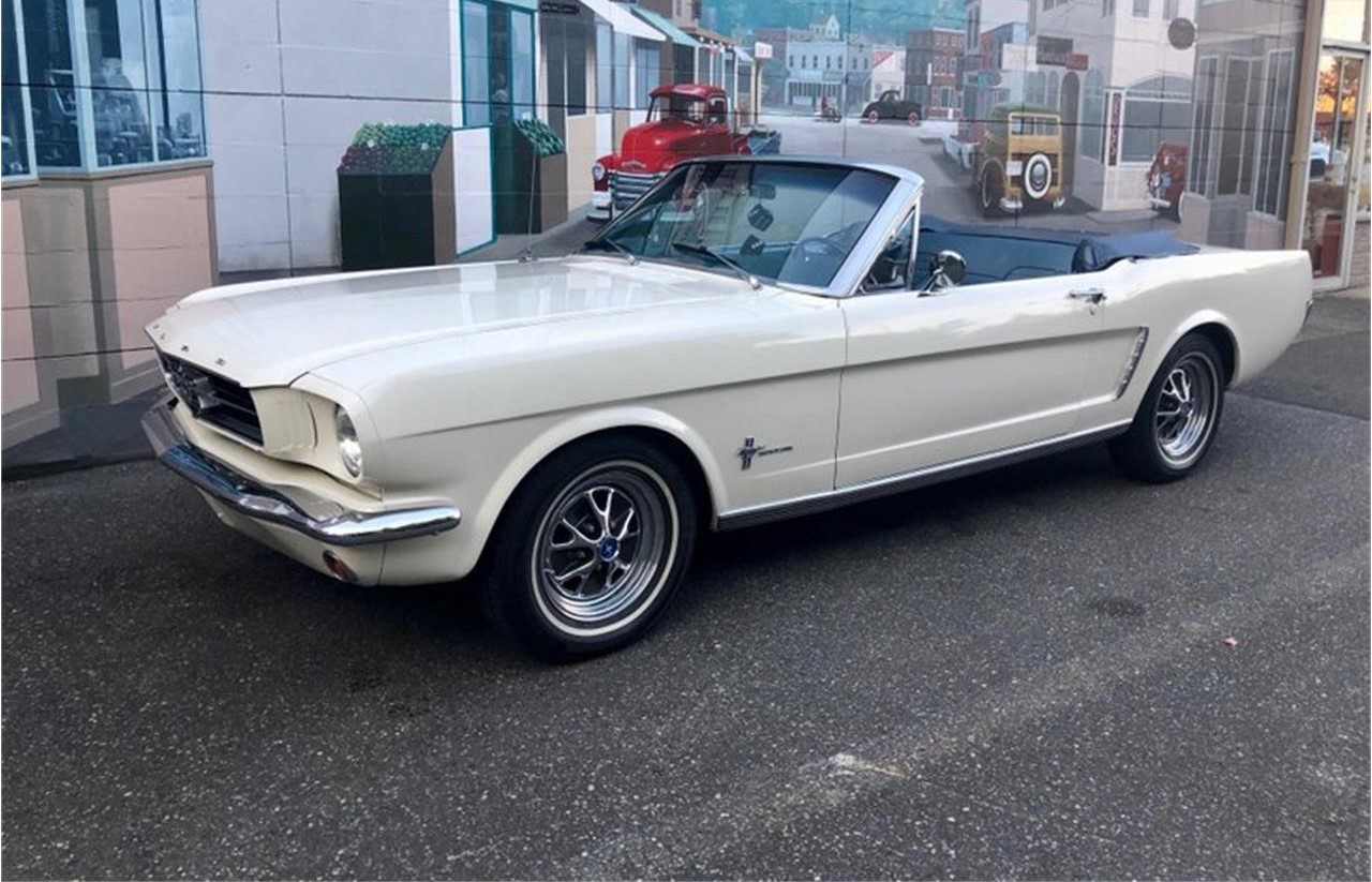 1965 Ford Mustang White 289 V 8 4 Speed Convertible . This is one beautiful Mustang. Very straight body and excellent paint. It s white with blue interior and blue top. All the chrome and trim is excellent. Style steel wheels with white wall radial tires with good tread. It looks like the Mustang was hit way back at some time on the left side.