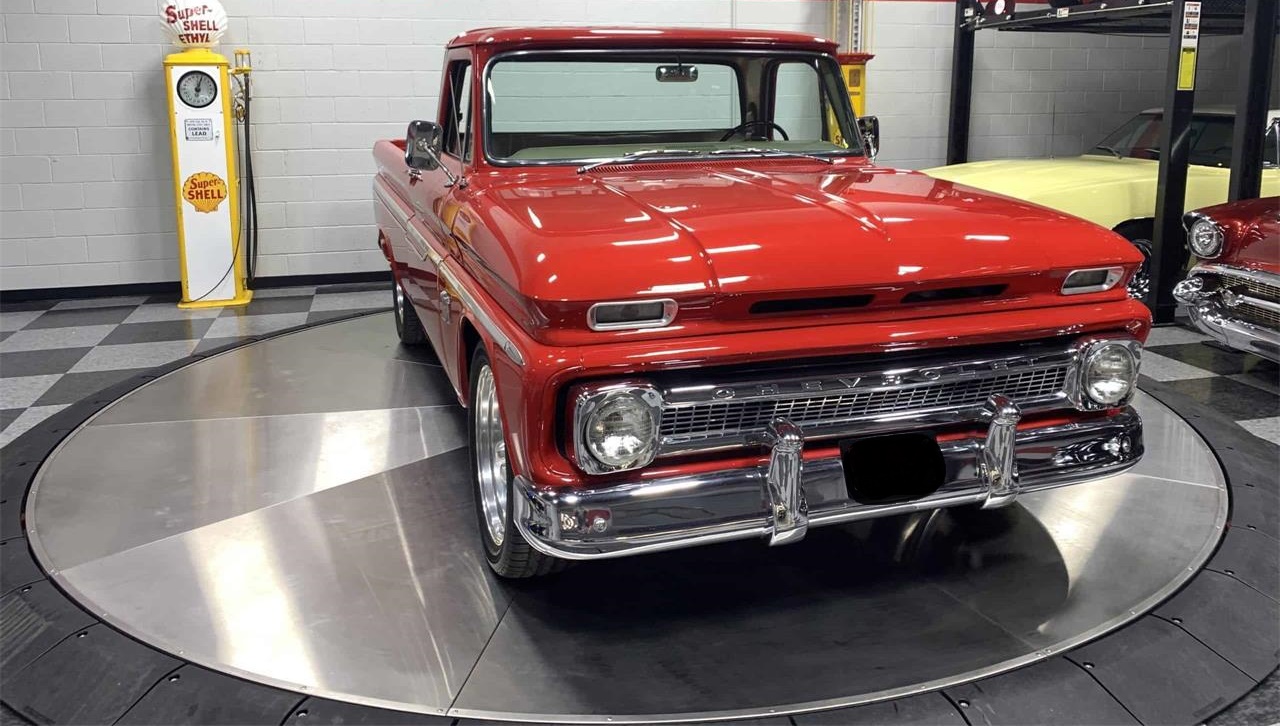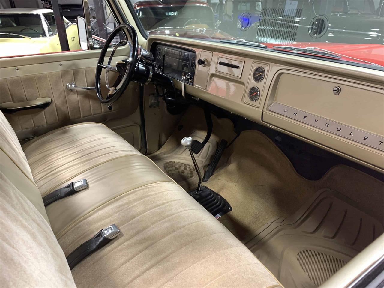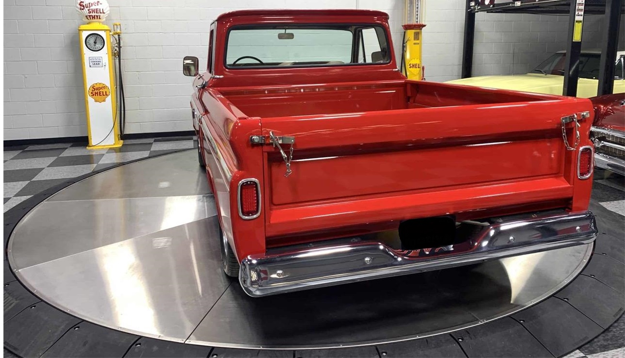 This 1964 C10 pickup is very nice.The interior is truly outstanding, with a light goldflake tan color, a vintage steering wheel with a big chrome horn ring.