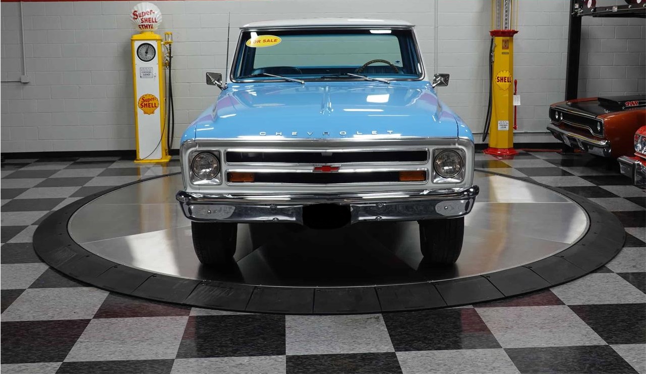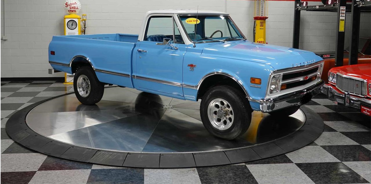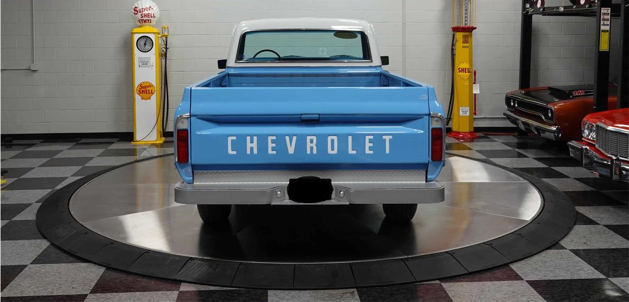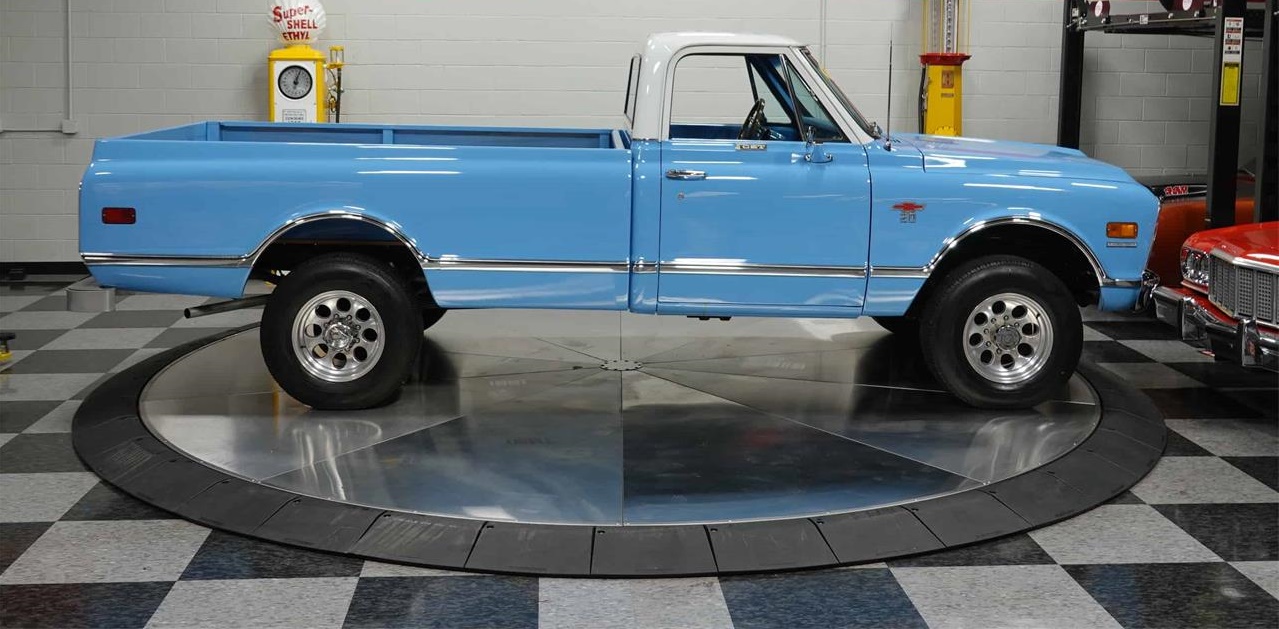 It s a good looking truck with its blue and white exterior and blue interior with a classy woodgrain steering wheel. It also has the rare Buddy Bucket seats for seating versatility.