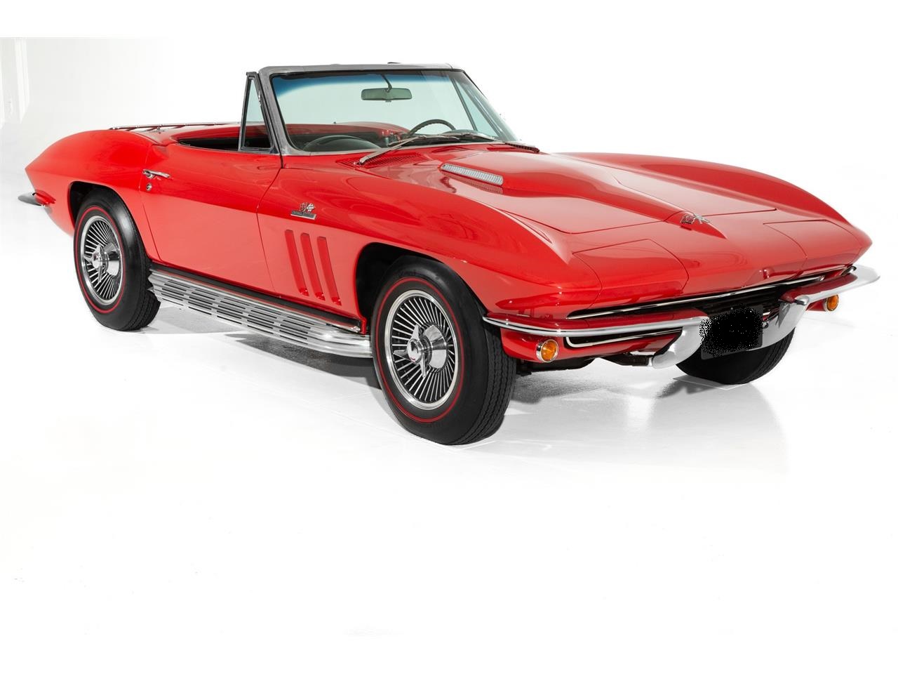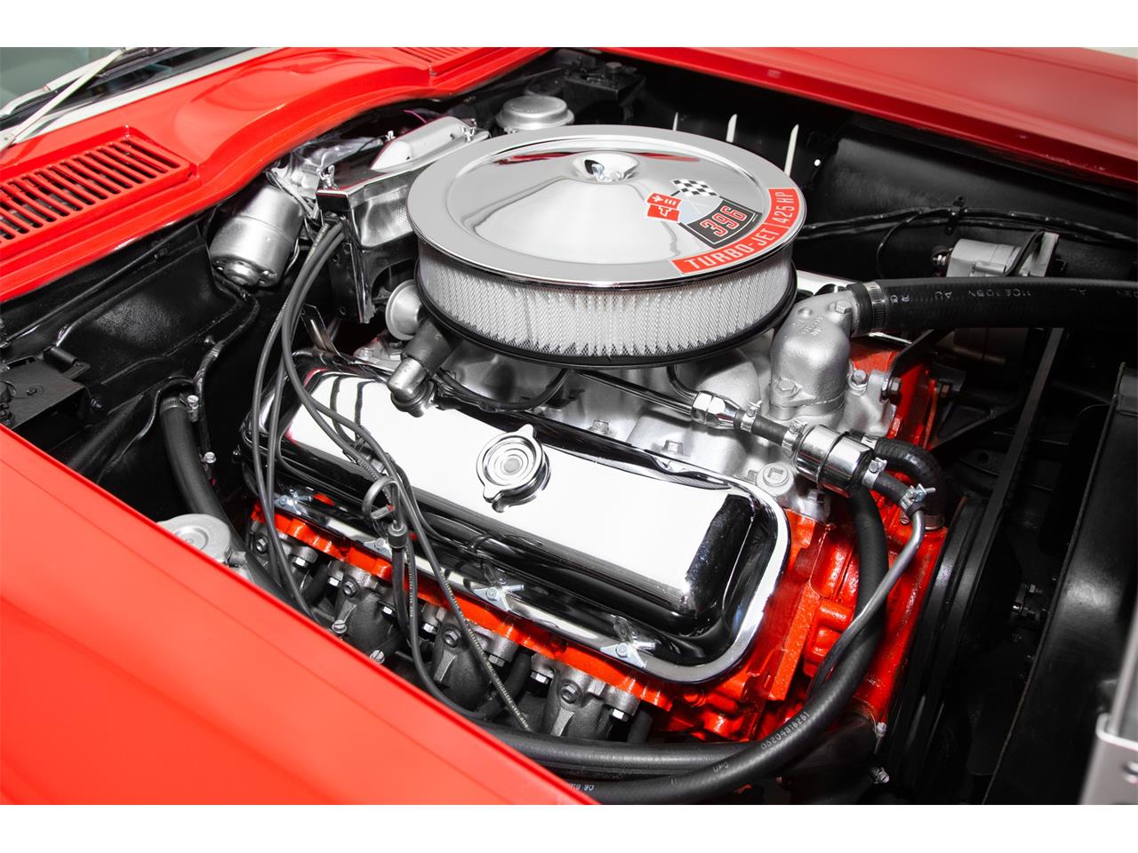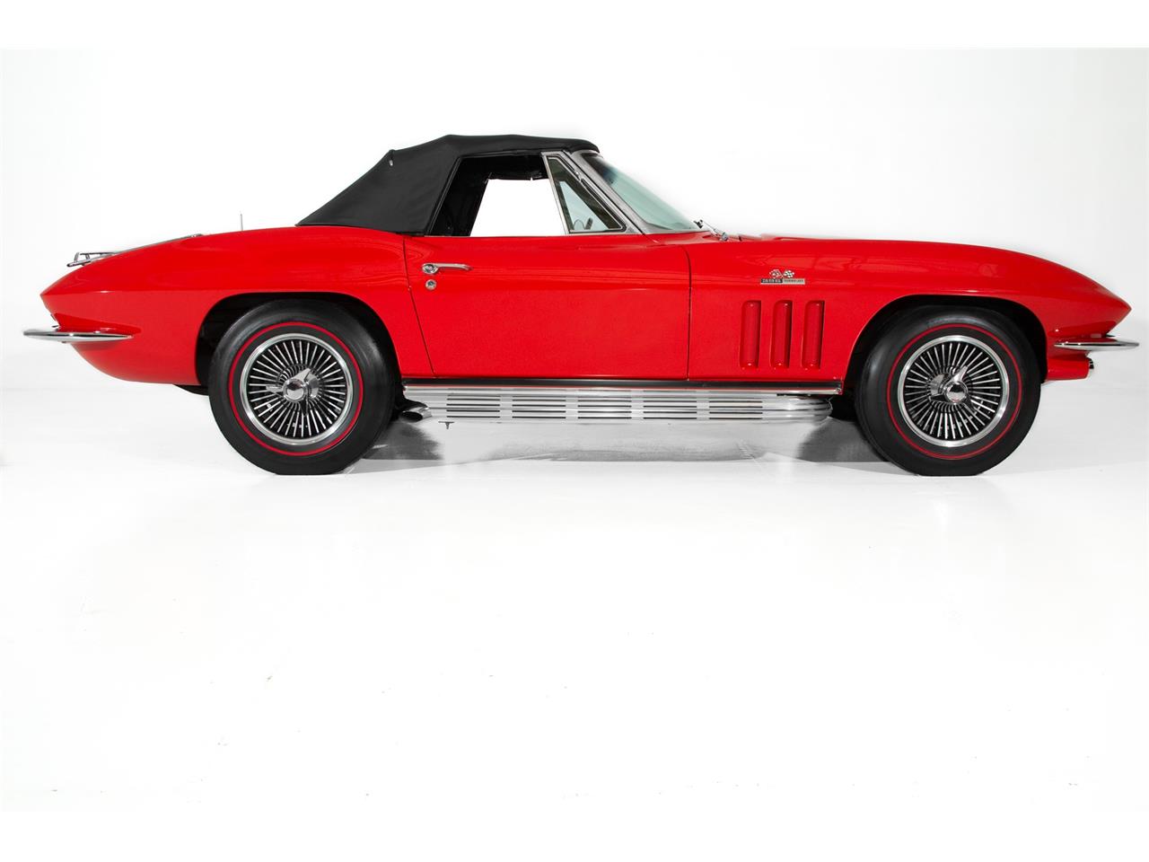 1965 Chevrolet Corvette,The Rally Red paint is very nice and covers a beautiful fiberglass body with great body lines and panel fit.The chrome is also very nice as is the grill trim, and factory side exhaust with slight normal wear. The interior shows very well.