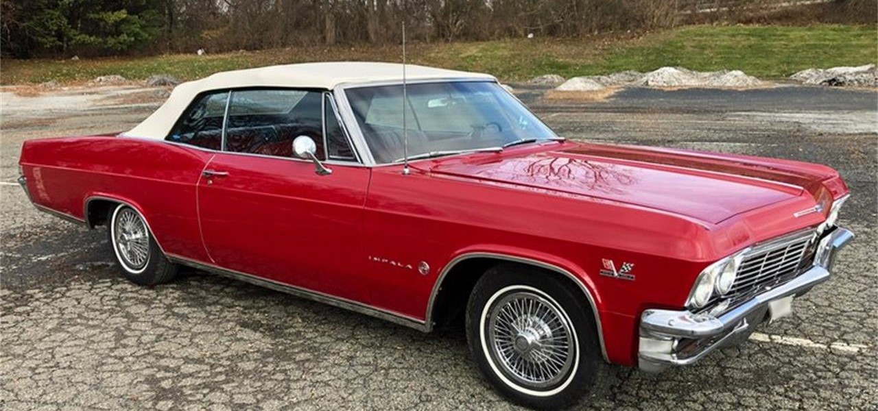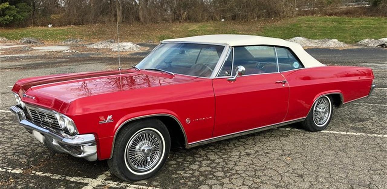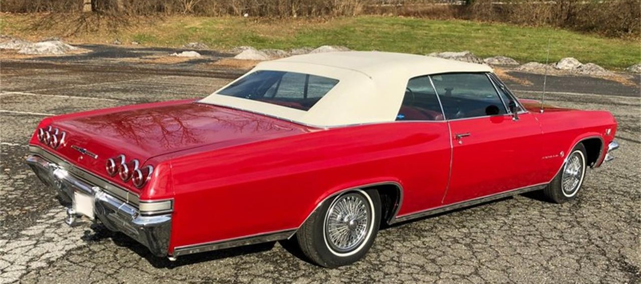 1965 Chevrolet Impala Convertible, rust free, beautifully restored, gorgeous Regal Red paint, immaculate Red interior, perfect White top, stunning chrome and trim, powerful 396 cu in 325 HP V8, 4 speed transmission.