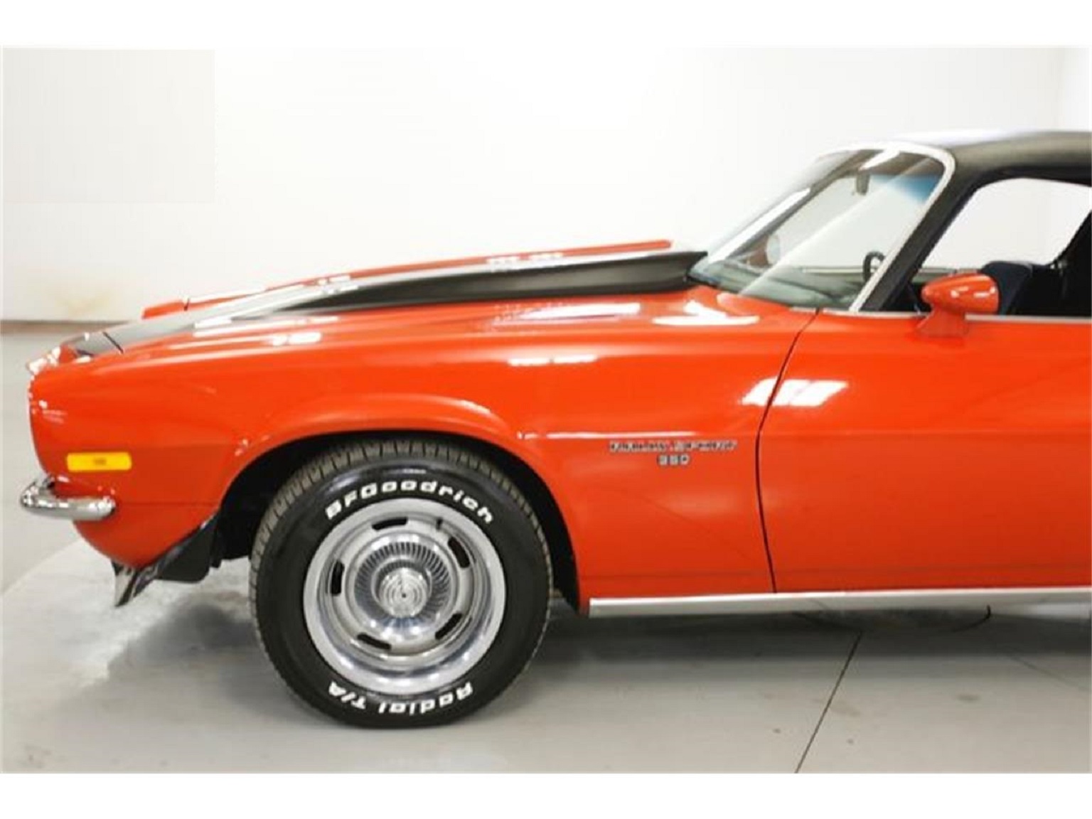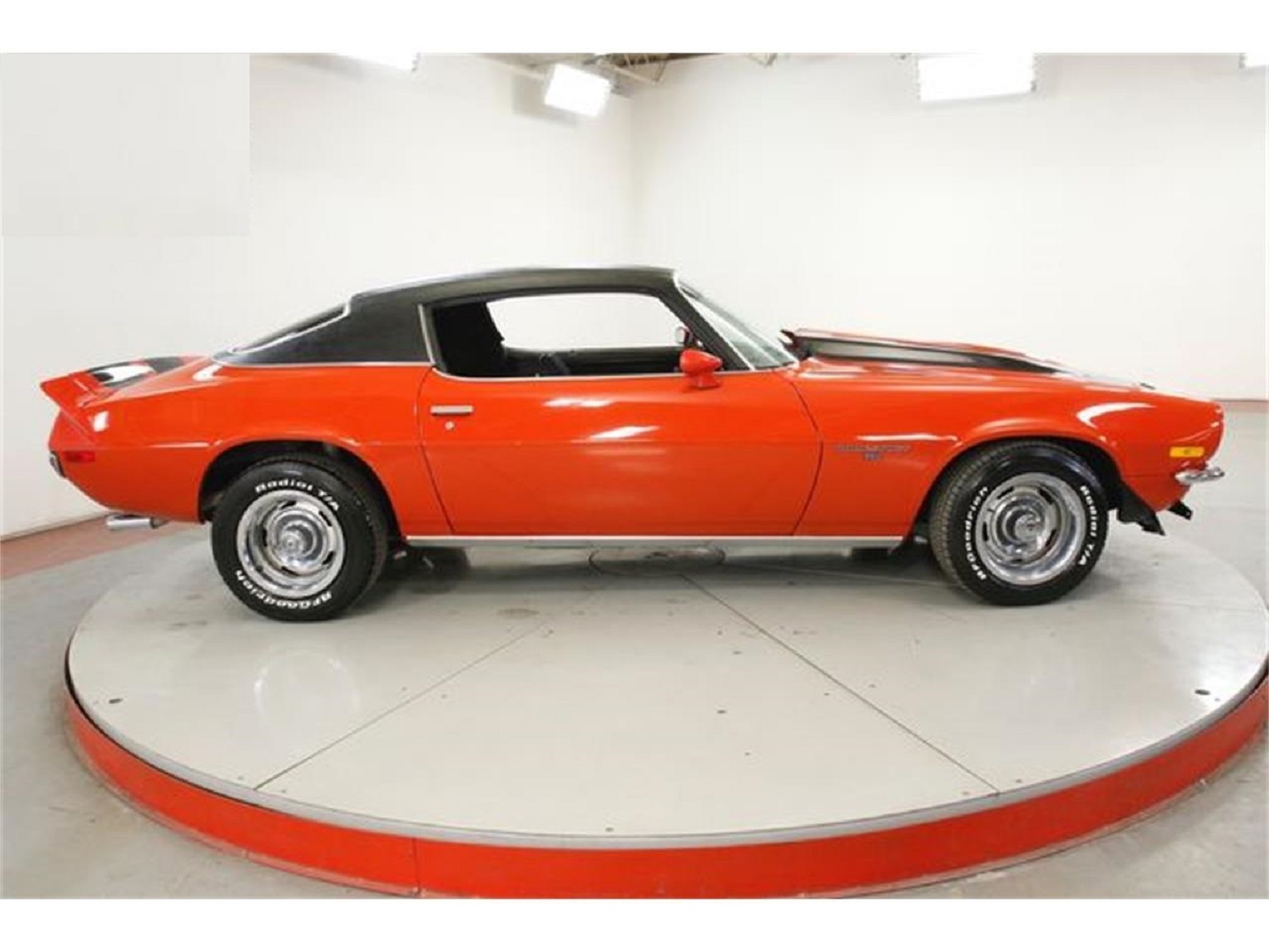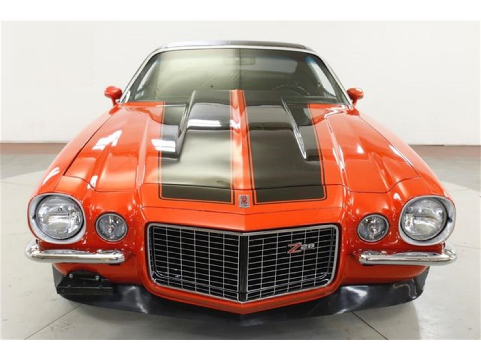 1971 Chevrolet Camaro RS. EXTERIOR: Bright Red Paint, Black Rallye Sport Striping, Rallye Wheels, BFGoodrich Radial Tires, Split Bumper, "Z28" Clone badges. INTERIOR: Matching Gray interior, Front High Back Buckets, Rear Bench, Staple Shift Automatic, RS Steering Wheel. MECHANICAL: 350 CID V8, Automatic Transmission, 4 Barrel Carb, Detroit Posi Rear End, Power Steering, Power Brakes (Front Disc), Factory A/C.