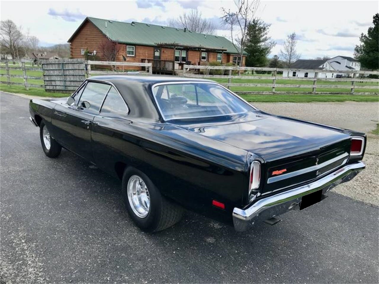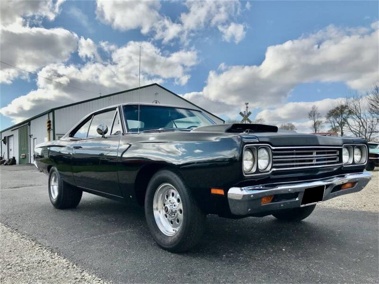 TRUE 69 ROAD RUNNER WITH 4000 MILES SINCE COMPLETED. HAS A 76' 440 ENGINE BORED 30 OVER WITH 6 PACK CRANK AND RODS, FORGED PISTONS, 440 SOURCE HEADS W/ ROLLER ROCKERS, 520 MOPAR PURPLE CAM, EDELBROCK INTAKE WITH 2-600 CFM EDLBROCK CARBS., MOPAR ELECTRONIC IGN. AND HEADERS FLOWING INTO DUAL CHAMBERED MUFFLERS. IT DOES HAVE FRONT DISC BRAKES BUT NO POWER OPTIONS BUT EASY TO STEER. THE TRANS IS A FULLY AUTOMATIC 727 REBUILT AND HAS A 3600 STALL. THAT IS CONNECTED TO A STOUT 8 3/4 REAR END WITH NEW MOSER AXLES AND A 323 POSI. THE BODY - ITS LASER STRAIGHT AND LINES ARE RIGHT ON, EVEN WITH THE 6 PAC FIBERGLASS HOOD. TOP AND BOTTOM PAINTED IN 2 STAGE PPG BLACK. THE PAINT IS FANTASTIC. THE INTERIOR - ALL NEW INSIDE AND NICE.