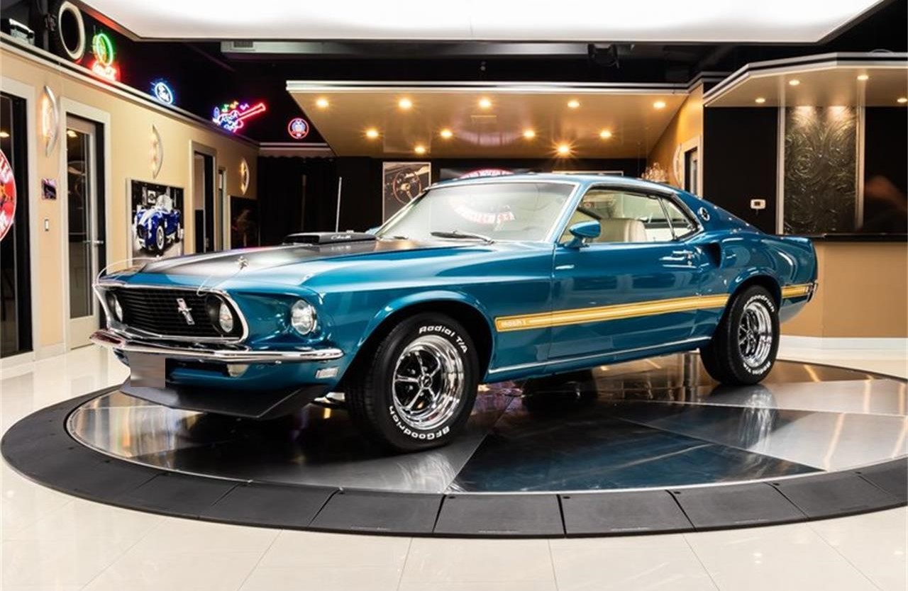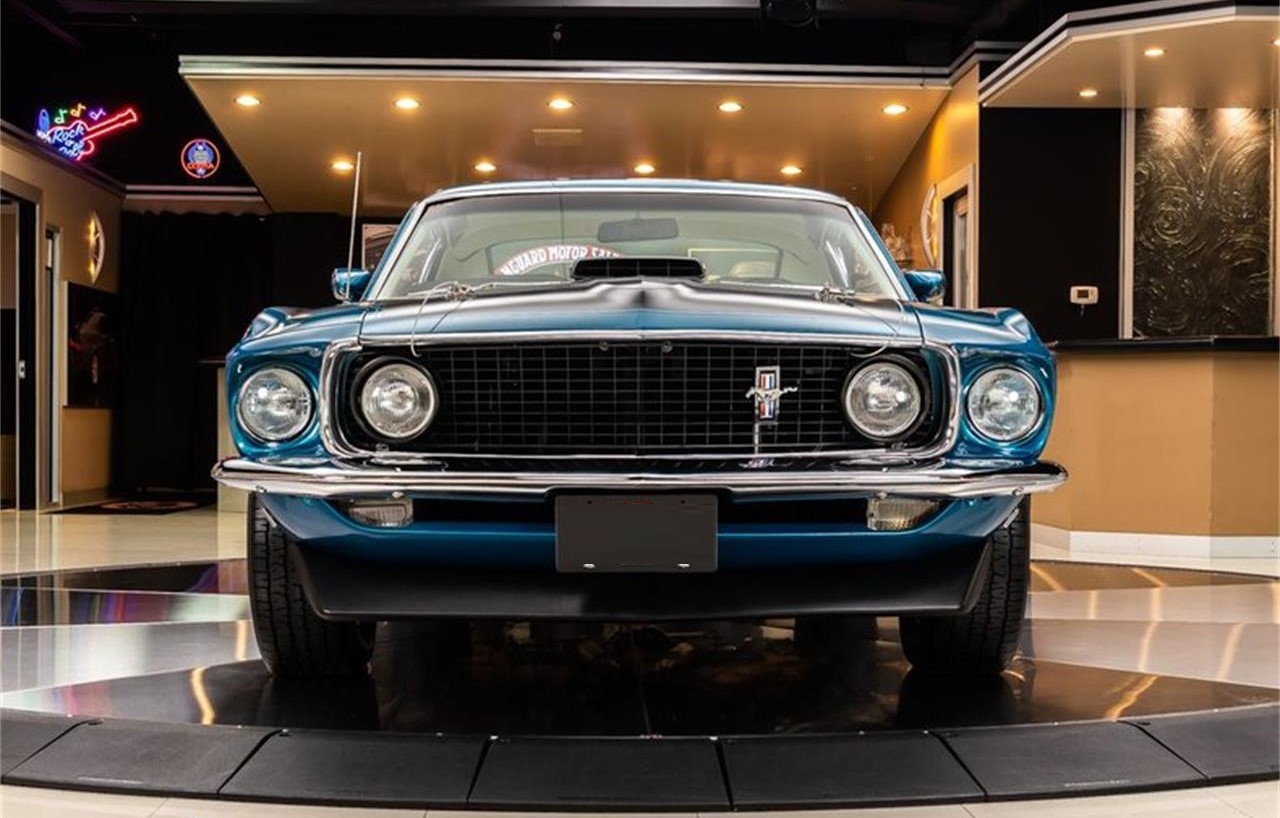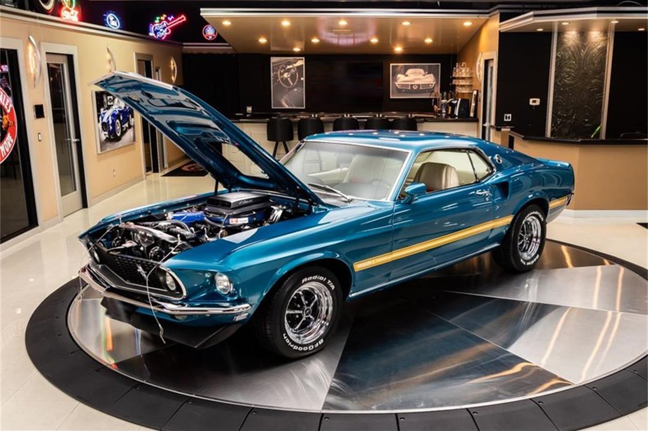 1969 Ford Mustang Fastback Mach 1 R Code. This R Code Mustang has a laser straight body, Acapulco Blue Paint finish, Cream Interior, Mach 1 Decals along the body, Black Hood with Hood Pins, Shaker Hood Scoop, Magnum Wheels, along with Polished Stainless Steel and Chrome Components all over that s sure to turn heads wherever you go.
