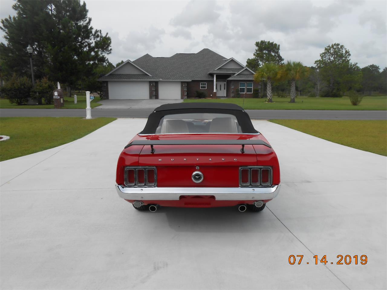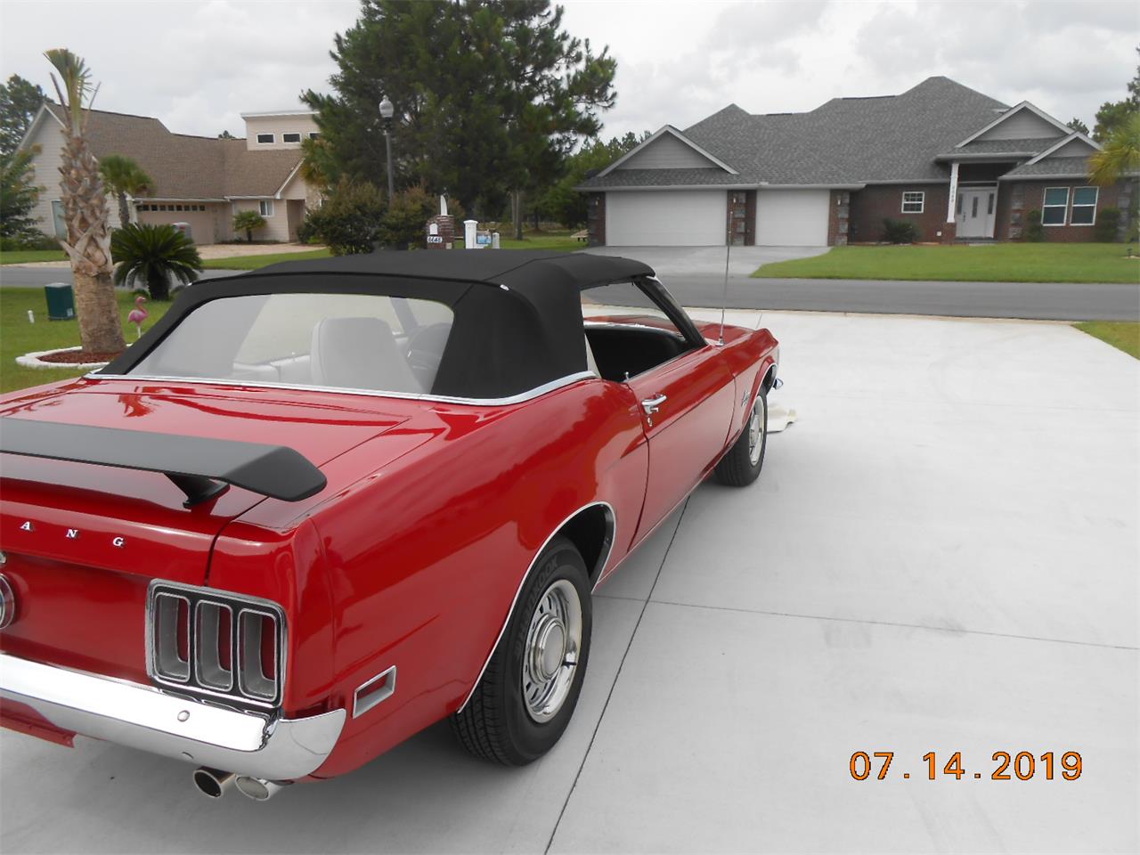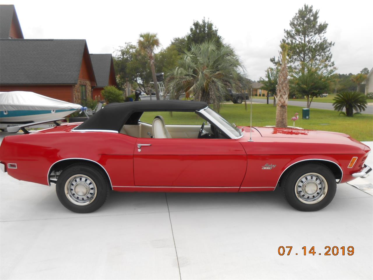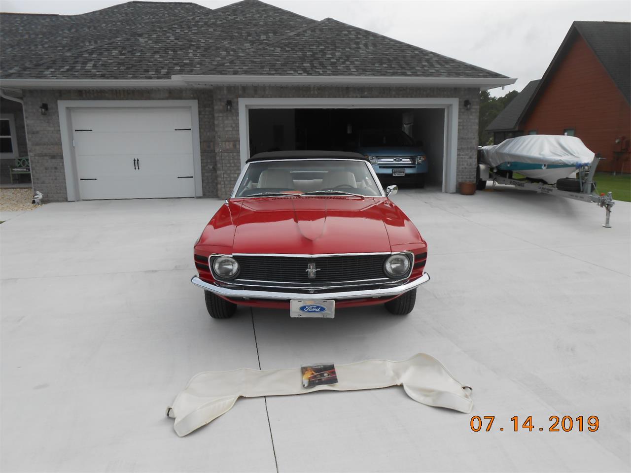 1970 Mustang Convertible with Red exterior and white interior, black soft rebuilt, 351 ci H code, power brakes, power steering, automatic transmission, and styled steel wheels.